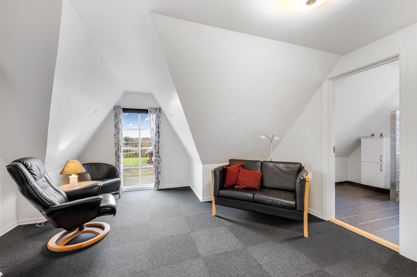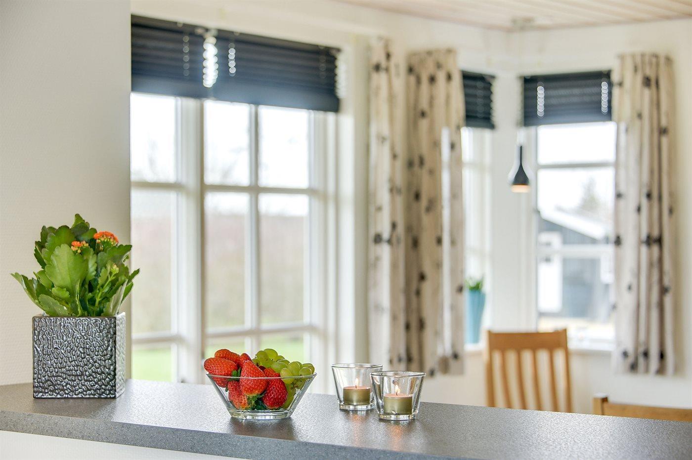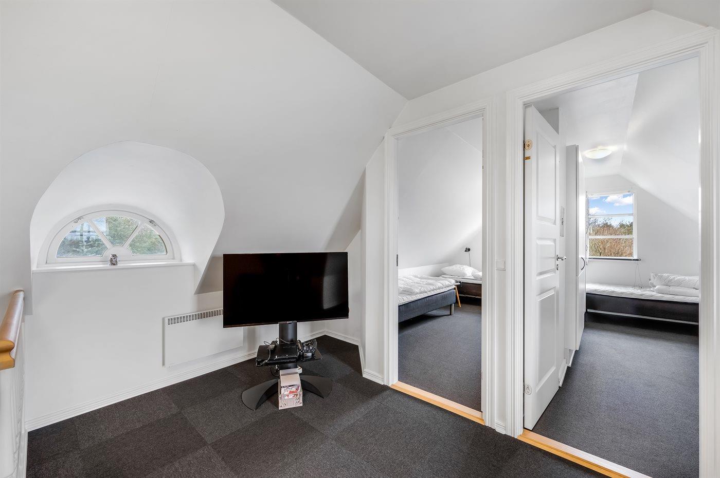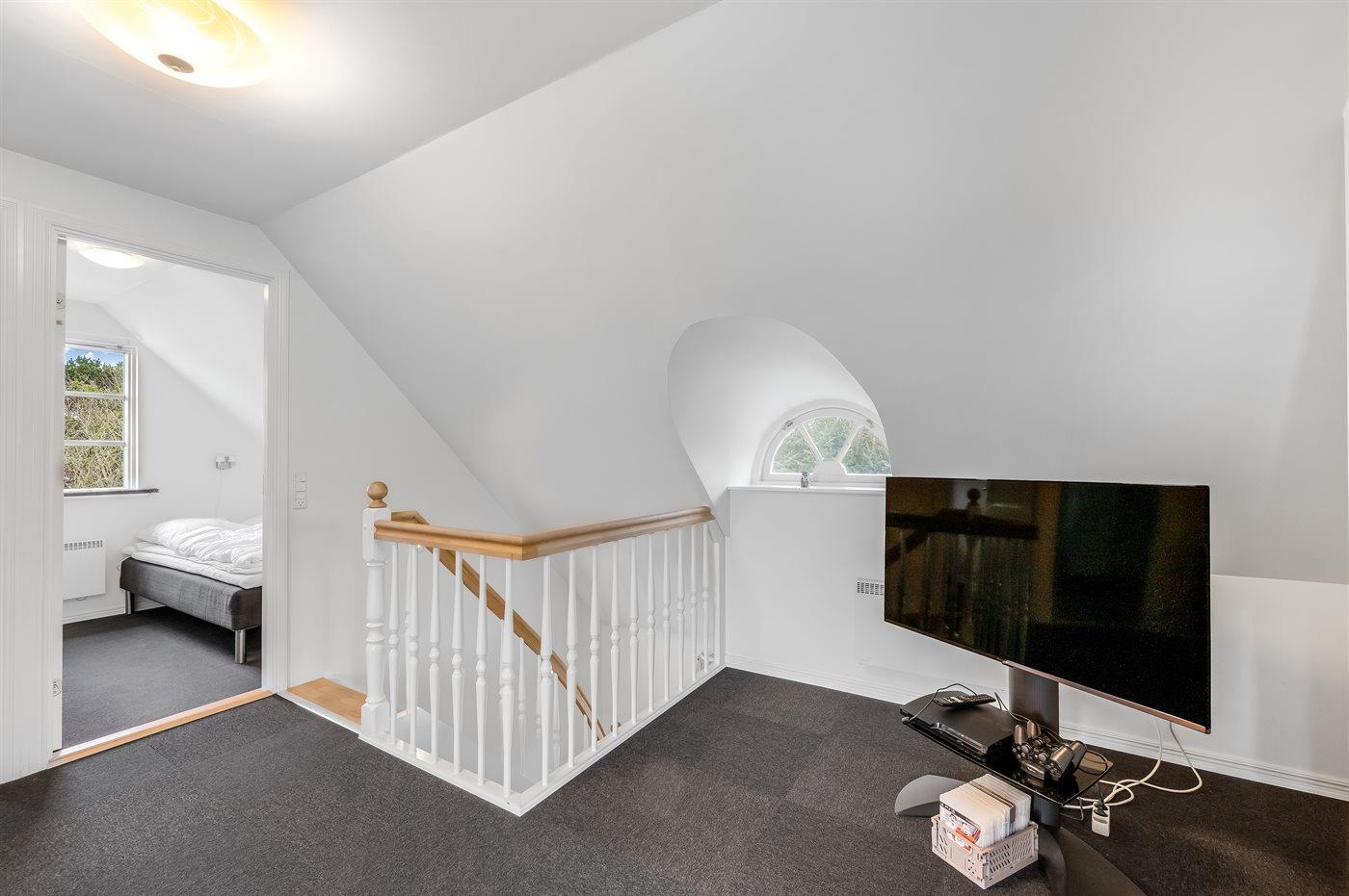 Moderne und gut ausgestattete Küche mit u. a. Herd mit Ceran-Feld und Umluftofen, Mikrowelle, Geschirrspüler und Tiefkühlgerät. Guter Essplatz. Gemütliches Wohnzimmer mit Kaminofen und TV mit digitalem Satellitenanschluss. 1 Zimmer mit Doppelbett. Im Obergeschoss gibt es 3 Zimmer; 1 mit Doppelbett und 2 mit 2 je 2 Einzelbetten. Im Obergeschoss gibt es Badezimmer, eine gemütliche Stube mit zusätzlichem TV (kein Antennenanschluss) und DVD-Spieler sowie Balkon, wo Sie die Aussicht genießen können.