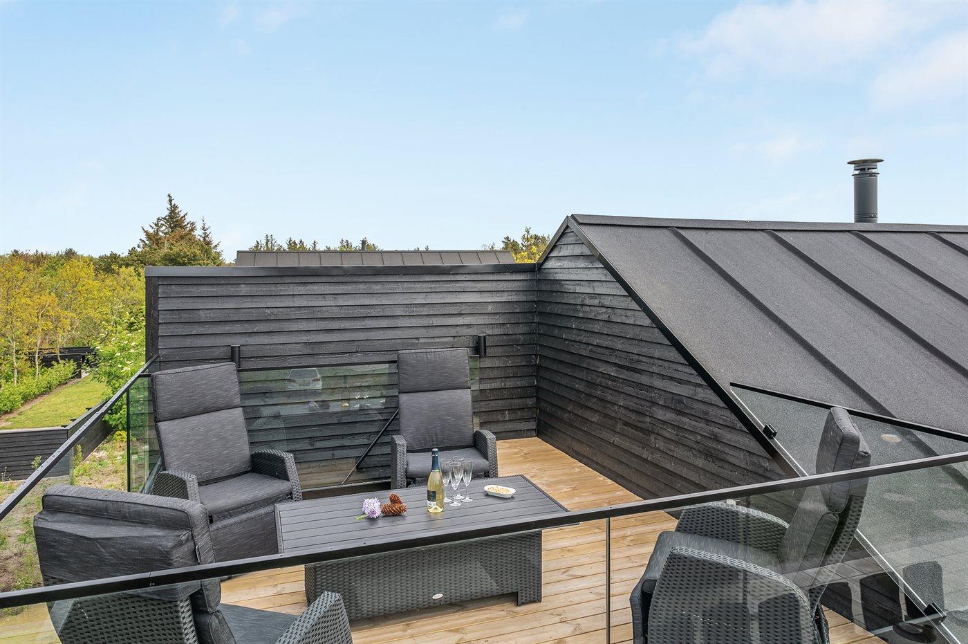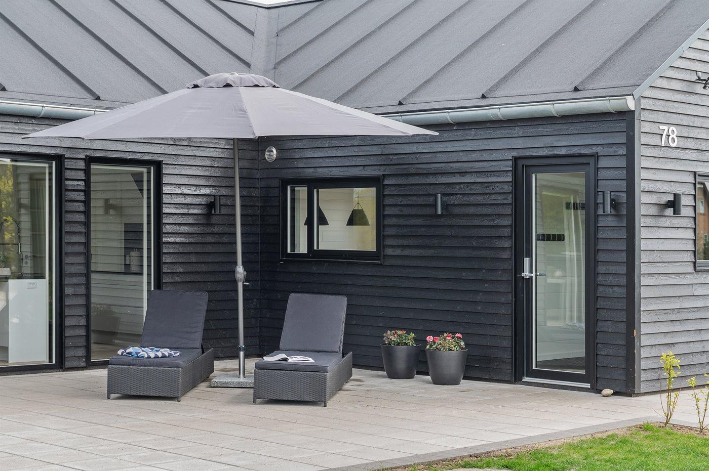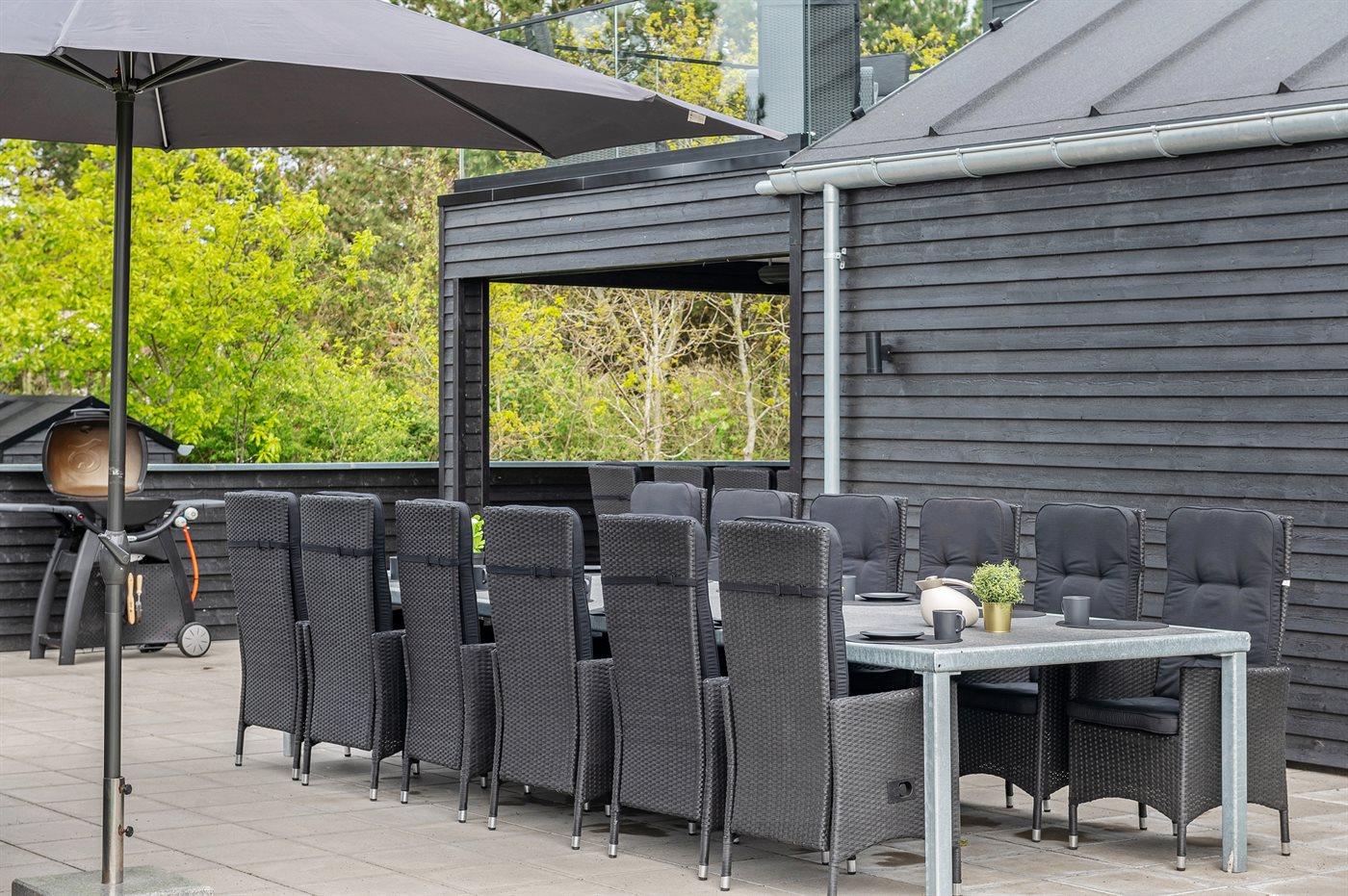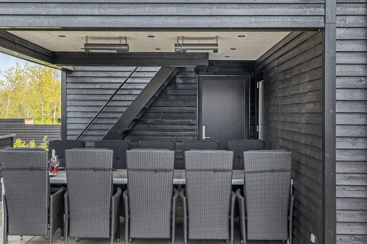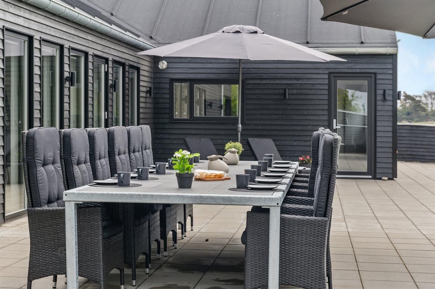 Zum Haus gehören eine 200 m2 große Terrassenfläche, die teilweise von einem Zaun umgeben ist und durch LED-Licht beleuchtet wird sowie eine 16 m2 große überdachte Terrassenfläche mit elektrischem Terrassenheizer. Es stehen 2 Gartentische aus Stahl und Granit mit Platz für 10-12 Personen zur Verfügung sowie Gartenstühle und Sonnenliegen mit Auflagen. Über der überdachten Terrasse liegt die schöne Dachterrasse mit Aussicht auf den Fjord und Loungemöbel. Es steht ferner ein Weber-Gasgrill Q3000 einschließlich Gas zur Verfügung. Ein mit Fliesen ausgelegter Gang führt um das Haus herum. Zugang zu einer von der Sonne beheizten und U-förmigen Außendusche (35 Liter), die mit LED-Licht beleuchtet wird.
