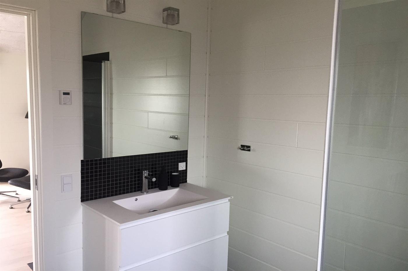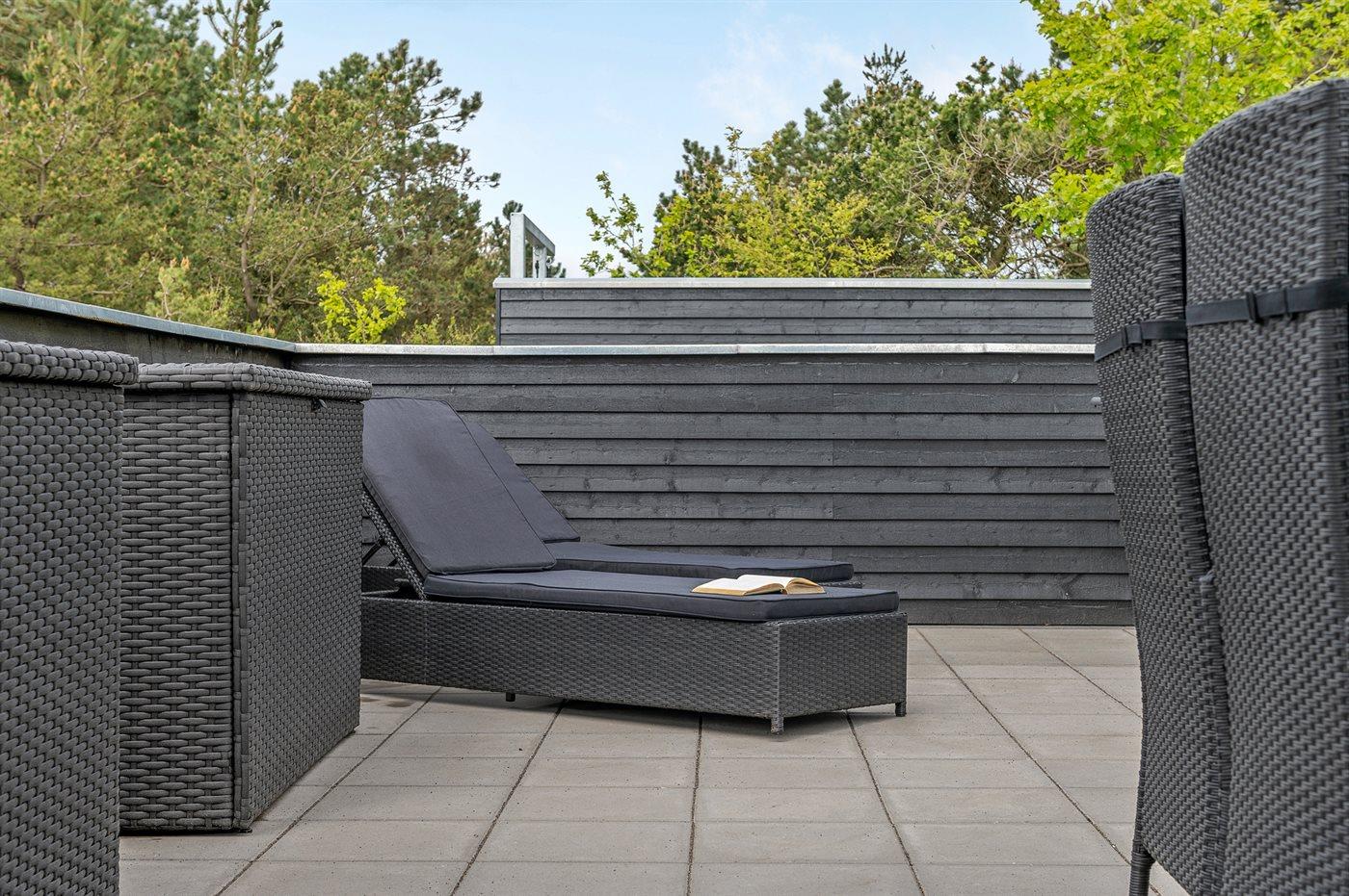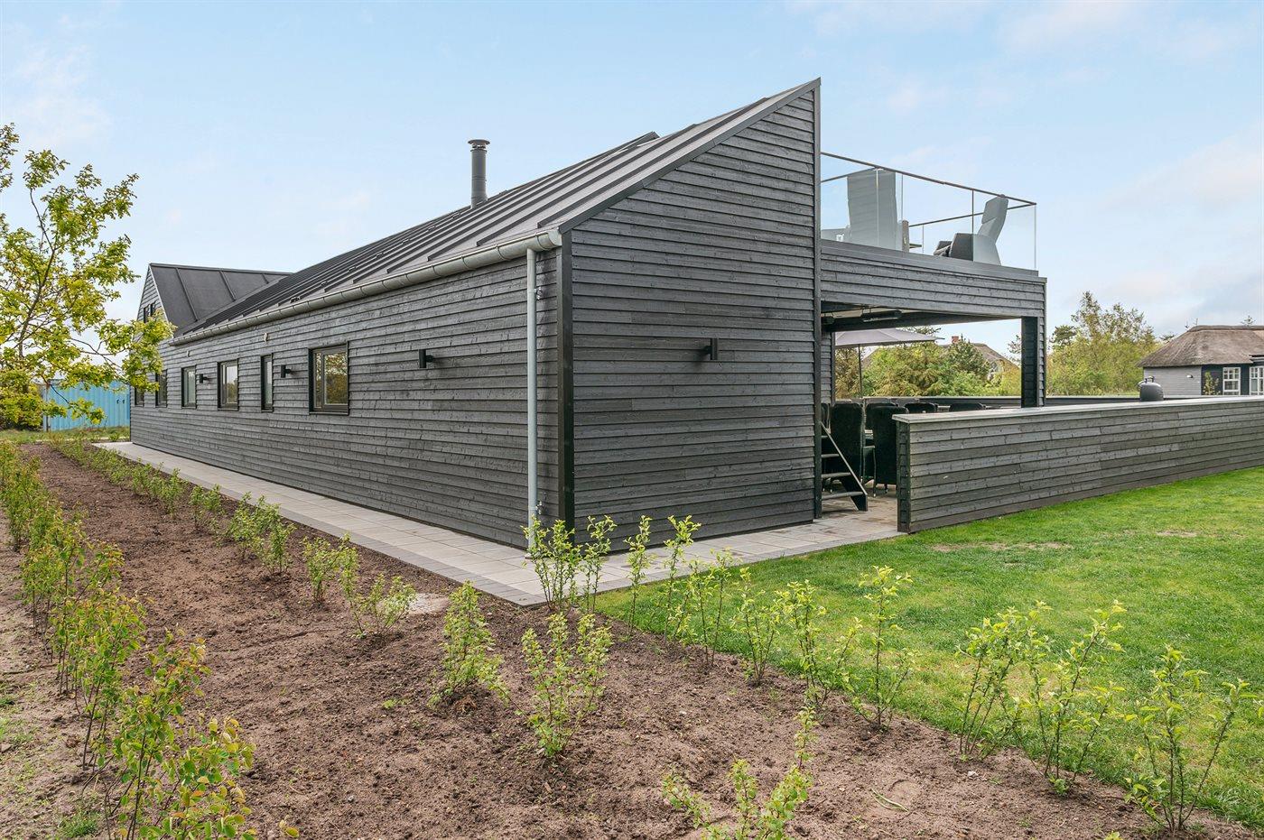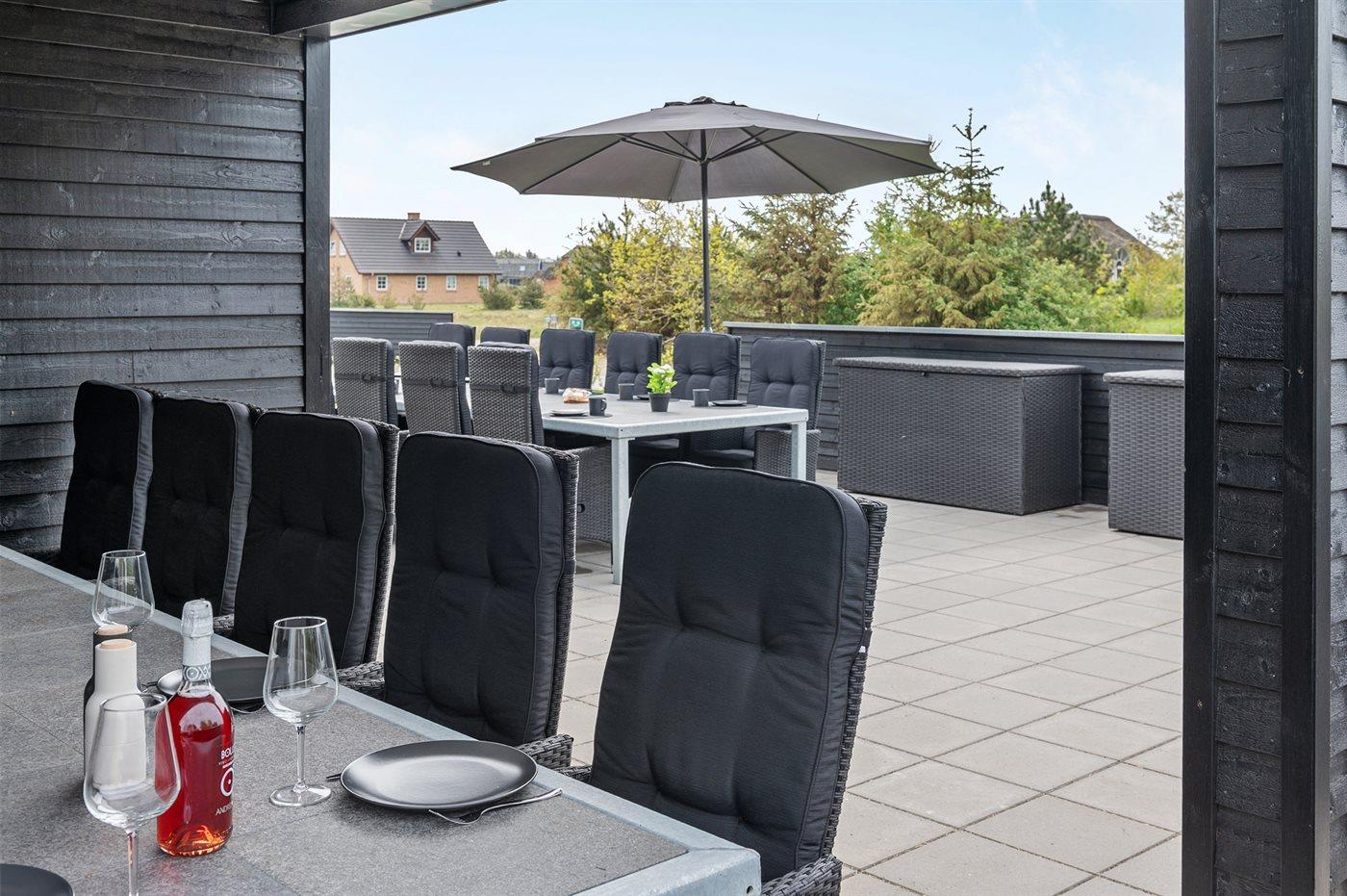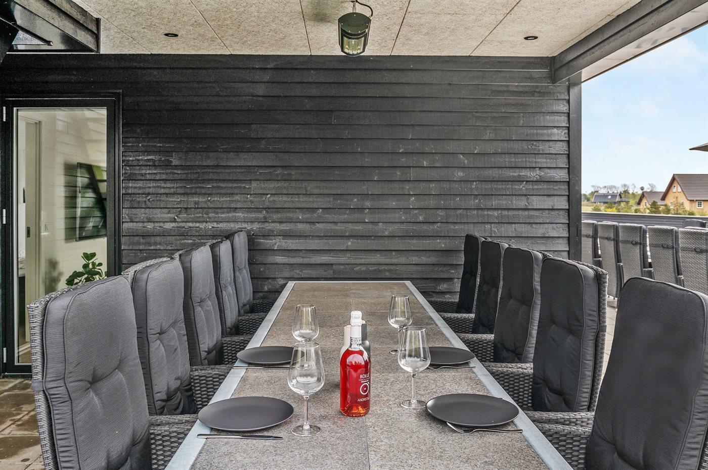 Zum Haus gehören eine 200 m2 große Terrassenfläche, die teilweise von einem Zaun umgeben ist und durch LED-Licht beleuchtet wird sowie eine 16 m2 große überdachte Terrassenfläche mit elektrischem Terrassenheizer. Es stehen 2 Gartentische aus Stahl und Granit mit Platz für 10-12 Personen zur Verfügung sowie Gartenstühle und Sonnenliegen mit Auflagen. Über der überdachten Terrasse liegt die schöne Dachterrasse mit Aussicht auf den Fjord und Loungemöbel. Es steht ferner ein Weber-Gasgrill Q3000 einschließlich Gas zur Verfügung. Ein mit Fliesen ausgelegter Gang führt um das Haus herum. Zugang zu einer von der Sonne beheizten und U-förmigen Außendusche (35 Liter), die mit LED-Licht beleuchtet wird.