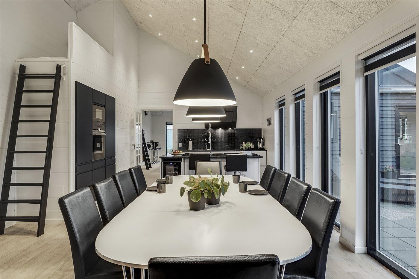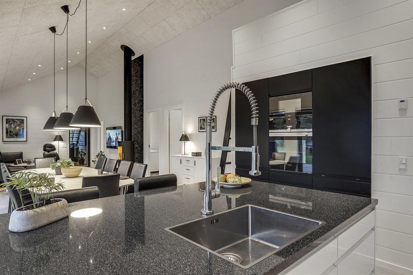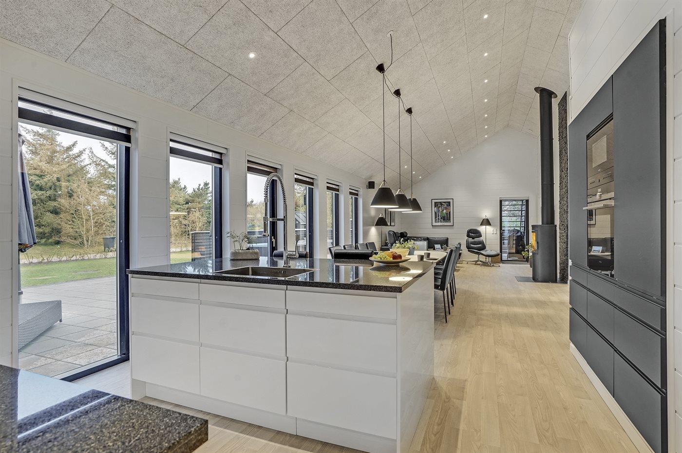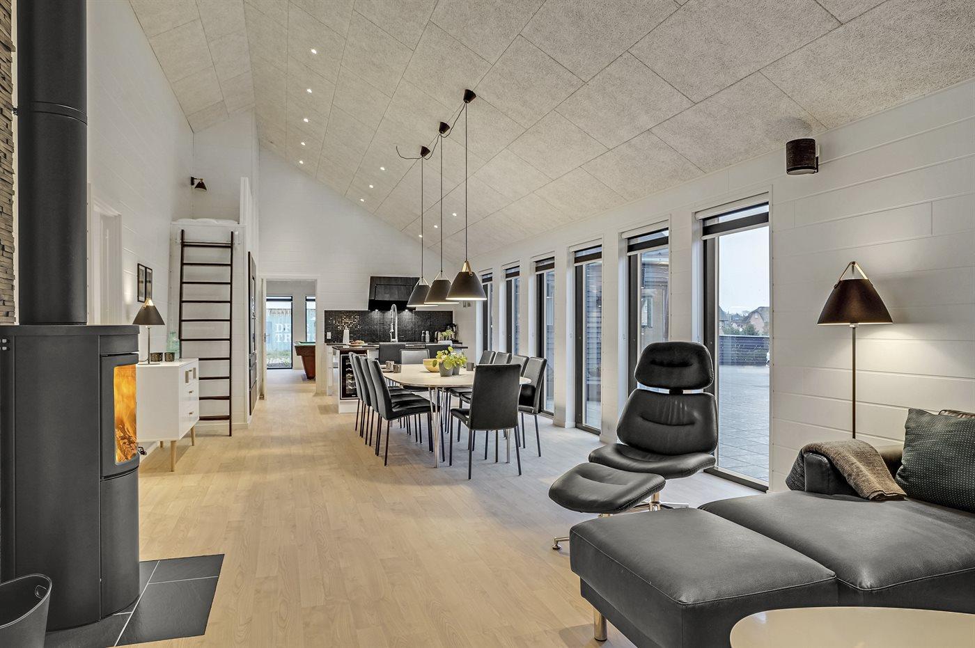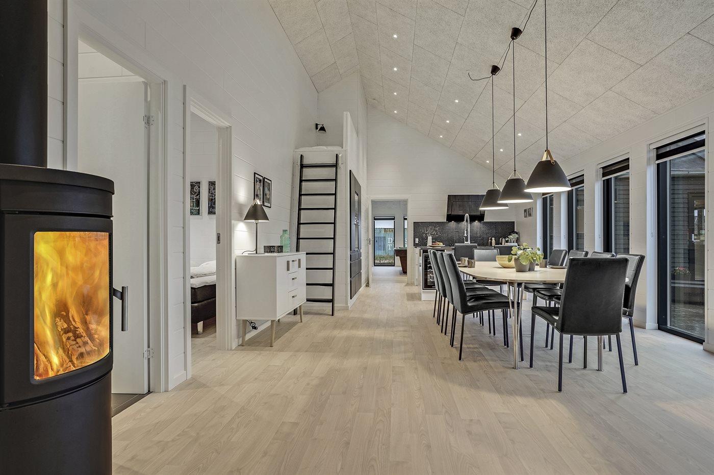 Dieses große, ganz neue Ferienhaus ist 2019 aus gediegenen Qualitätsmaterialien gebaut. Die Einrichtung des Hauses macht es für die große Familie mit Hund oder auch für 2 Familien geeignet, die einen gemeinsamen Urlaub unter ein und demselben Dach verbringen möchten. Das Haus ist mit einem offenen Obergeschoss eingerichtet – hier finden Sie 2 der insgesamt 10 Schlafplätze. Das Ferienhaus eignet sich für 10 Personen sowie 2 Kleinkinder bis zu 3 Jahren. Es ist eine energiesparende Luft-Wasser- Wärmepumpe installiert und alle Räume sind mit Fußbodenheizung versehen. Ferner steht ein Zentralstaubsauger zur Verfügung. Das Ferienhaus hat eine Wohnfläche von 196 m² und wurde 2019 gebaut. Es ist erlaubt 2 Haustiere mitzubringen. Das Ferienhaus liegt auf einem 1180 m² großen Gartengrundstück und die Entfernung zum Fjord beträgt 200 m, zur nächsten Einkaufsmöglichkeit 5.000 m und zu einem Golfplatz 10.000 m.
