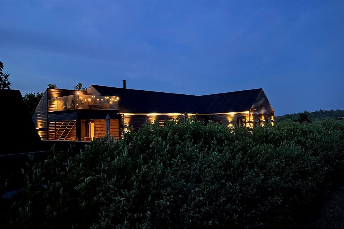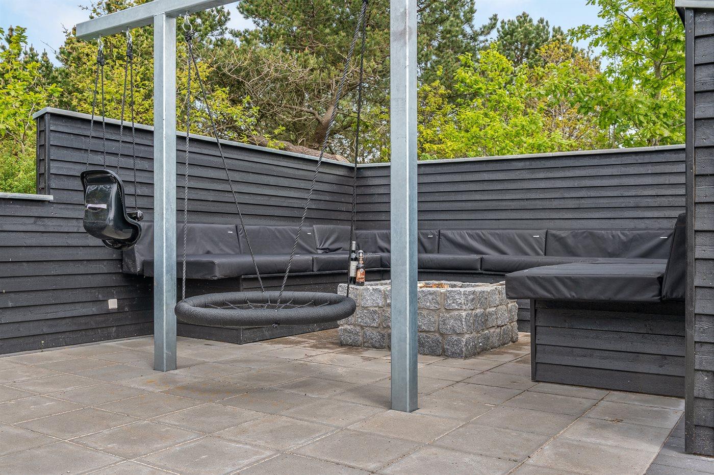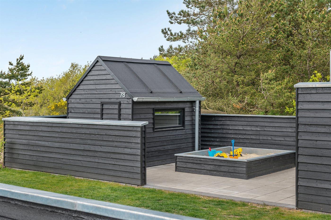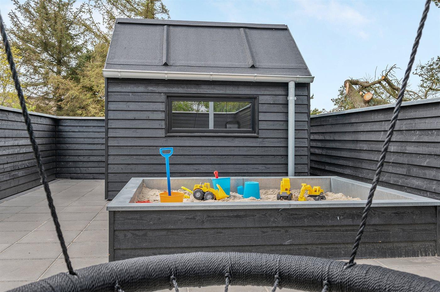 Auf dem Grundstück finden Sie ein 45 m2 großes und mit Fliesen ausgelegtes Spielgelände mit einem großen Sandkasten, Schaukel sowie einem gedämmten Spielhaus, das im gleichen Stil wie das Ferienhaus aufgeführt ist. Ferner gibt es eine Lagerfeuerstelle mit Bänke sowie eine Sinnesschaukel. Das Spielgelände ist von einem Zaun in 2 höhen und mit LED-Licht umgeben.