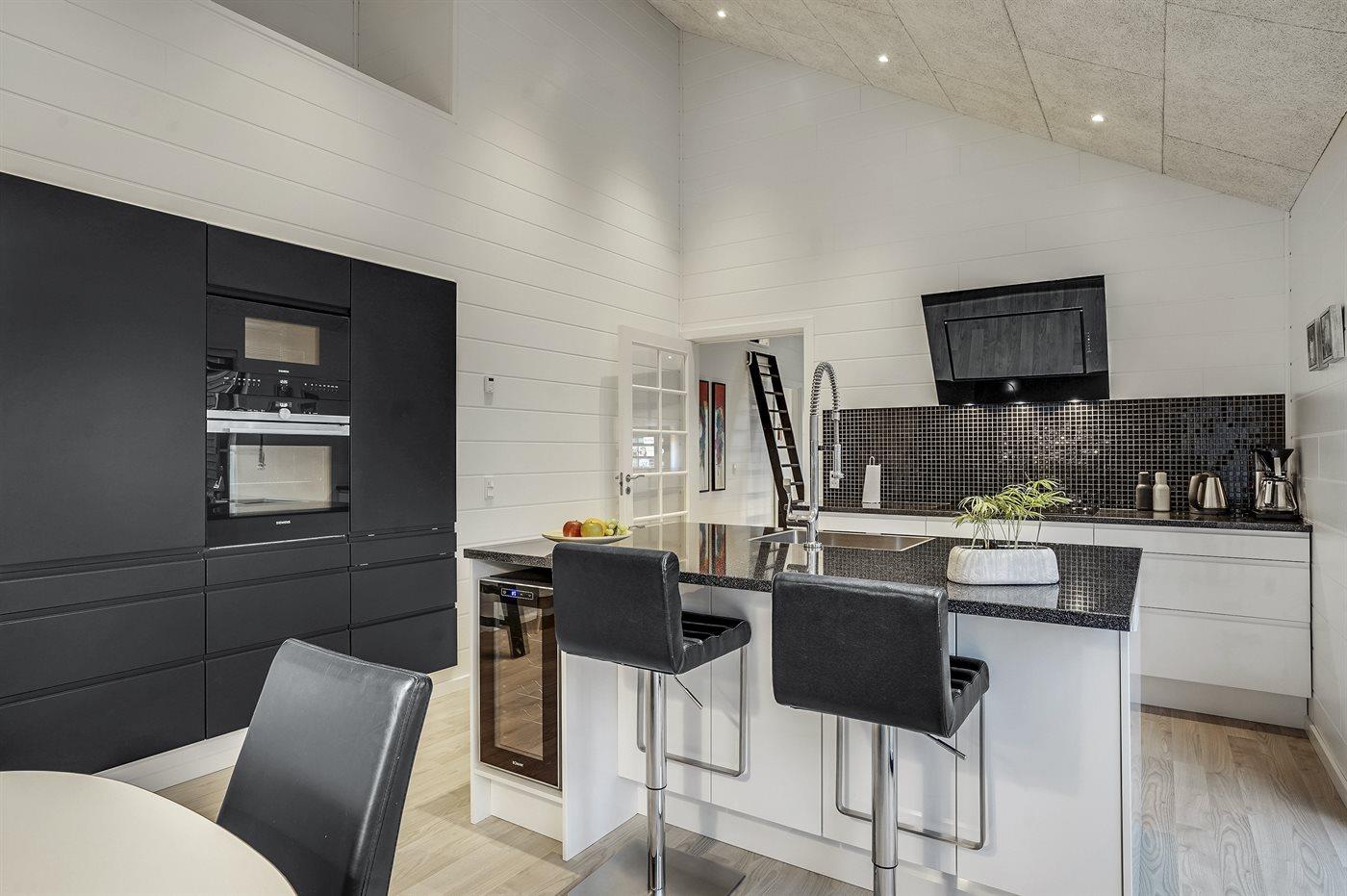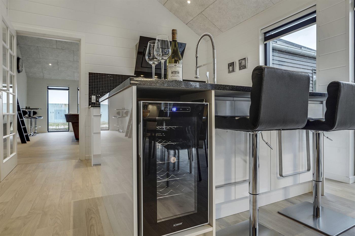 Die Küche ist mit Kühlschrank, Weinkühlschrank für 18 Flaschen Wein, Induktionskochfeld mit 4 Kochmulden, Umluftofen, Kombi-/Mikrowelle sowie Geschirrspüler ausgestattet.
