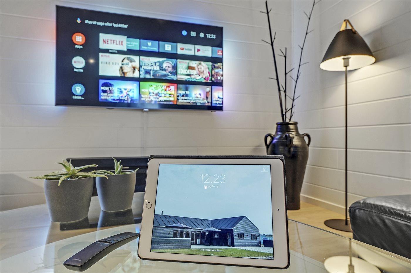Das Ess-/Wohnzimmer ist mit einer Essgruppe für 12 Personen, einer großen Sitzgruppe, 65” Fernseher mit Smart-TV und Chromecast sowie Bluetooth gesteuerte SONOS Lautsprecher eingerichtet. Ferner stehen 2 Ipads zur Verfügung.