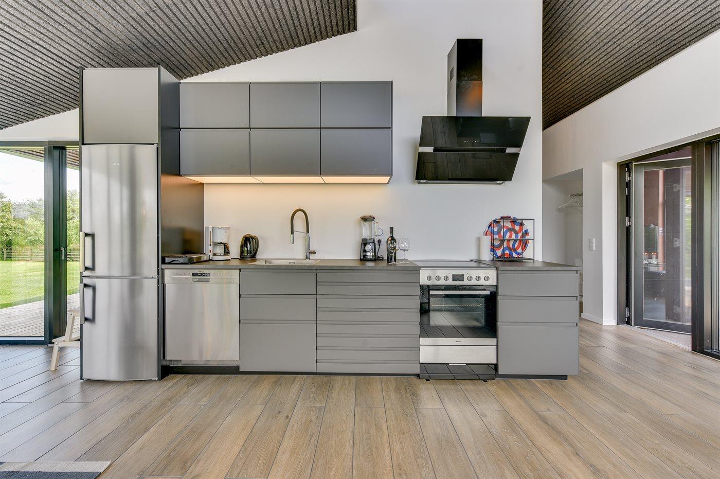Die Küche ist mit Kühlschrank ausgestattet. Außerdem gibt es 4 Keramik-Kochfelder, Umluftofen, Mikrowelle sowie Geschirrspüler.