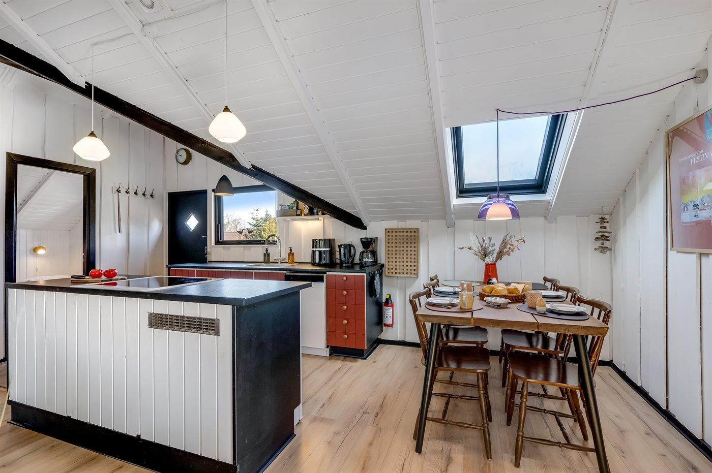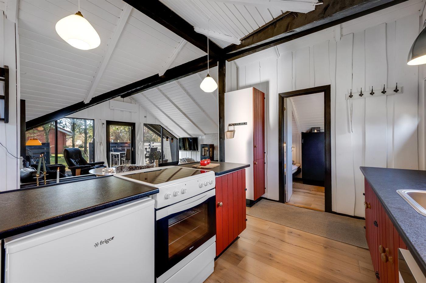 Die Küche ist mit Kühlschrank ausgestattet. Außerdem gibt es 4 elektrische Kochplatten, Umluftofen, Mikrowelle und Airfryer. sowie Geschirrspüler.