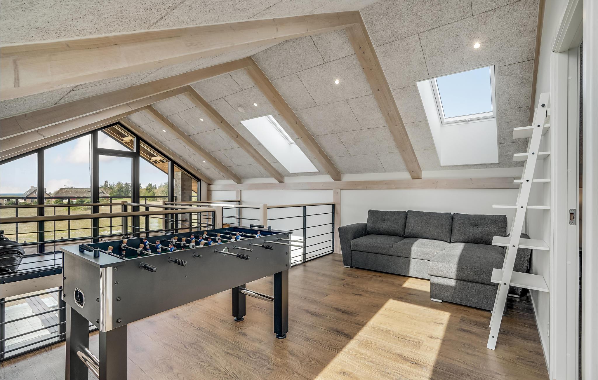Verbringen Sie Ihren Familienurlaub in diesem besonderen Ferienhaus.. Zum Wasser hin mit großen Fenstern ausgerichtet, bietet Ihnen das Innere lichtdurchflutete Räume mit modernen Elementen und komfortablen Möbeln. Im Erdgeschoss haben Sie viel Platz, um gemeinsam zu spielen oder es sich am Abend mit Popcorn und einem guten Film auf dem Sofa bequem zu machen. Entdecken Sie auch den Aktivitätsraum mit Darts und Airhockey oder spielen Sie Tischfußball .