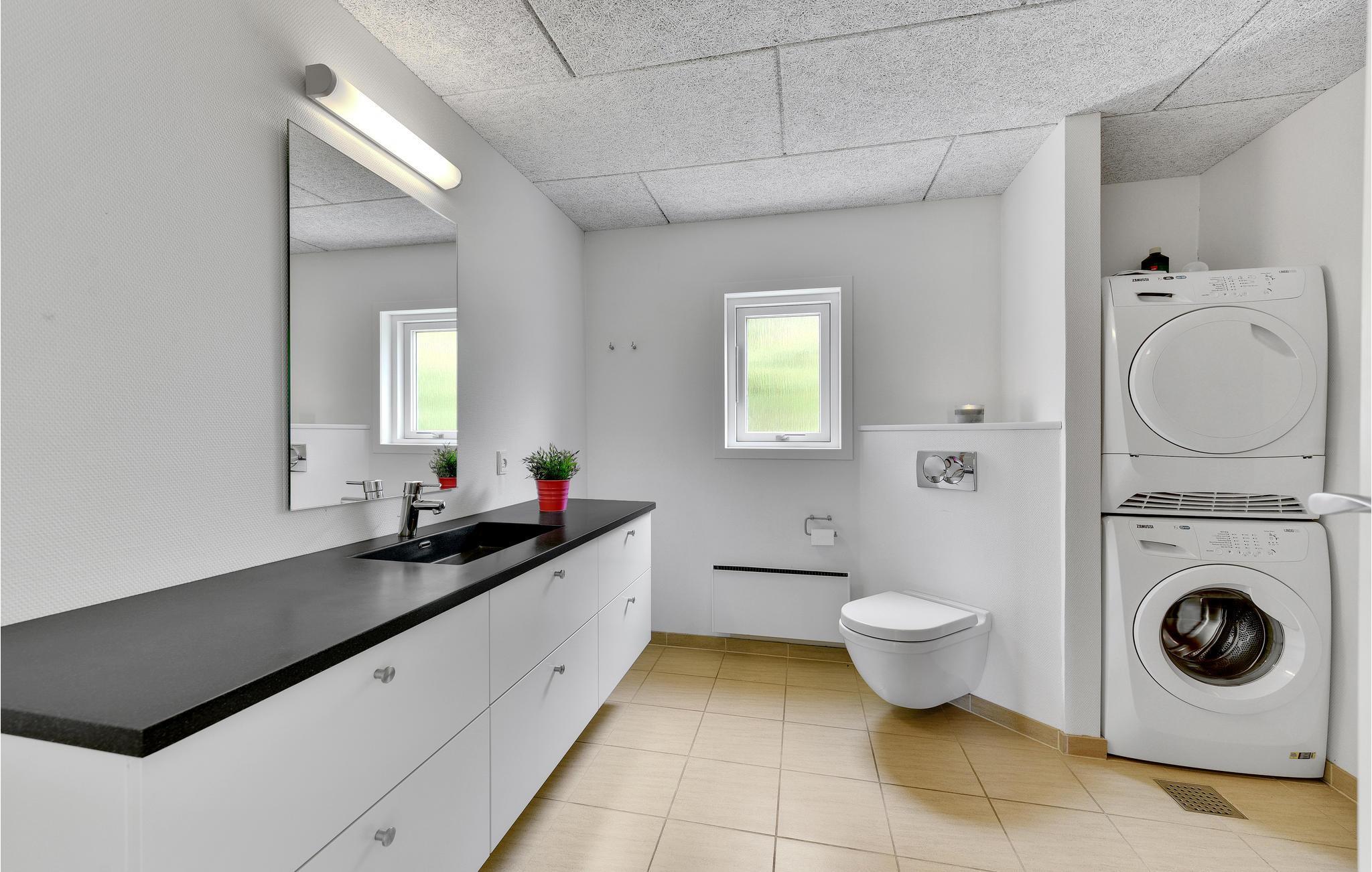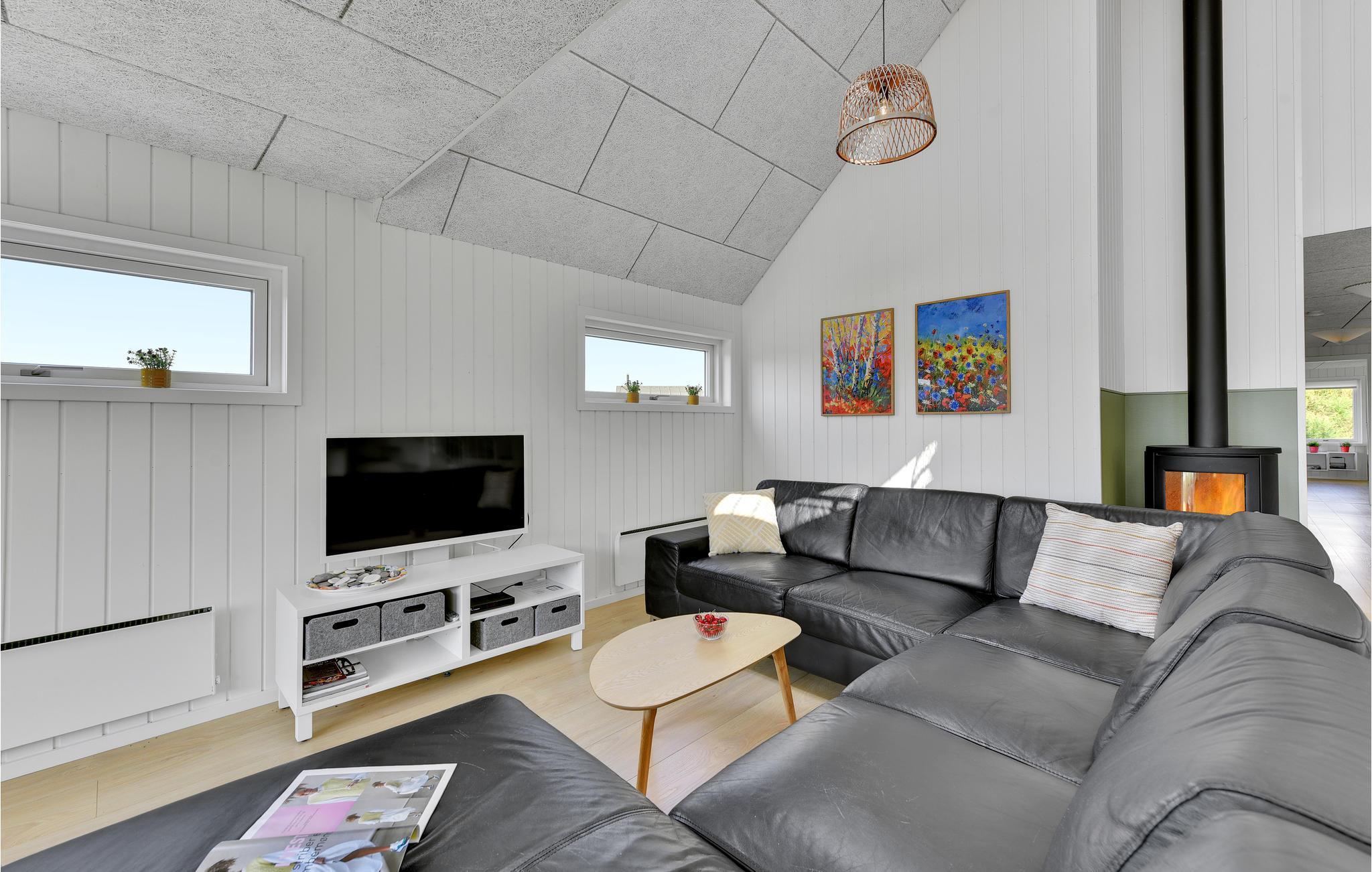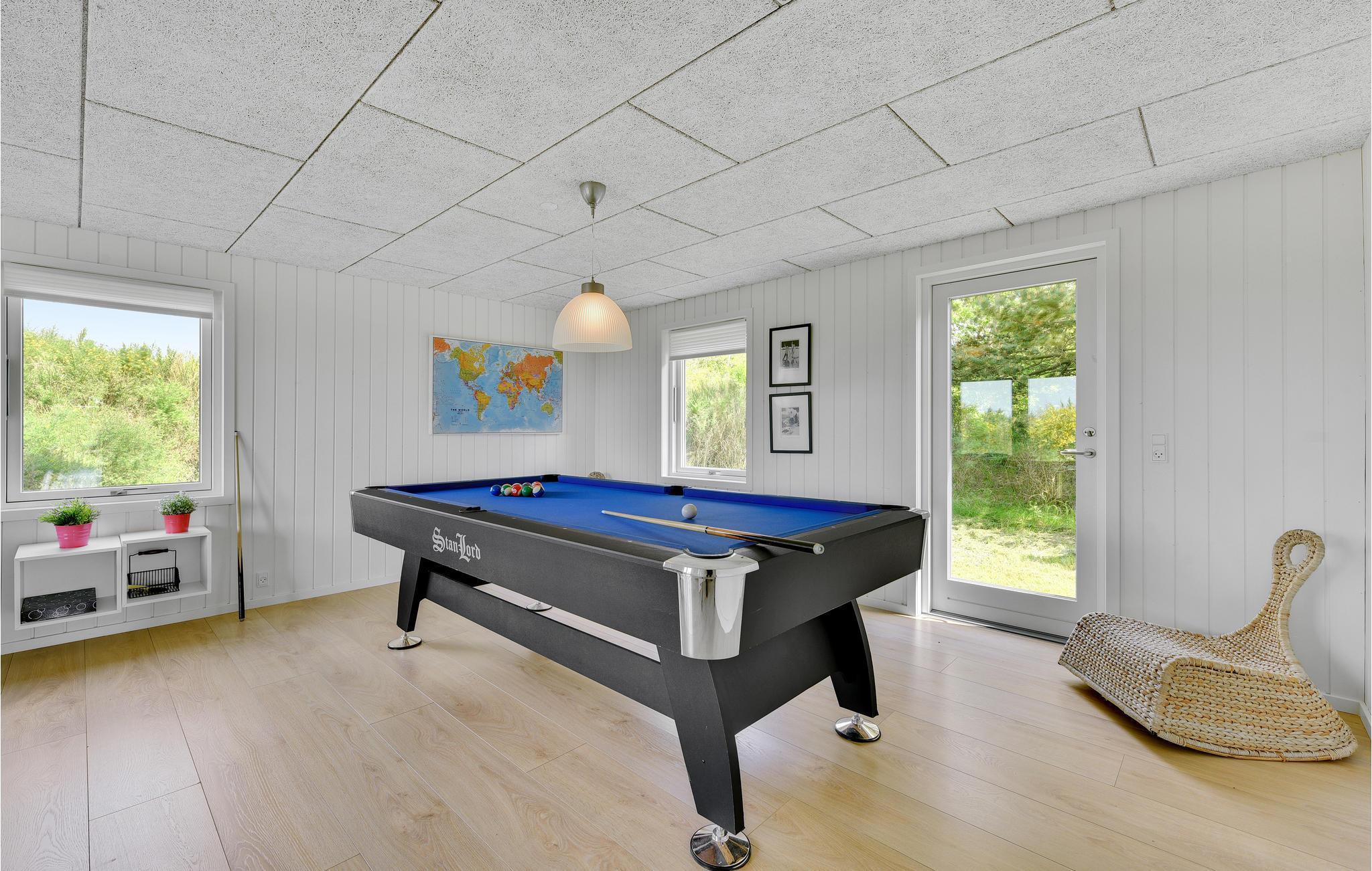 In fantastischer Lage finden Sie dieses Ferienhaus, das in ruhiger Umgebung in der Nähe des Ringkøbing Fjord und dem Ort Stauning liegt. Das Haus enthält alles, was zu einem erholsamen Urlaub dazu gehört. Das Haus hat zwei Badezimmer, in einem davon befindet sich eine Sauna. Das Herzstück des Hauses ist die große, sehr schön helle Wohnküche, wo Sie auch eine Sofaecke vor dem großen Flachbildschirmfernseher genießen können, während das Feuer im Kaminofen knistert. Von hier gelangen Sie auf die große überdachte Terasse und auf die offene Terasse. Das Haus hat drei gute Schlafzimmer, die in der Mitte des Hauses liegen, und am entgegengesetzen Ende der Wohnküche befindet sich der Lieblingsteil von Kindern, der Aktivitätsraum mit Billardtisch und einem Flachbildschirm. Hier können Sie viele Stunden mit Duellen und Turnieren verbringen (in diesem Raum steht auch ein Schlafsofa). Im ersten Stock liegt ein kleines Wohnzimmer mit Zugang zu einer schönen Terasse mit fantastischem Ausblick auf den Ringkøbing Fjord.
