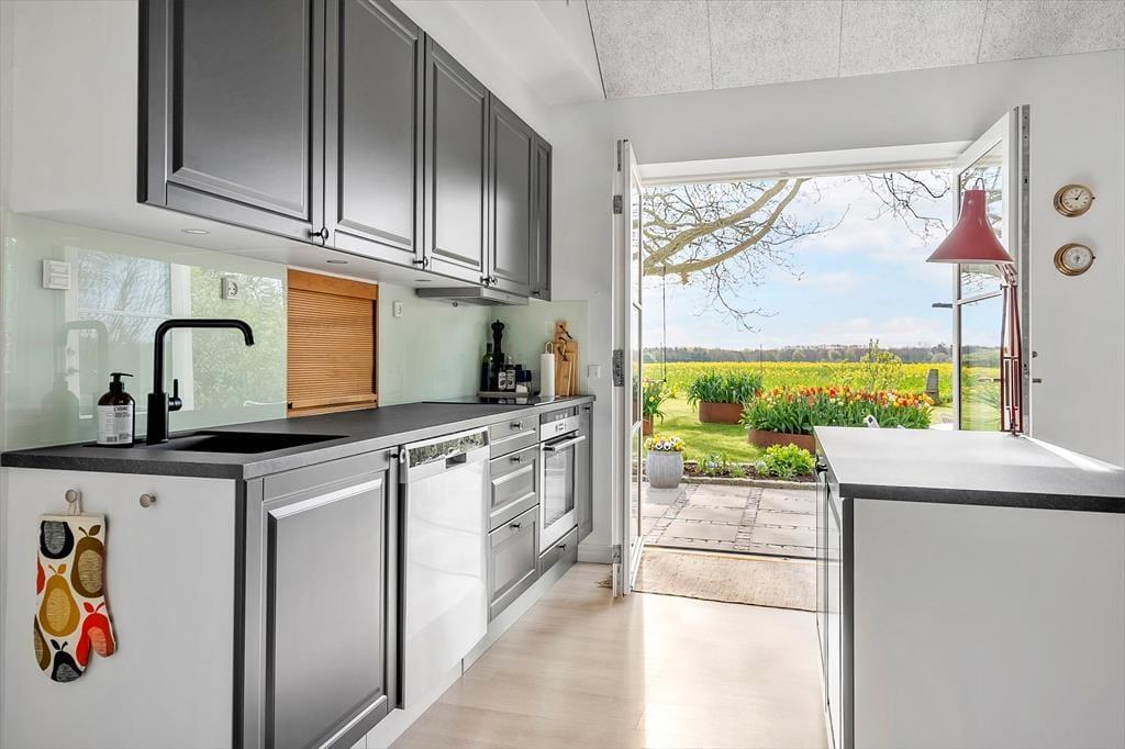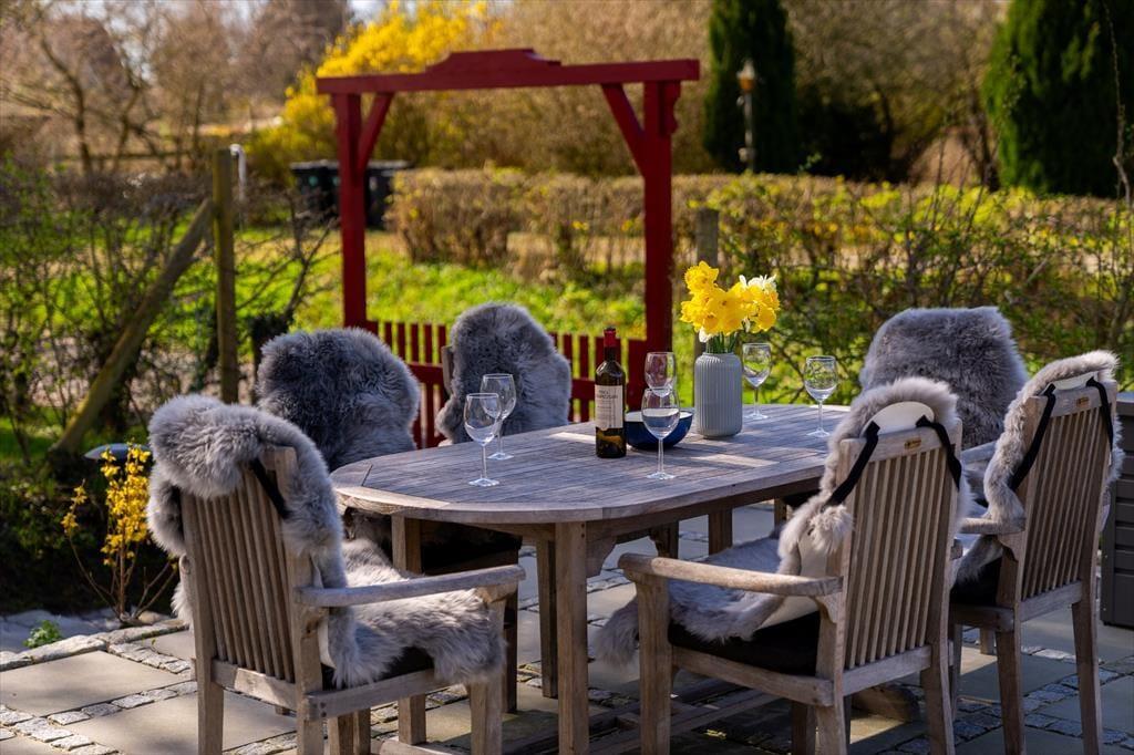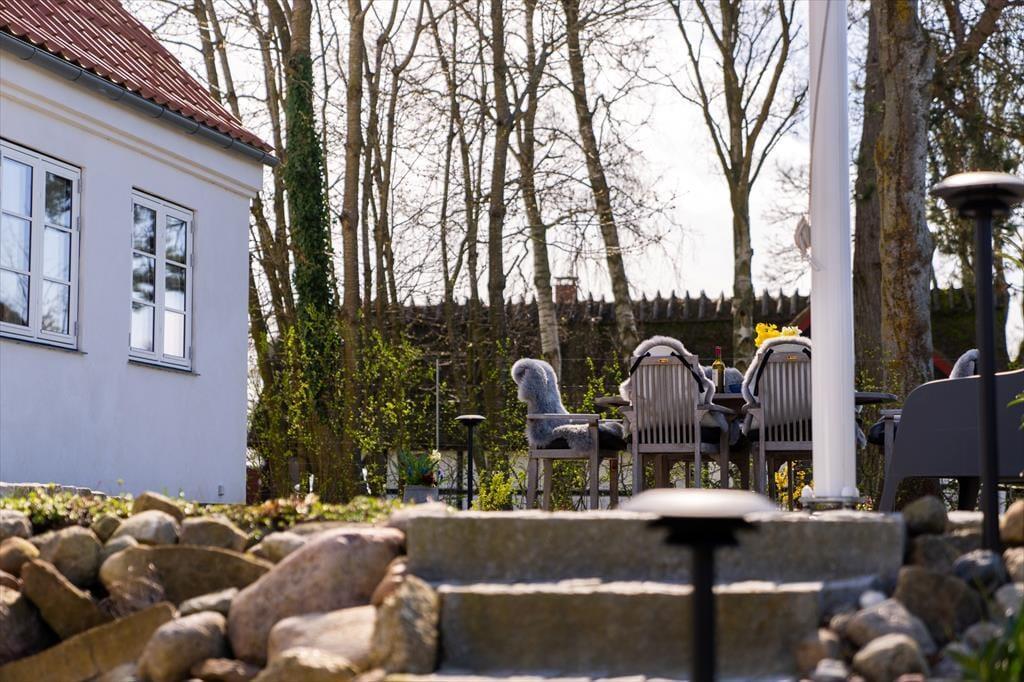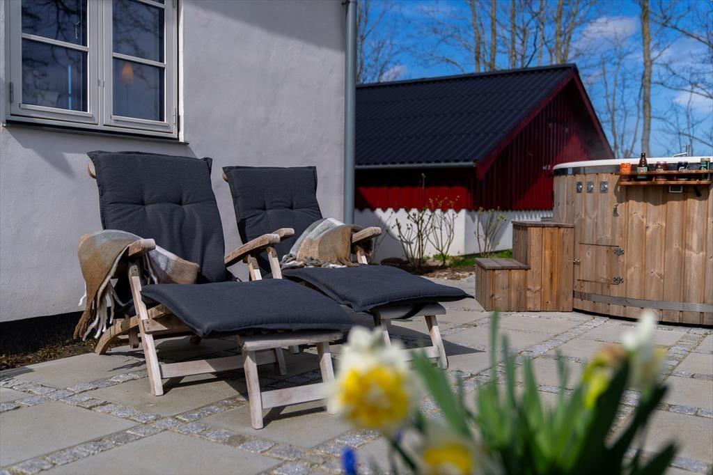 Von der Wohnküche gelangen Sie direkt auf eine schöne geflieste Terrasse mit Blick über Felder und Wald. Die Terrasse ist ideal, wenn Sie die warmen Tage und lauen Abende genießen möchten. Auf der Terrasse gibt es auch ein Wildnisbad, wo Sie sitzen und in den Sternenhimmel schauen und die Stille bei einem Glas Wein genießen können. Der Garten hat schöne alte Bäume und blickt auf Felder mit einer sehr schönen Aussicht auf den Waldrand. Die Eigentümer Anders und Rikke können vorbeikommen und die Gartenpflege übernehmen. In diesem Fall stimmen sie sich natürlich mit den Gästen im Haus ab.