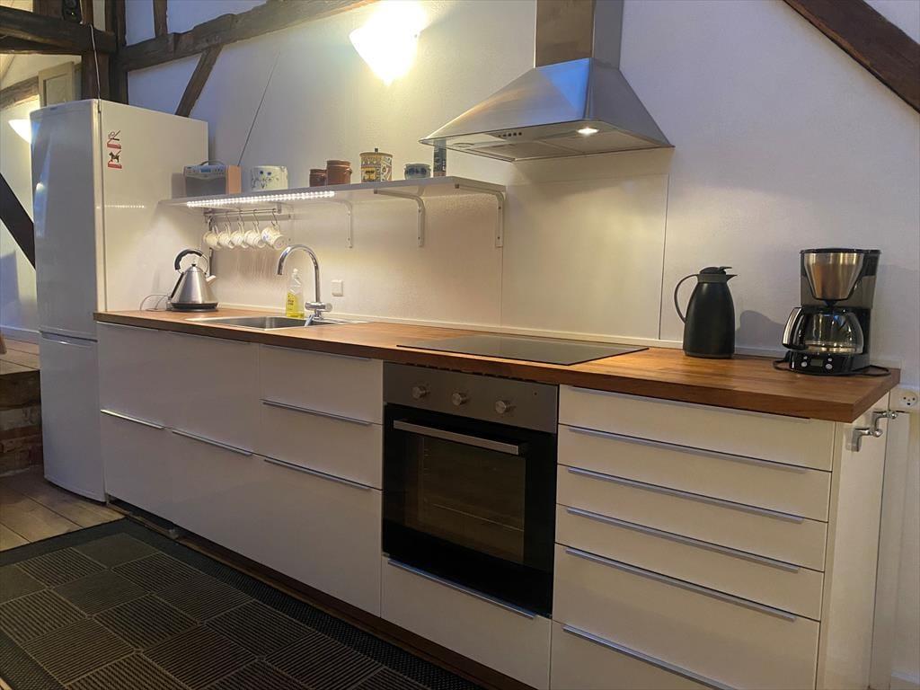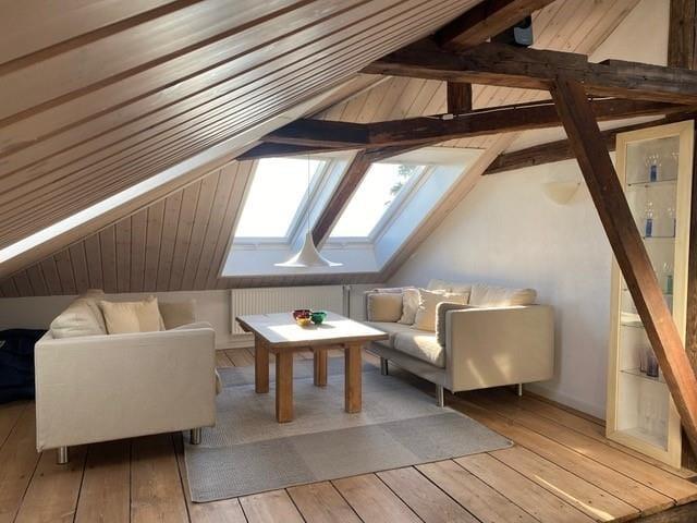 Sie betreten die Ferienwohnung im Hinterhaus über eine eigene Außentreppe. Die Wohnung empfängt Sie mit einem traumhaft schönen, alten und überaus gemütlichen Holzfußboden und offen liegenden, alten Deckenbalken. Die Wohnfläche besteht aus einem tollen, großen und offenen Raum mit einer Grundfläche von 60 m².