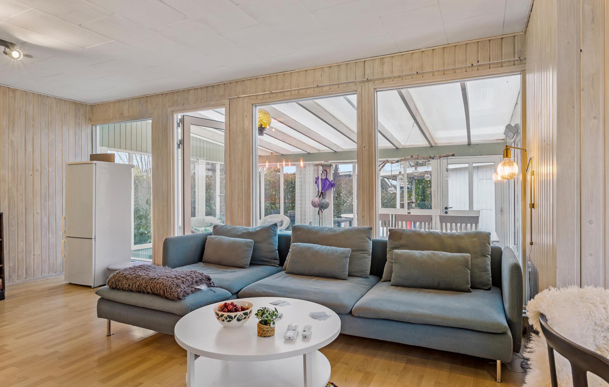 Erleben Sie eine erholsame Auszeit in Ihrem liebevoll eingerichteten Ferienhaus auf der Insel Tåsinge. Die ruhige Lage und die Nähe zur Natur machen diesen Ort ideal für einen entspannten Urlaub. Betreten Sie das lichtdurchflutete Haus und fühlen Sie sich sofort wohl. Der offene Wohnbereich mit seinen großen Fenstern sorgt für eine freundliche Atmosphäre. Machen Sie es sich auf dem gemütlichen Sofa bequem und genießen Sie einen entspannten Filmabend vor dem Kaminofen. Nutzen Sie die Küche, um gemeinsam leckere Mahlzeiten zuzubereiten. Am Esstisch oder im Wintergarten, beide mit Blick in den Garten, können Sie in geselliger Runde speisen.