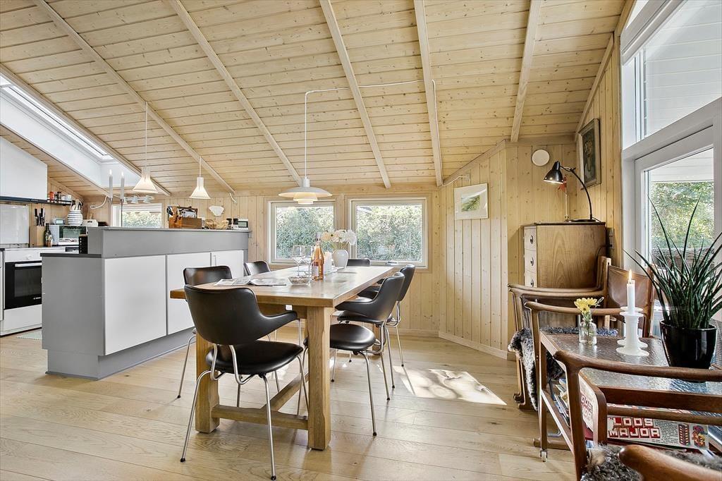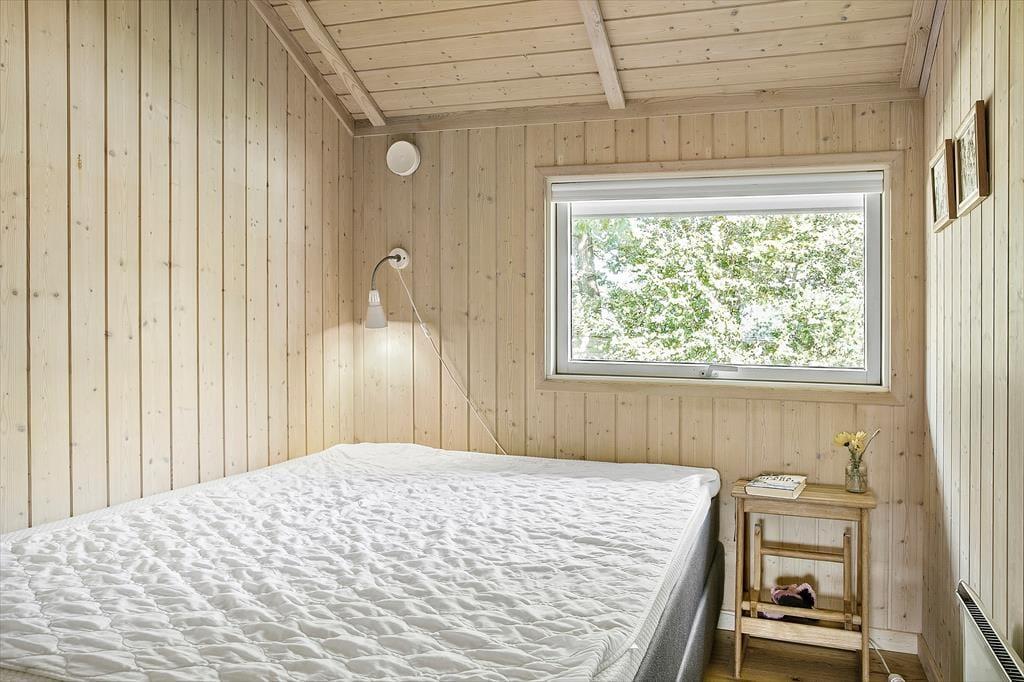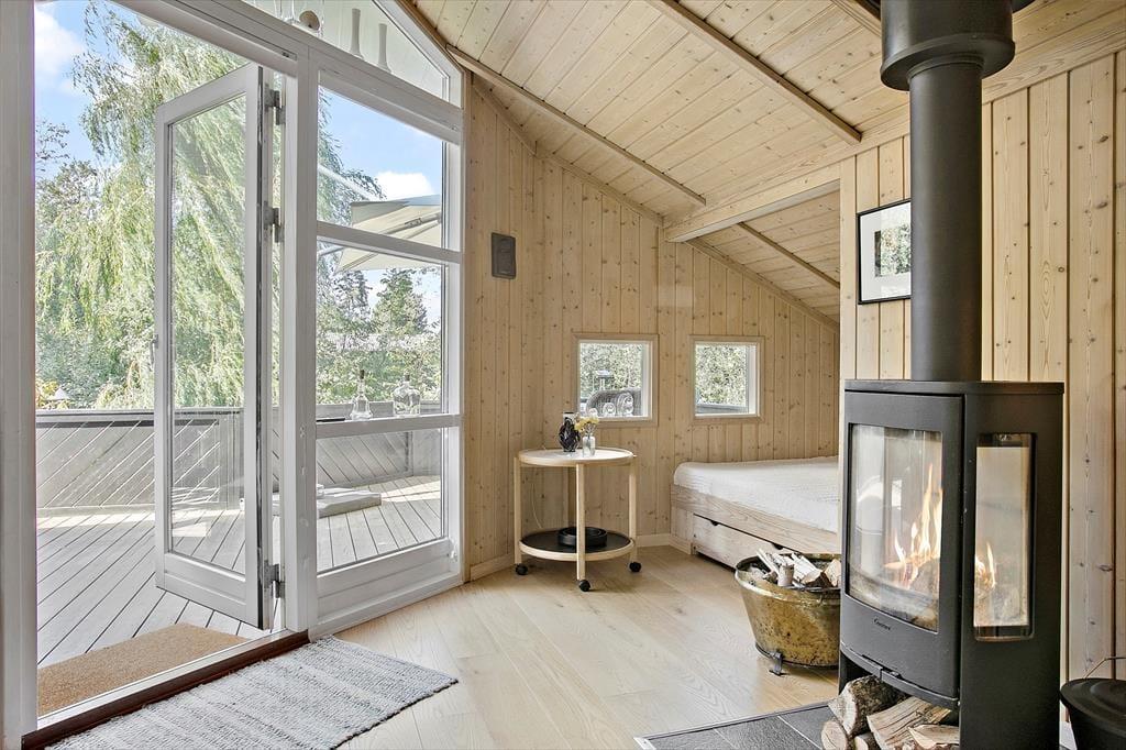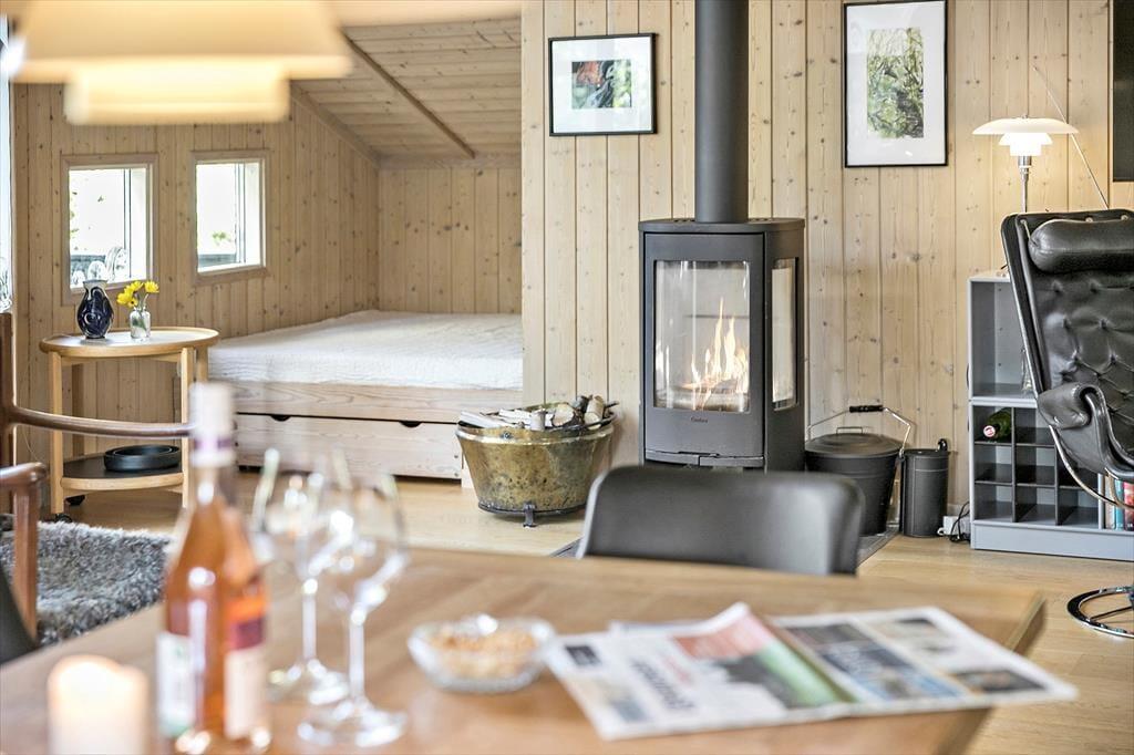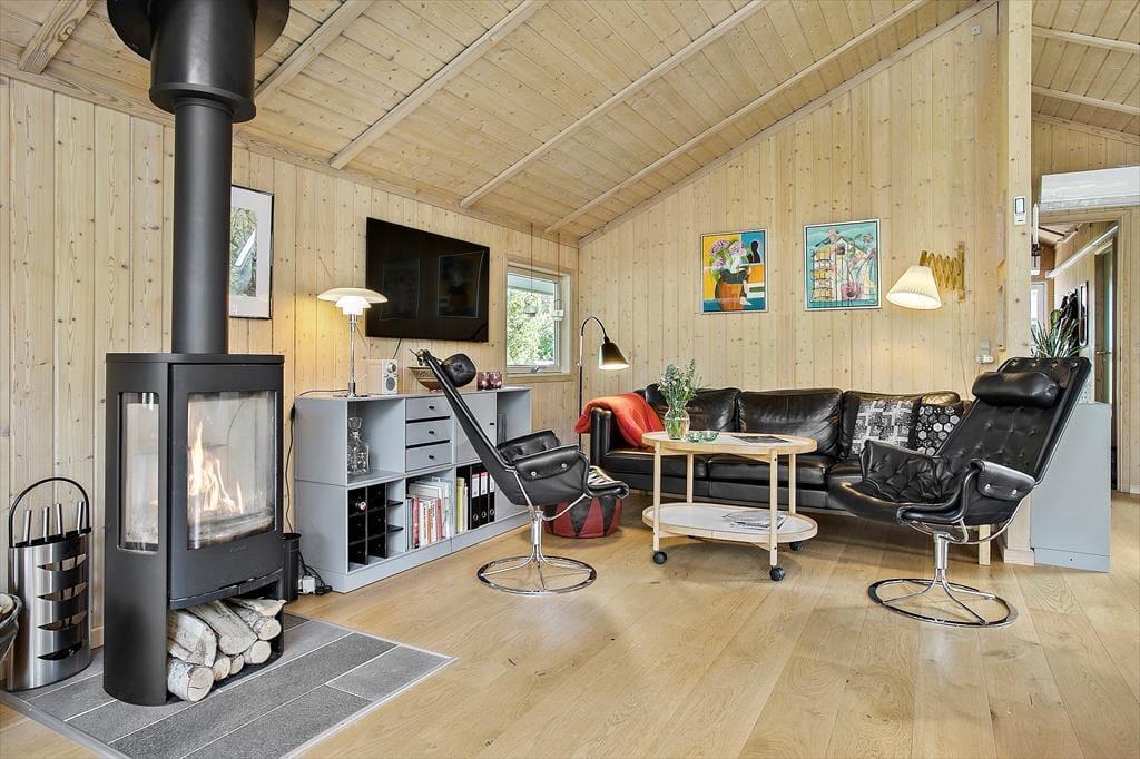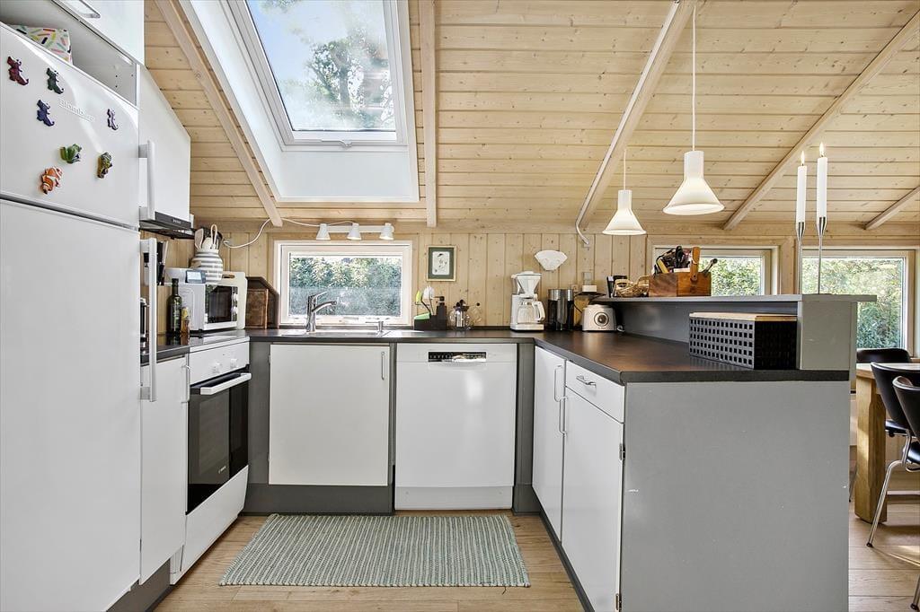 Das schöne Ferienhaus für sechs Personen verfügt über einen offen kombinierten Küchen,- Wohn- und Essbereich. In der Küche stehen ein Herd, ein Geschirrspüler, eine Mikrowelle und ein Kühlschrank mit Gefrierfach für Sie bereit. Im Wohnraum mit hohen Decken sorgen große Fensterpartien für einen tollen Tageslichteinfall. Durch die Terrassentür treten Sie hinaus auf eine überdachte Terrasse. Der Wohn- und Essbereich umfasst einen schönen Essplatz, einen Kaminofen und eine Polstersitzgruppe. Für Unterhaltung und Abwechslung sorgt ein Smart-TV mit dänischen Fernsehsendern und Chromecast. Mittels Chromecast können Sie Ihre privat abonnierten Streamingdienste nutzen. Das Badezimmer beinhaltet eine Sauna, eine Duschnische, eine Waschmaschine, einen Wäschetrockner und eine Fußbodenheizung. Die drei Schlafräume verfügten über jeweils ein Doppelbett. Zwei weitere Schlafplätze bietet die Schlafnische im Wohnraum. Das Ferienhaus wird mittels einer Wärmepumpe, des Kaminofens und Elektroheizkörpern beheizt.
