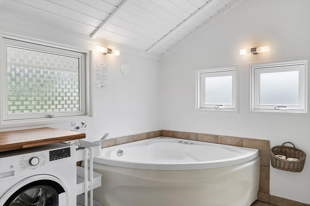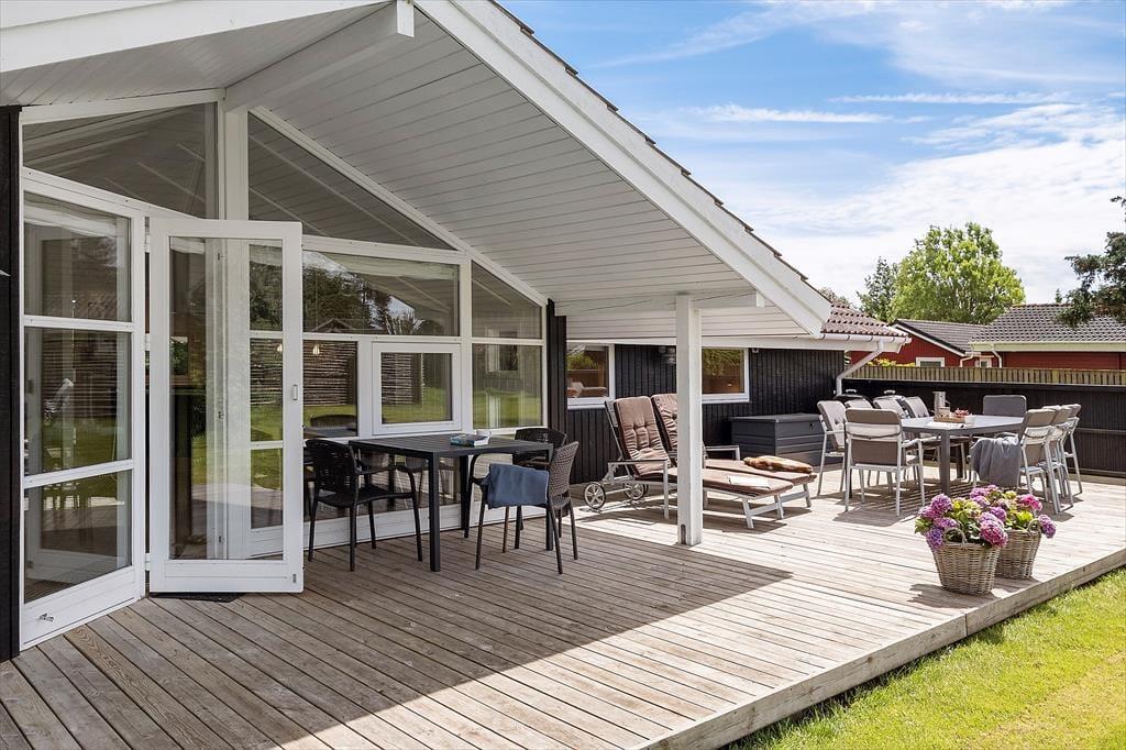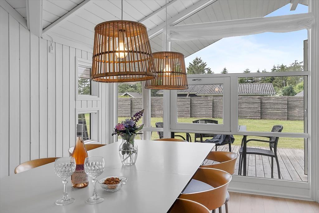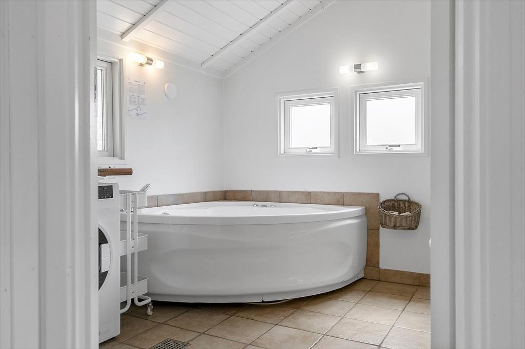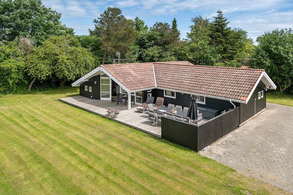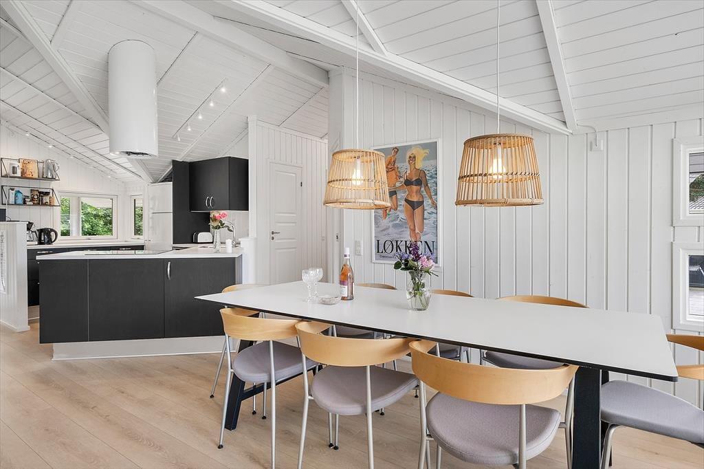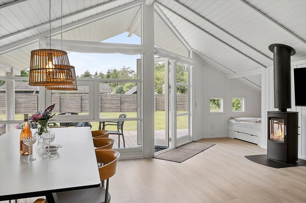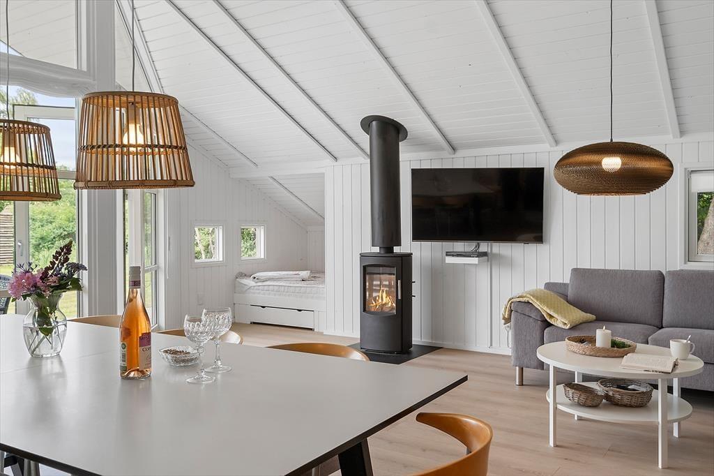 Das Ferienhaus, das 2023 renoviert wurde, ist gepflegt und gut eingerichtet. In allen Räumen gibt es hohe Decken. Die Küche ist in das Wohnzimmer integriert, modern und funktional eingerichtet mit Kochplatten, eingebautem Backofen, Dunstabzugshaube, Mikrowelle, Spülmaschine, Kühlschrank und Gefrierschrank. Im Wohnzimmer gibt es große Fensterfronten, die für viel Licht im Haus sorgen. Vom Wohnzimmer aus gelangst du auf eine teilweise überdachte Terrasse. Hier findest du einen großzügigen Essbereich, ein Ecksofa, einen Kaminofen, einen Fernseher mit dänischen Kanälen, eine Satellitenschüssel mit deutschen Kanälen und eine Chromecast Streaming-Möglichkeit (erfordert eigenen Login). Das Haus ist ausgestattet mit zwei Badezimmern mit Duschecke und Fußbodenheizung. Eines der Badezimmer verfügt außerdem über einen Whirlpool und eine Waschmaschine. Die vier Schlafzimmer sind alle mit Doppelbetten ausgestattet (zwei zusammengestellte Einzelbetten).