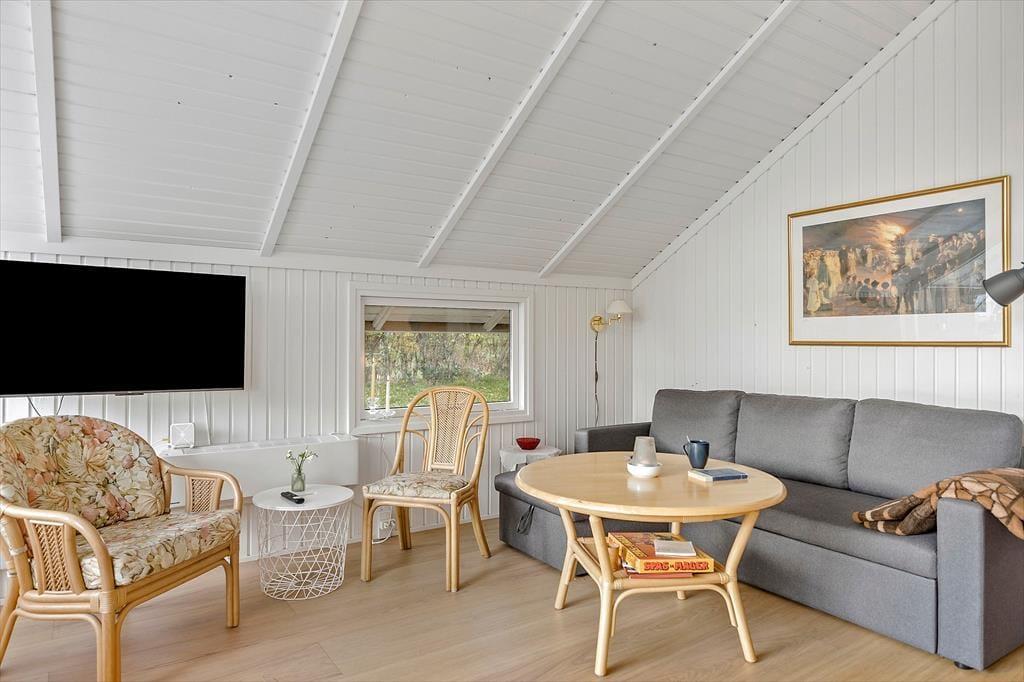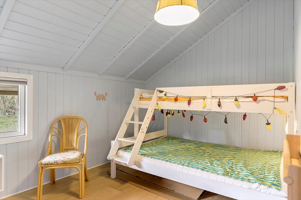 Willkommen in deinem Ferienhaus: Dieses charmante Ferienhaus bietet eine offene Wohnküche mit einem gemütlichen Wohnzimmer. Die Küche ist geräumig und ideal für gemeinsames Kochen und Entspannen, perfekt für die ganze Familie. Im Haus befinden sich zwei Schlafzimmer: eines mit Etagenbett für die Kinder und ein weiteres mit Doppelbett sowie ein komfortables Schlafsofa im Wohnzimmer. Außerdem gibt es ein Nebengebäude mit zwei Schlafplätzen. Vom Wohnzimmer aus gelangt man in den Garten und auf die Terrasse. Das Badezimmer ist geräumig und mit einer Duschkabine sowie viel Stauraum ausgestattet.