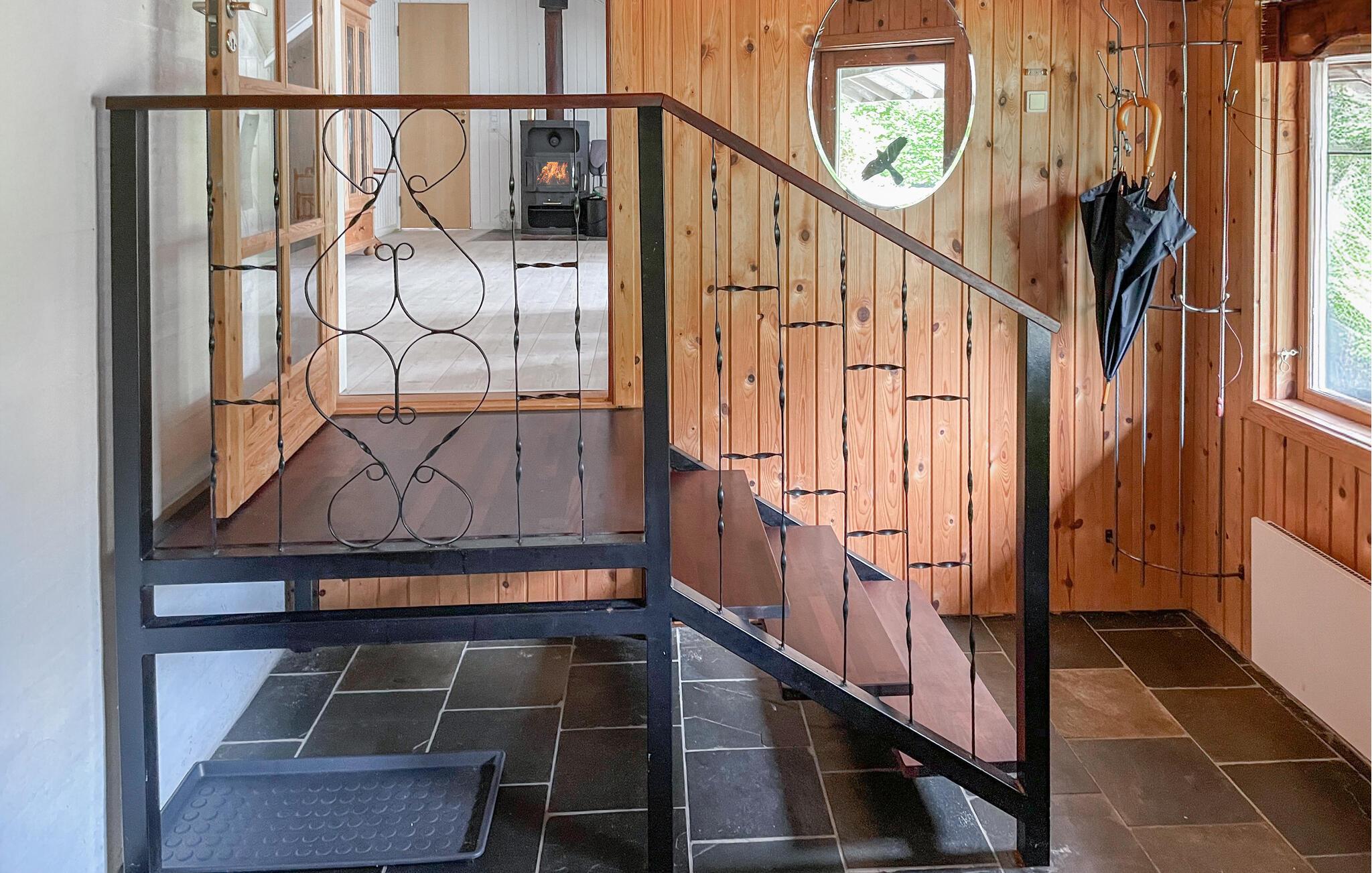 Dieses Haus empfängt Sie mit einer einladenden Atmosphäre. Große Fensterfronten lassen viel Tageslicht ins Innere, während Sie einen schönen Blick ins Grüne genießen. Lehnen Sie sich entspannt bei einer Tasse Kaffee auf dem Sofa zurück, verbringen Sie einen gemeinsamen Filmabend und entzünden Sie an kühlen Tagen den Kaminofen für wohlige Wärme.