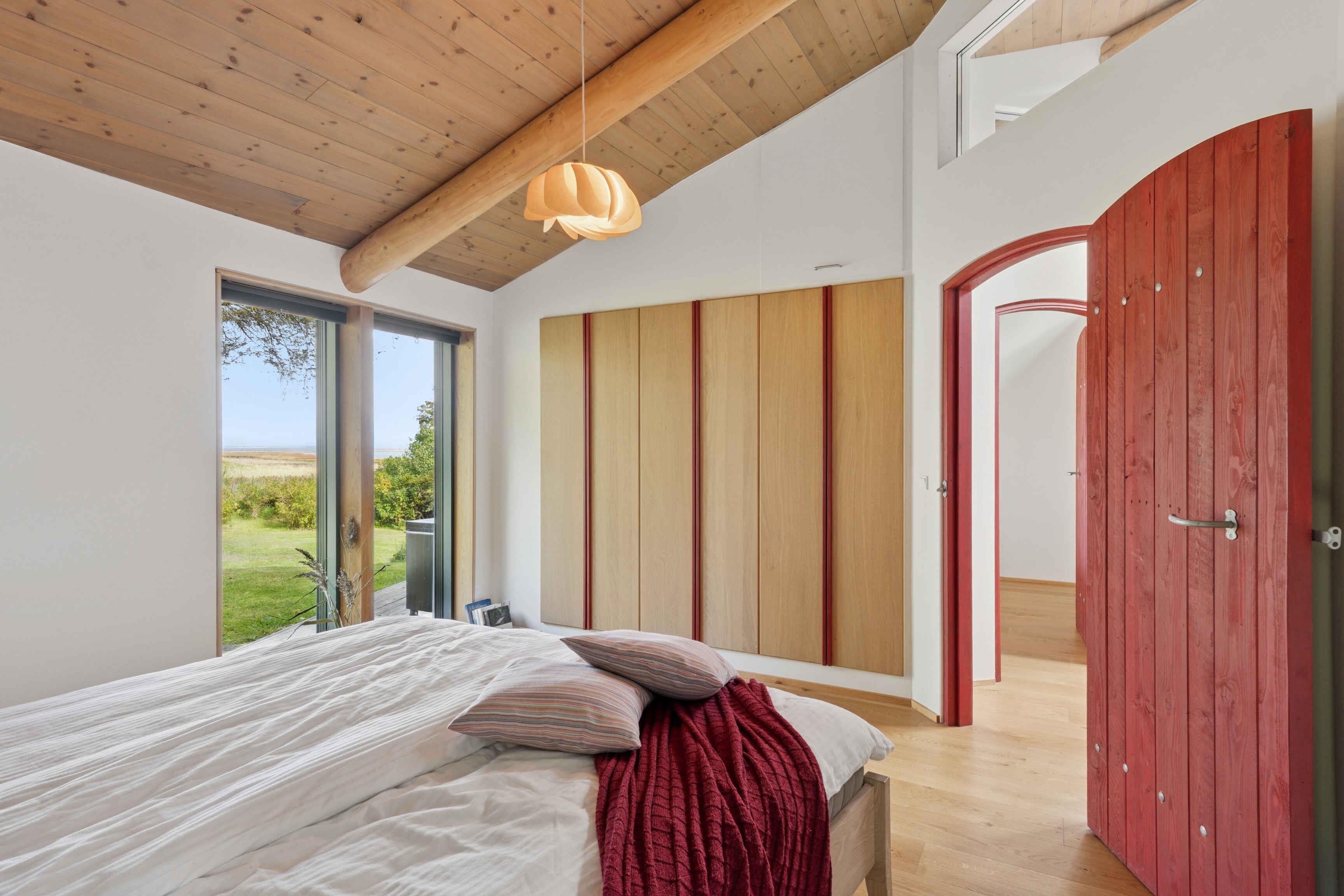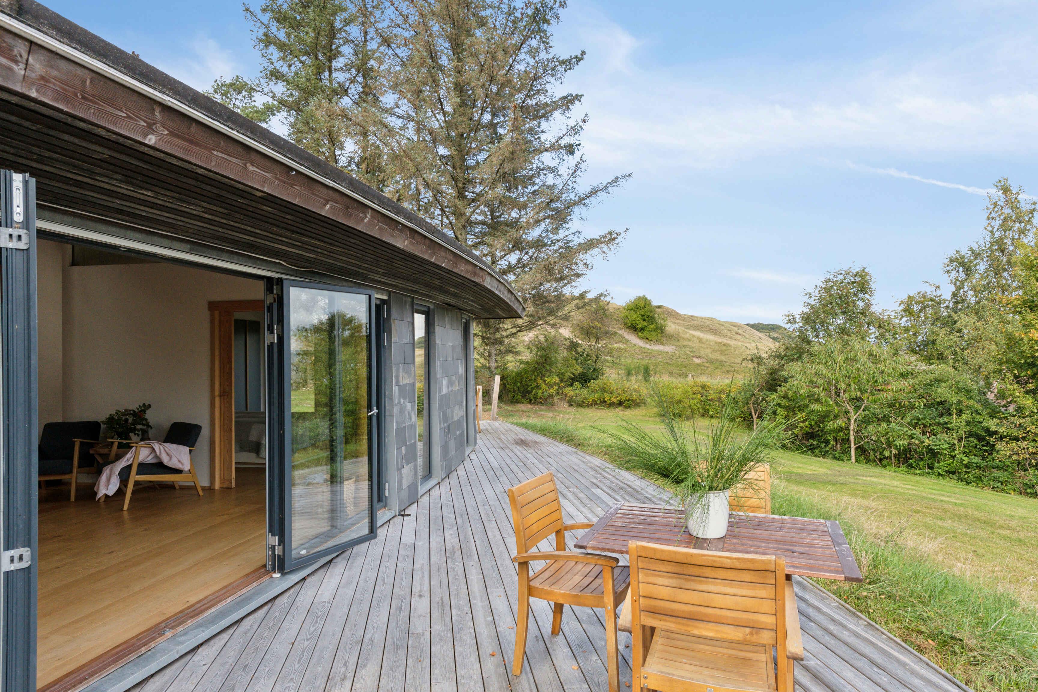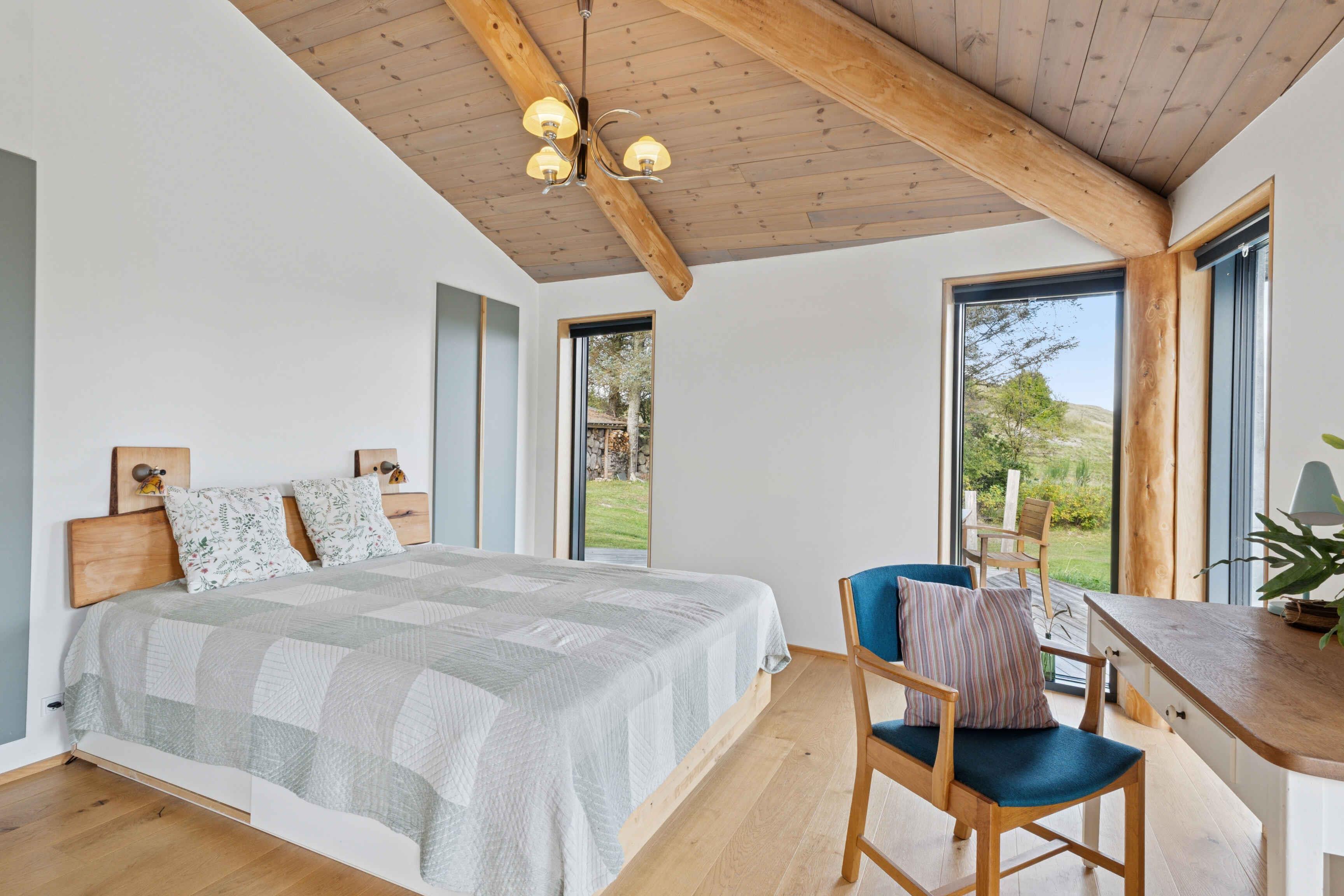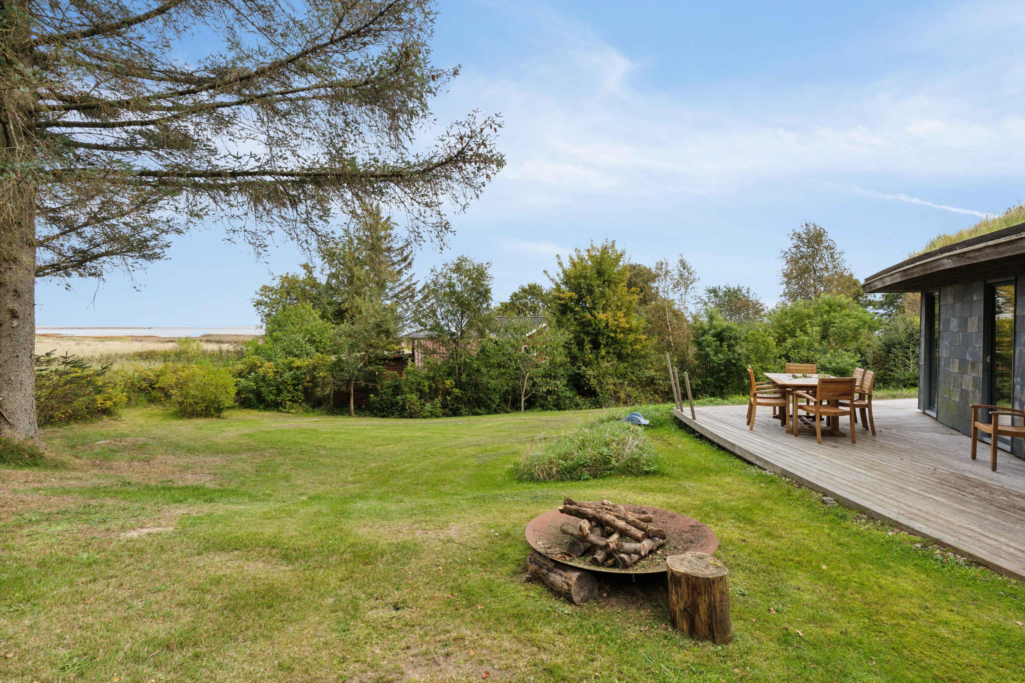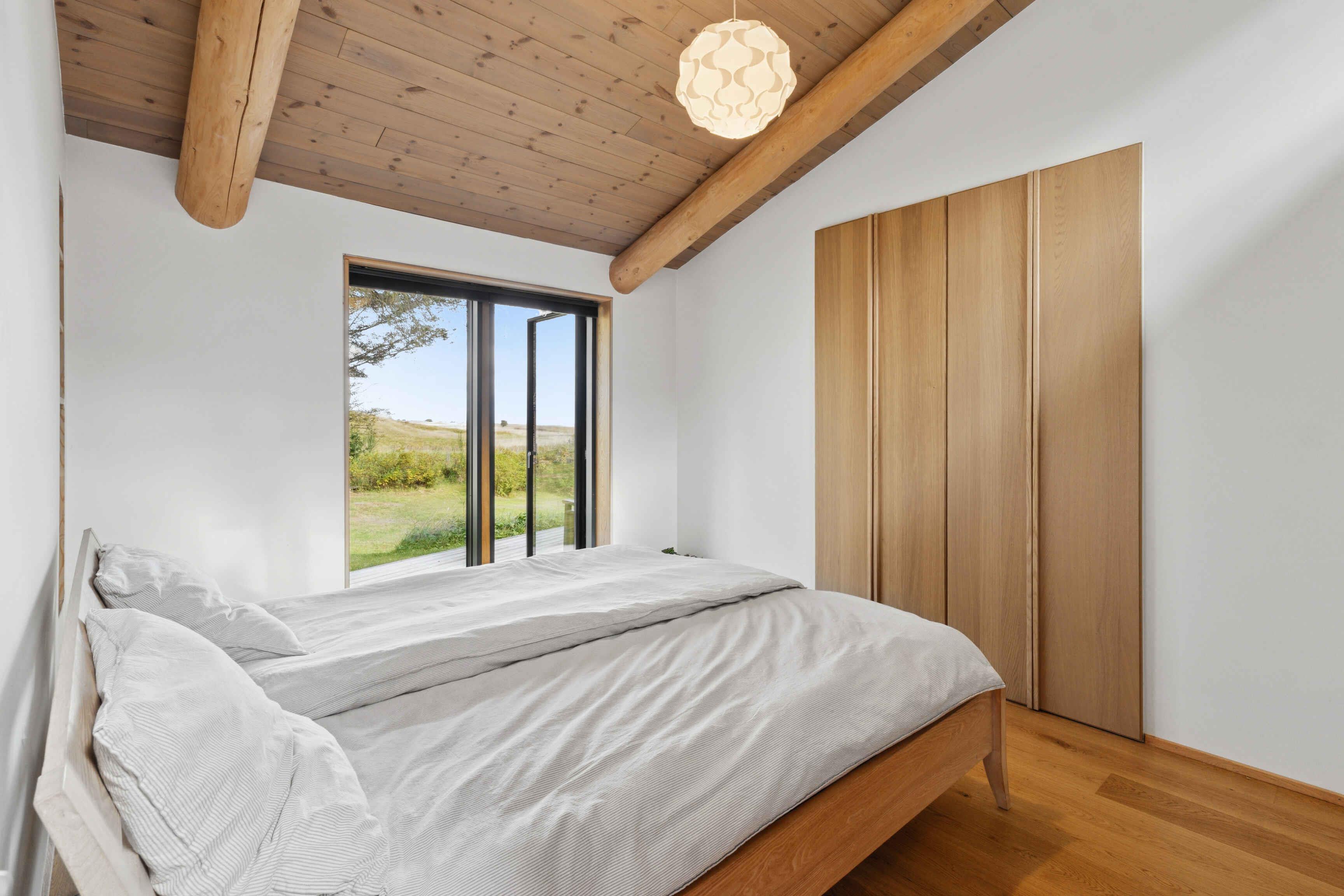 Schönes und großzügiges Ferienhaus aus Naturmaterialien auf einem ebenso schönen und ungestörten Naturgrundstück. Die Fassade ist mit elegant patiniertem Naturschiefer verkleidet. Das Dach ist mit Gras und Sedum begrünt, sodass sich das Haus harmonisch in die landschaftlich reizvolle Umgebung einfügt. Innen prägt die Rundstammkonstruktion die großen, hellen und freundlichen Räume. Das Haus ist von einer großen Terrasse mit Panoramablick über das Kattegat und die Muldbjerge umgeben. Vom Schuppen in der Ecke des Gartens führt ein kleiner Pfad zu einem herrlichen Aussichtspunkt oben auf dem Grundstück. Das Grundstück ist seit 30 Jahren im Familienbesitz. Das Haus wurde von Vater und Sohn neu gebaut und 2025 fertiggestellt. Das Haus liegt direkt an den Muldbjerge, die zu wunderschönen Spaziergängen einladen. Manche nutzen die Hügel auch zum Paragliding. Am kleinen Steg an der Teglvej (200 m vom Haus) gibt es gute Möglichkeiten, Seekajaks, Paddleboards und Windsurfer zu Wasser zu lassen. Zwei Paddleboards mit Handpumpe, Schwimmwesten und Paddel stehen im Schuppen kostenlos zur Verfügung. In fußläufiger Entfernung befindet sich der Steg in Dokkedal, wo man gut baden und Krabben fangen kann. Wir haben selbst die großen Sandbänke beim Steg immer zum Schwimmen und Sandburgenbauen genutzt. Das Ferienhaus liegt in Fahrradentfernung (5 km) zur Lille Vildmose, einem großen, geschützten Wildnisgebiet mit reichem und einzigartigem Tierleben. Jeweils 10 km südlich und nördlich liegen Øster Hurup und Hals, zwei Orte mit lebhaftem Stadt- und Hafenleben im Sommer. Aalborg ist nur 30 Autominuten entfernt und bietet zahlreiche Kultur- und Einkaufsmöglichkeiten.