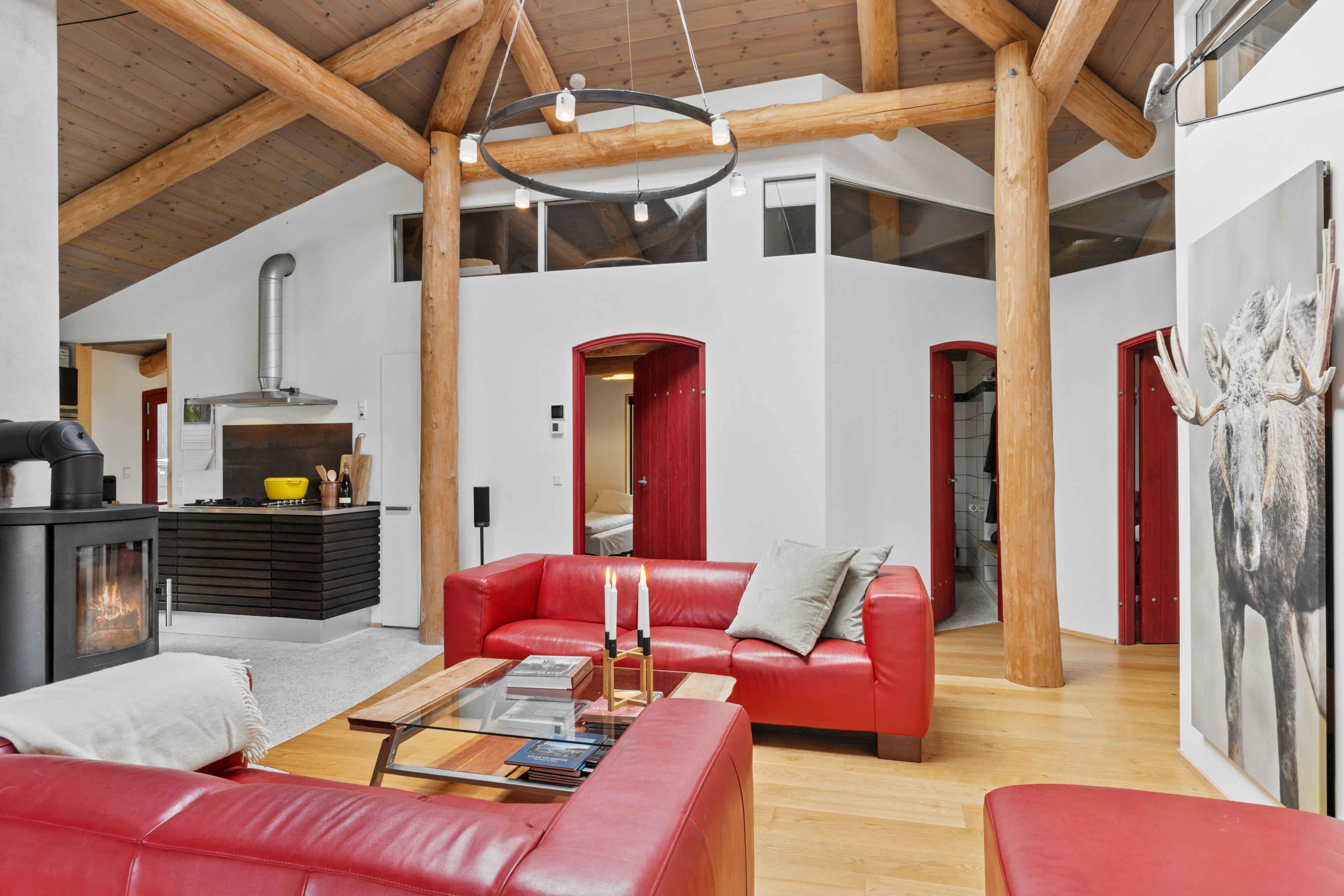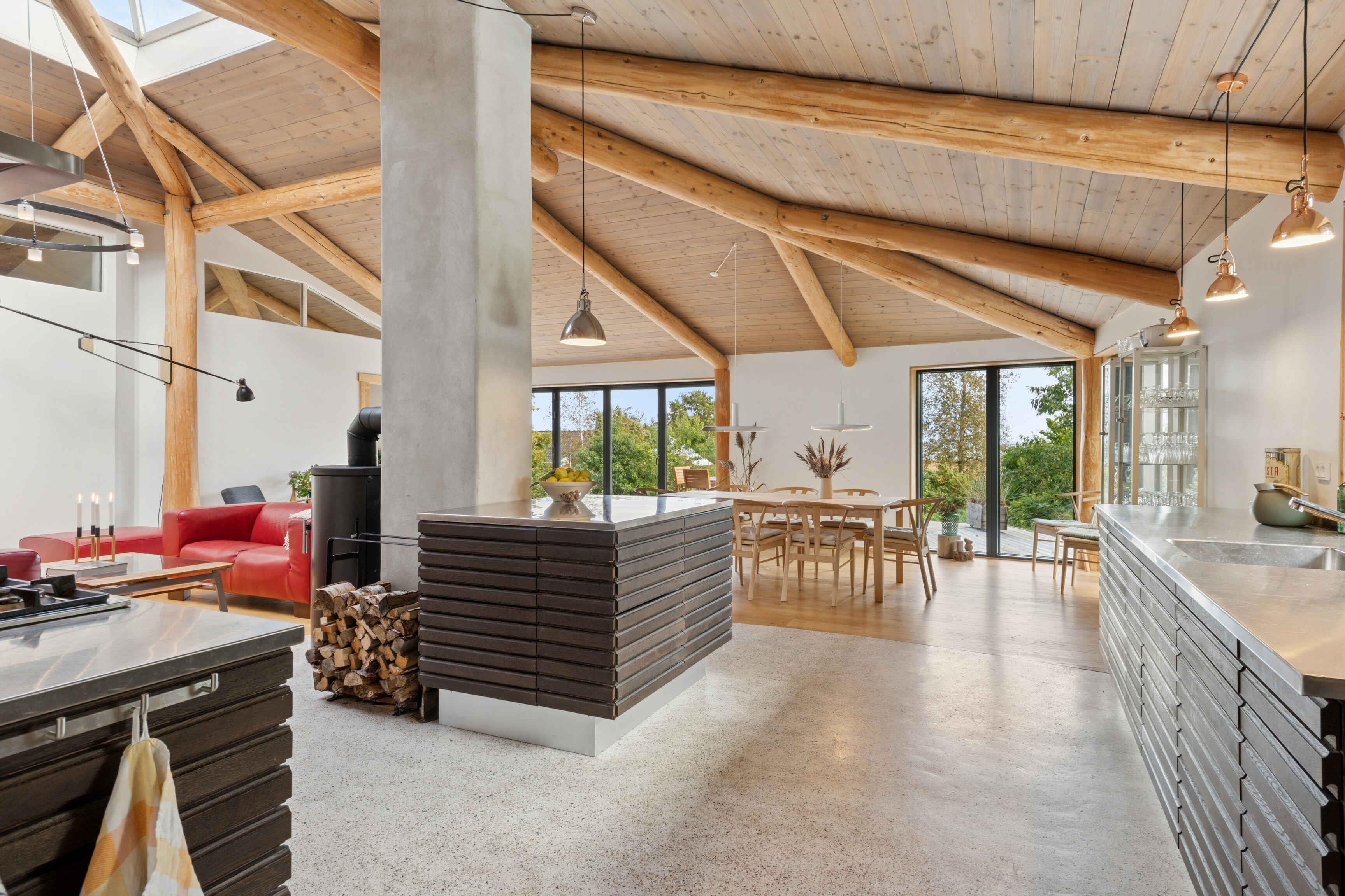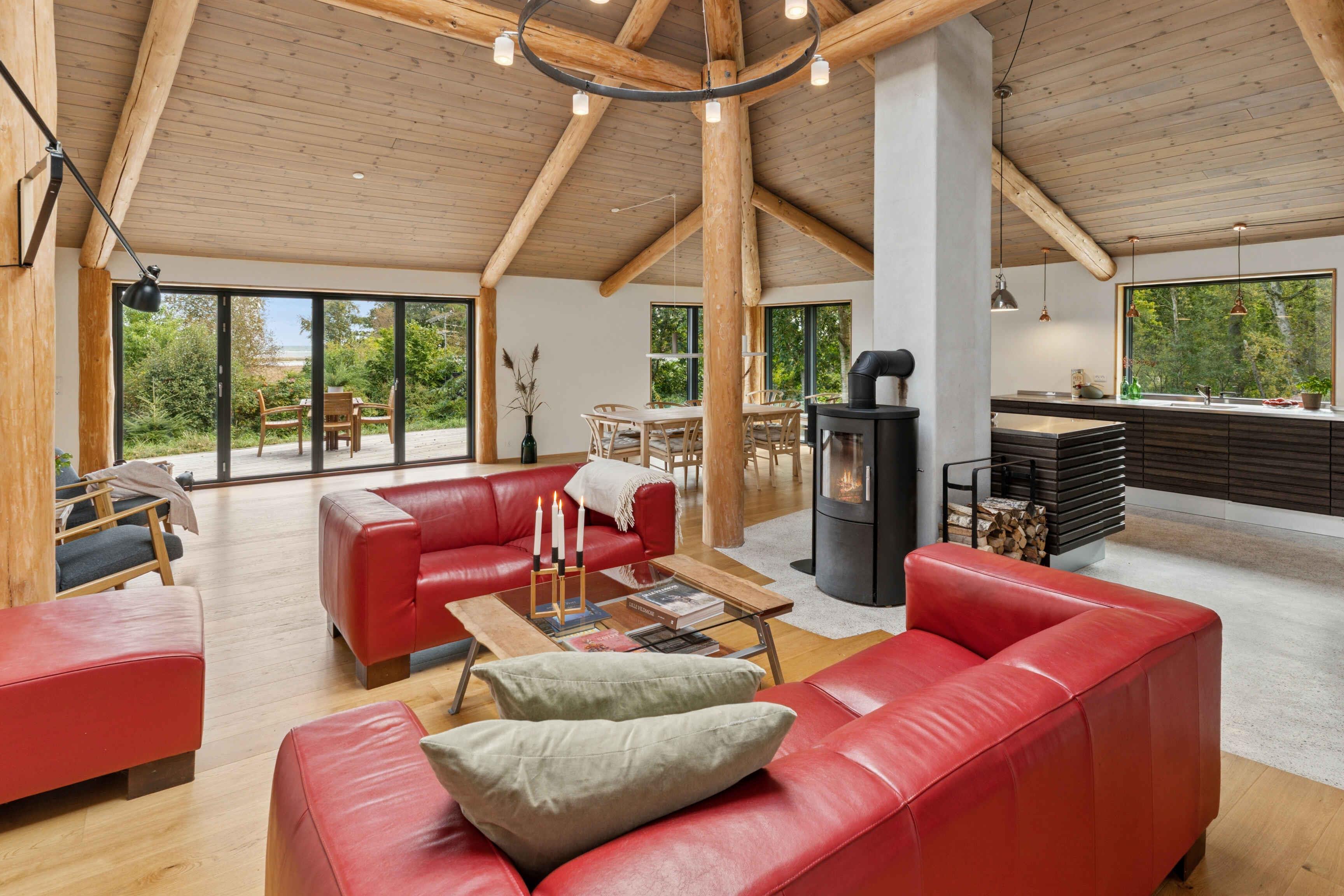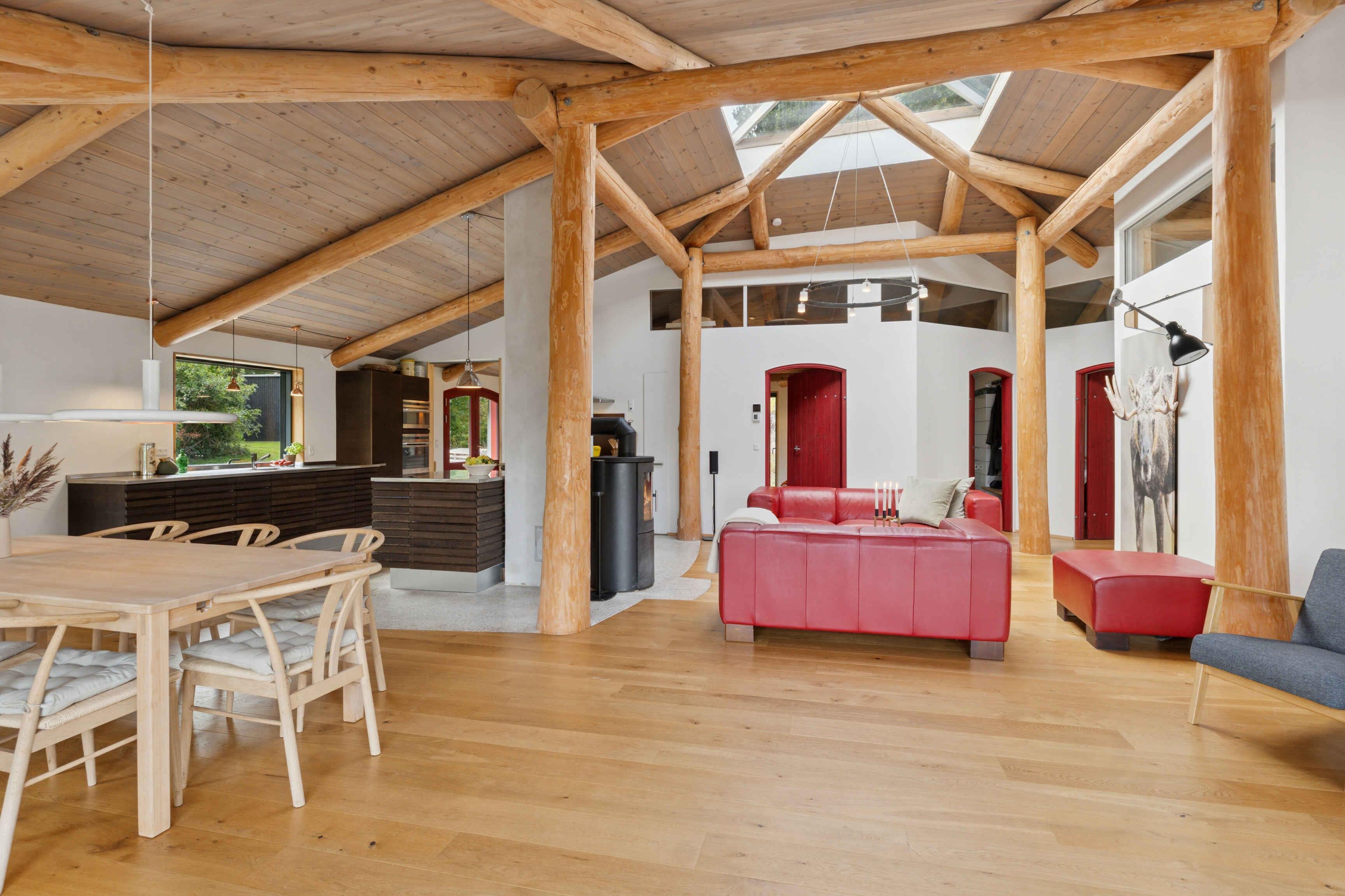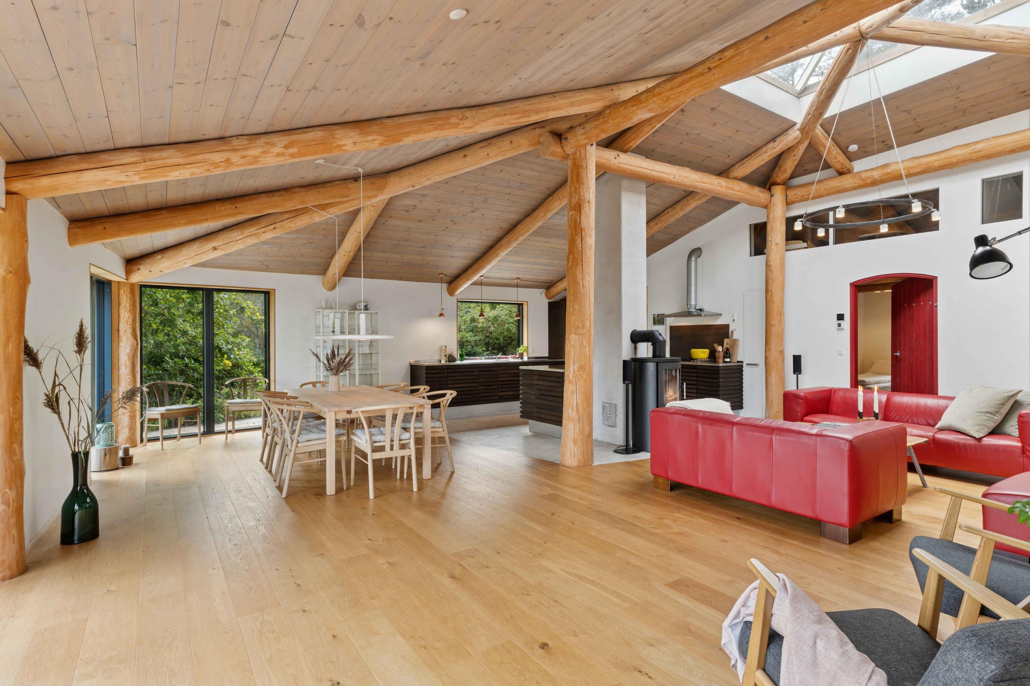 Schönes Ferienhaus aus Naturmaterialien auf ungestörtem Grundstück. Innen prägen Rundstämme die großen, hellen Räume. Große Terrasse mit Panoramablick auf Kattegat und Muldbjerge.