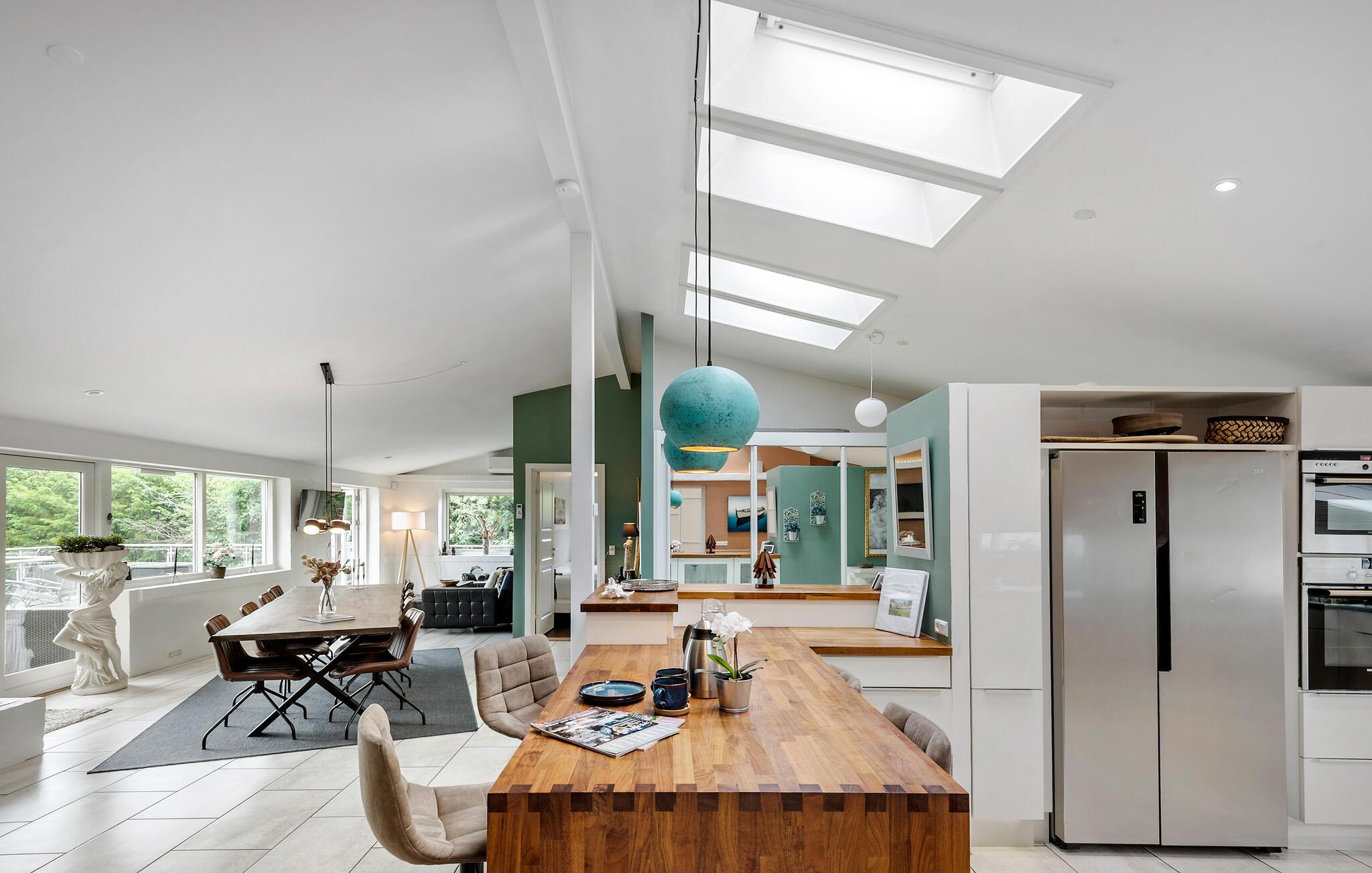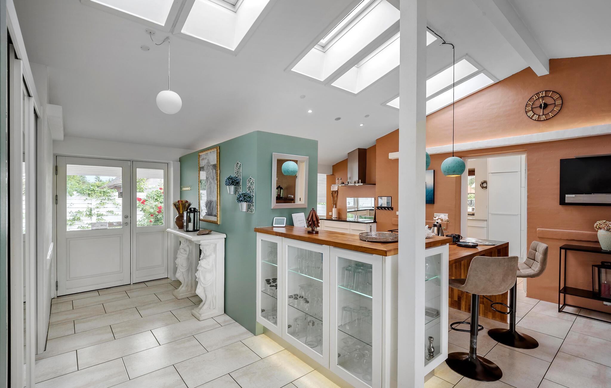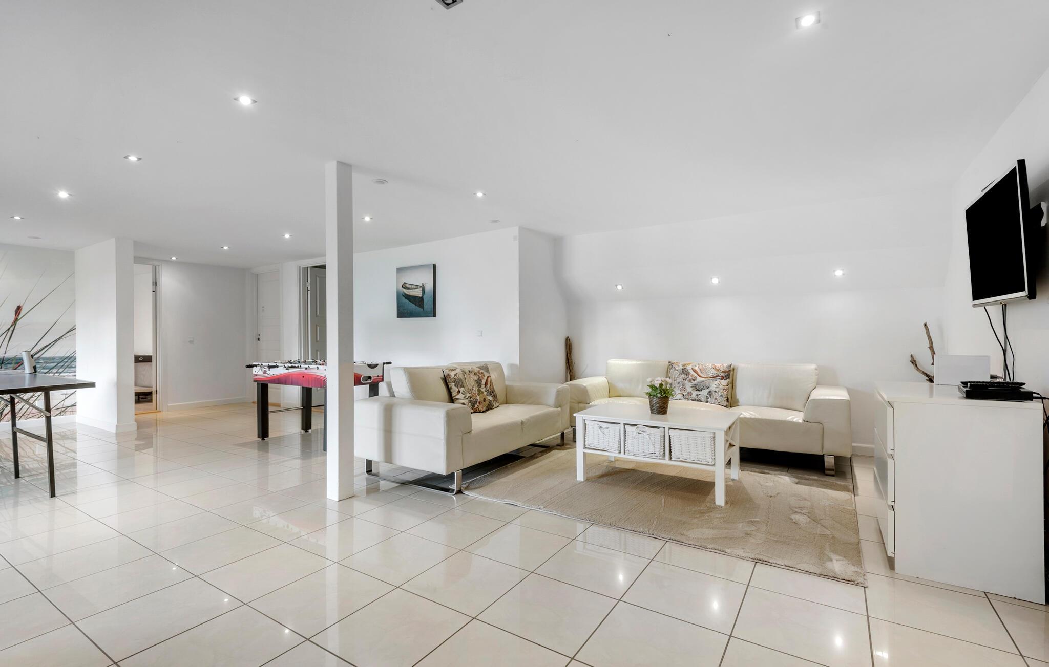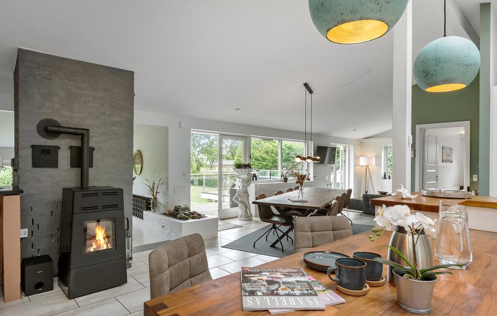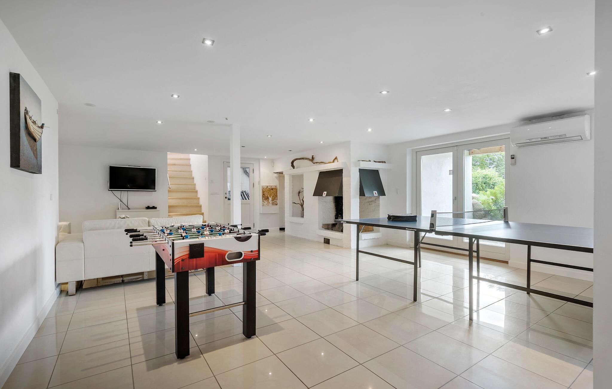Nur 150 Meter vom Strand entfernt finden Sie dieses moderne und einladende Ferienhaus mit toller Ausstattung. Es erwarten Sie helle und offene Wohnräume, die schnell zu Ihrem Treffpunkt im Urlaub werden. Genießen Sie die gemeinsame Zeit vor dem Kamin, spielen Sie Karten oder lesen Sie ein gutes Buch. Der Fernsehraum eignet sich perfekt für großartige Filmabende. Wählen Sie einfach einen Film und Ihre Lieblingssnacks aus und machen Sie es sich bequem. Die Ferienmahlzeiten werden am gedeckten Tisch eingenommen, und bei schönem Wetter kann man auch auf die Terrasse gehen. Beginnen Sie Ihren Tag mit einer dampfenden Tasse Kaffee und planen Sie Ihre Ausflüge und Aktivitäten, während die Kinder im Garten spielen. Später können Sie bei einem leckeren Grillabend den lauen Sommerabend genießen. Für Kinder und Junggebliebene gibt es einen Aktivitätsraum, in dem man sich unter anderem beim Tischfußball und Tischtennis messen kann. Nach einem aktiven Tag ist es schön, ein Schaumbad zu nehmen und neue Energie zu tanken.
