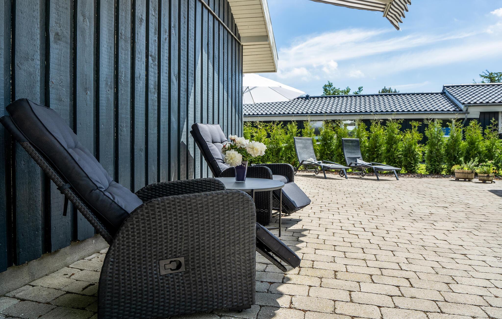 Vom Wohnbereich gelangen Sie auf die Holzterrasse mit Gartenmöbeln, die zu viel Zeit an der frischen Luft einlädt. Hinterm Haus finden Sie einen weiteren Außenbereich mit langem Esstisch, wo Sie gut zusammen draußen essen können.