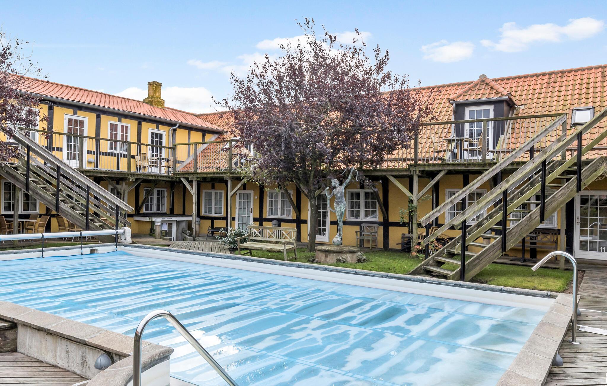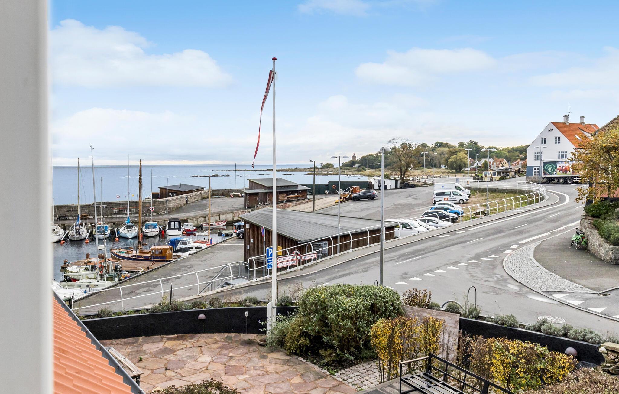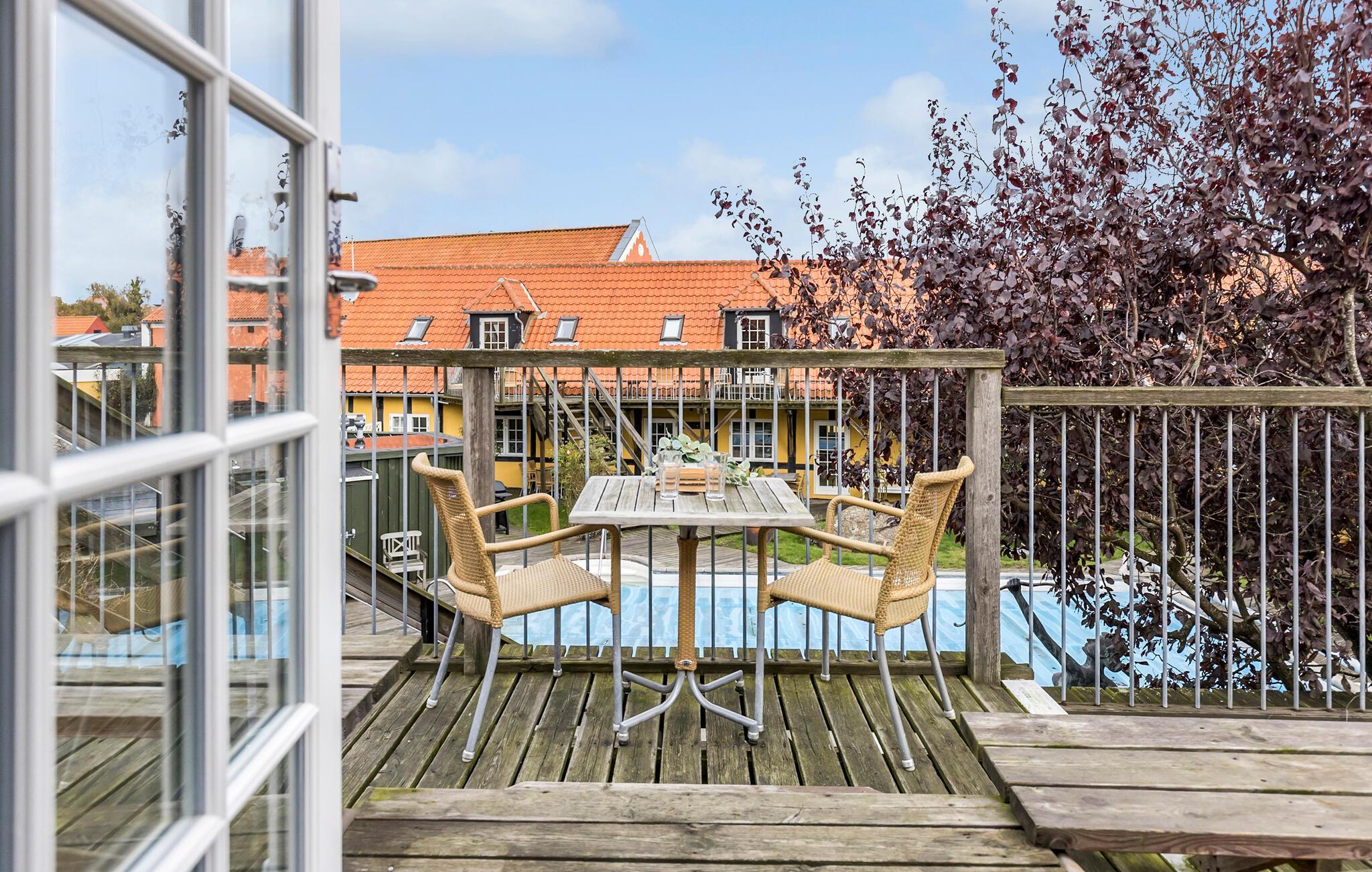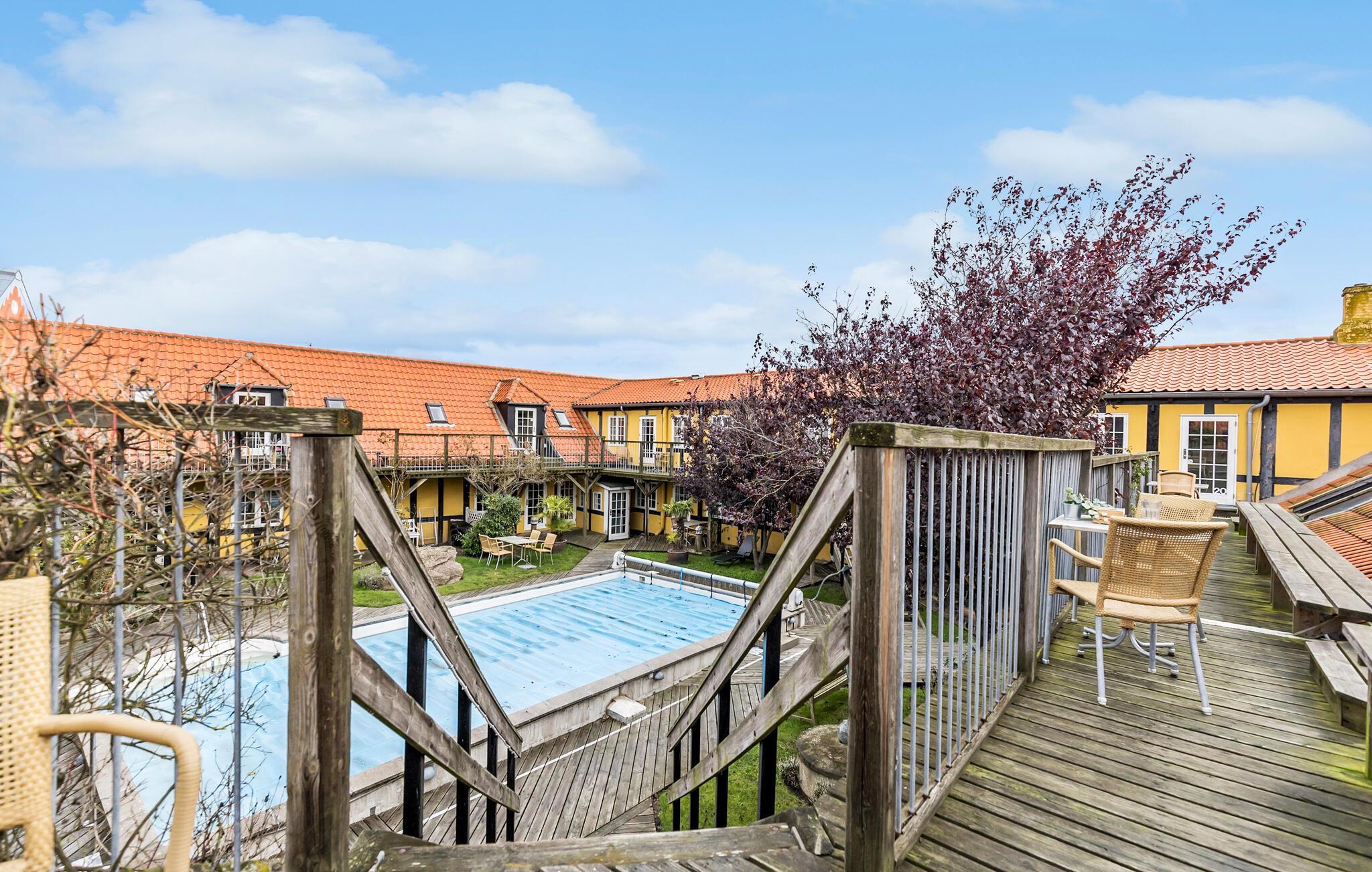 Gemütliche Ferienwohnung am Hafen von Svaneke mit Gemeinschaftspool und Terrasse für entspannte Urlaubstage.