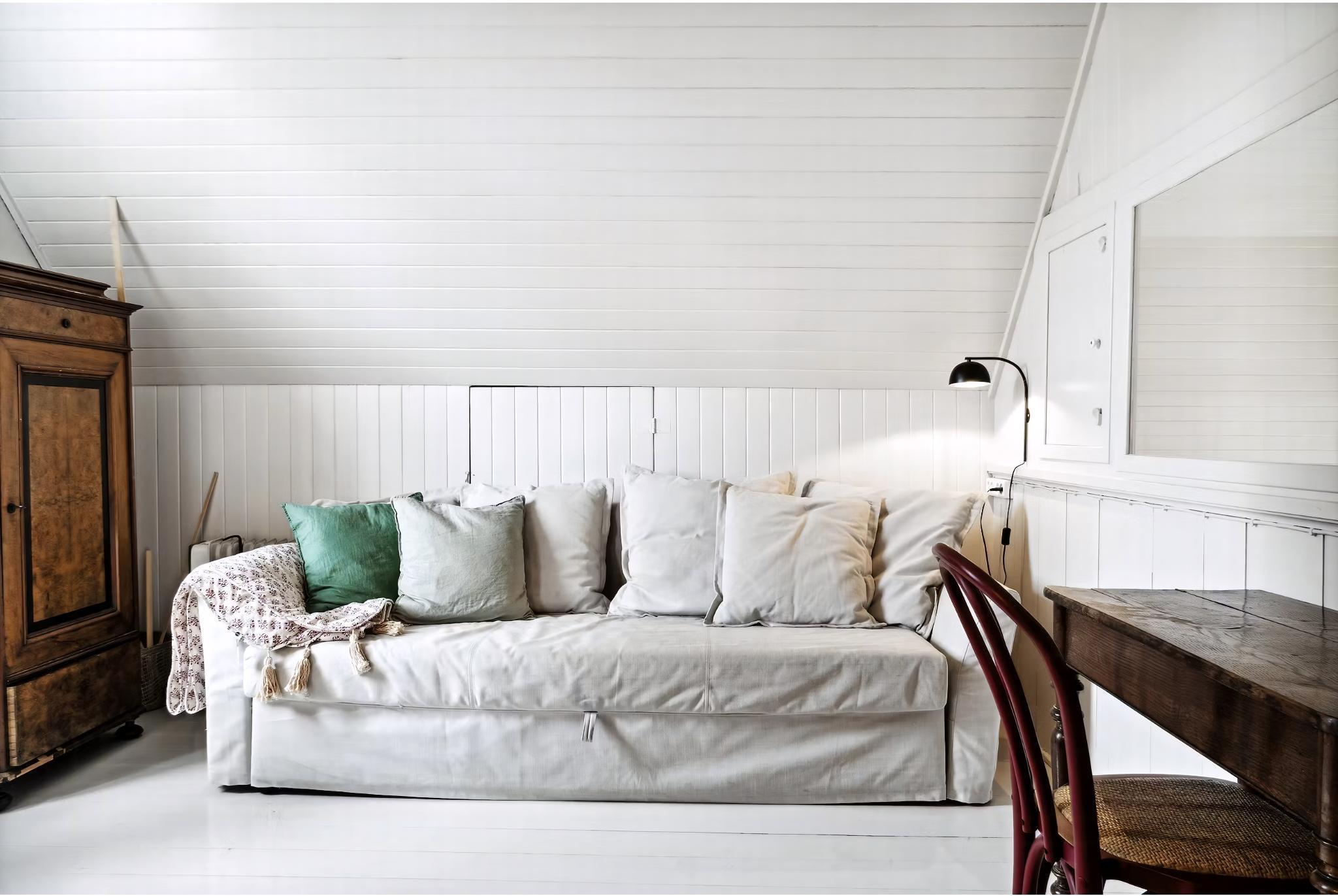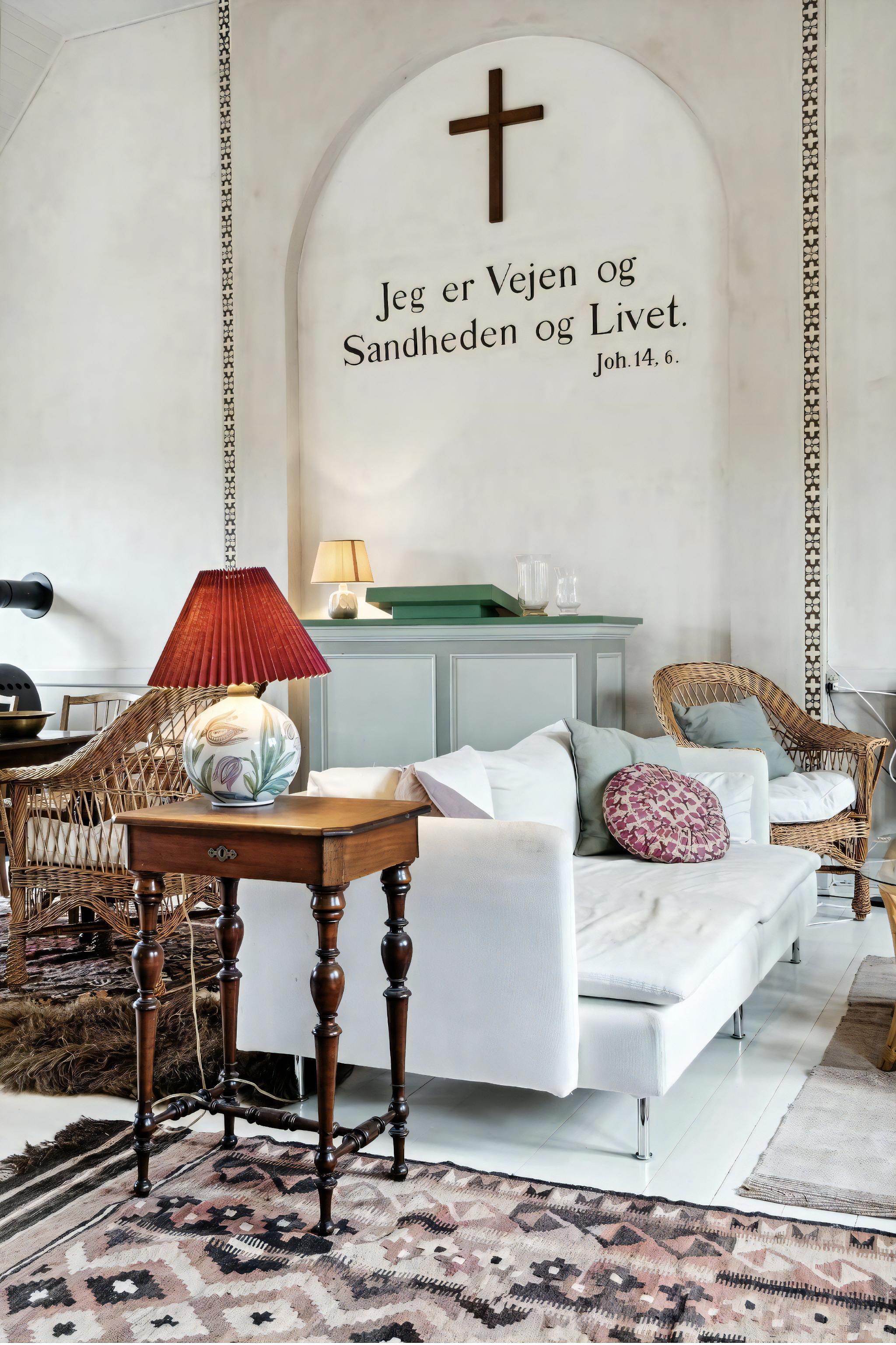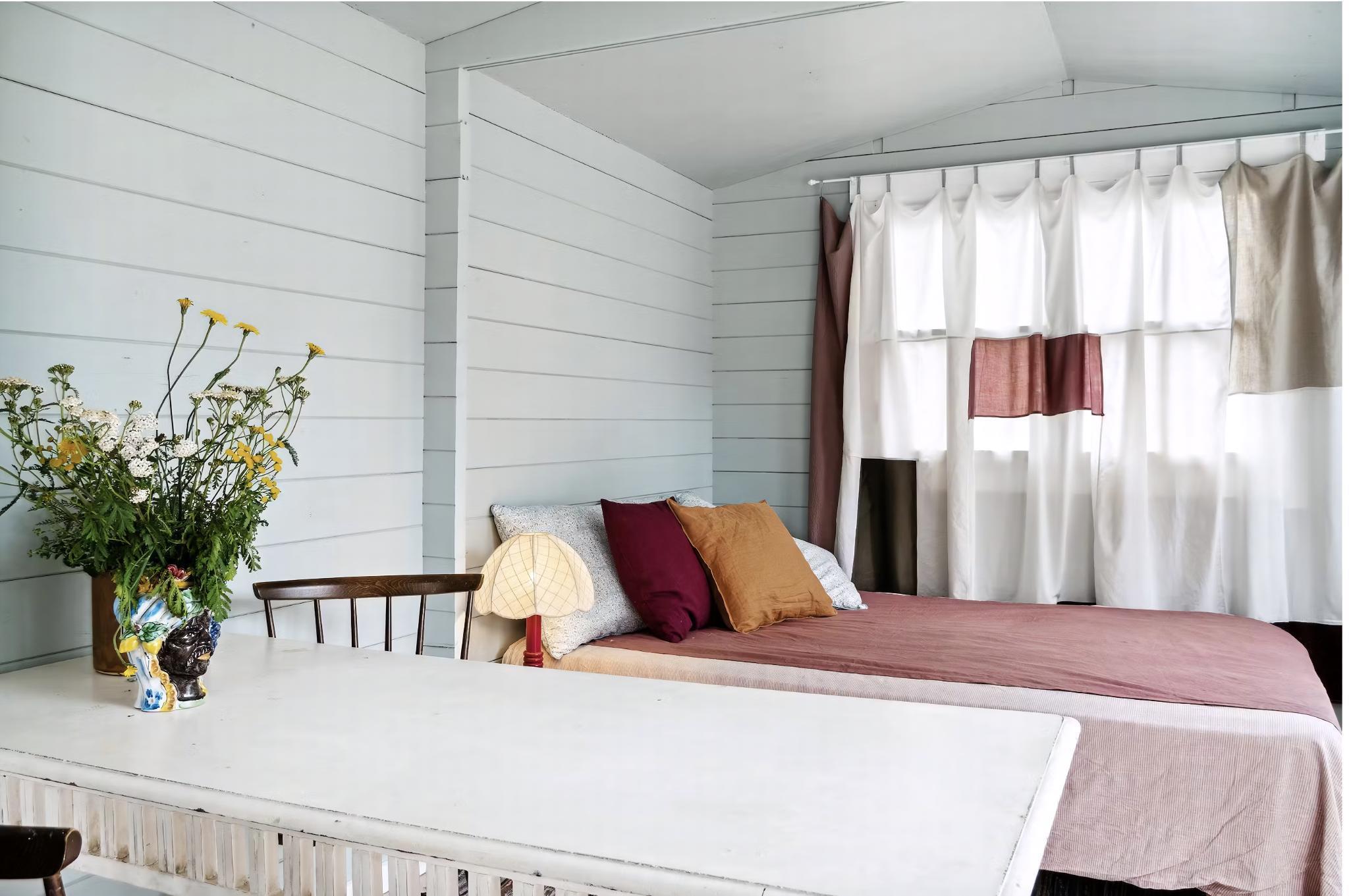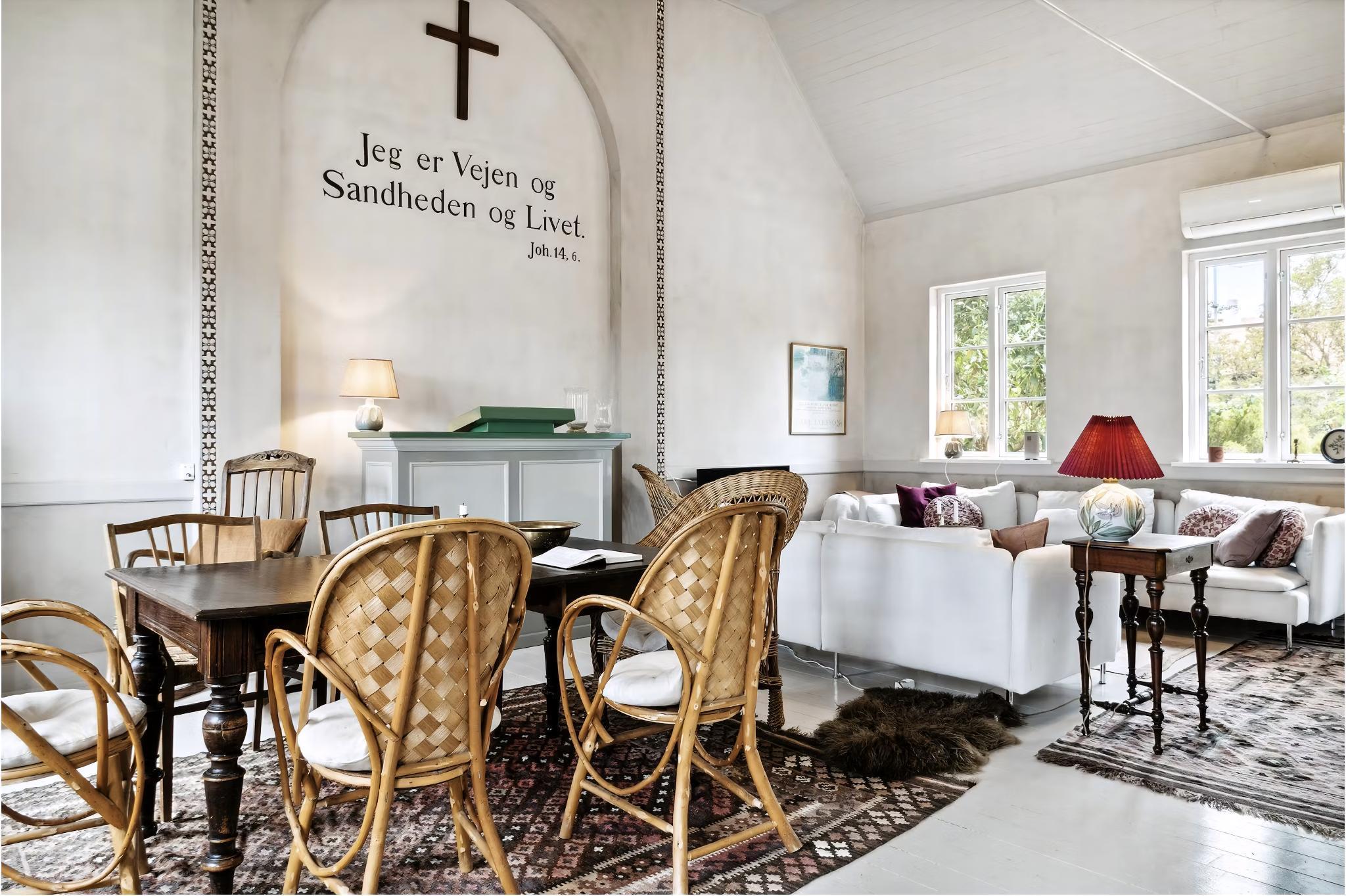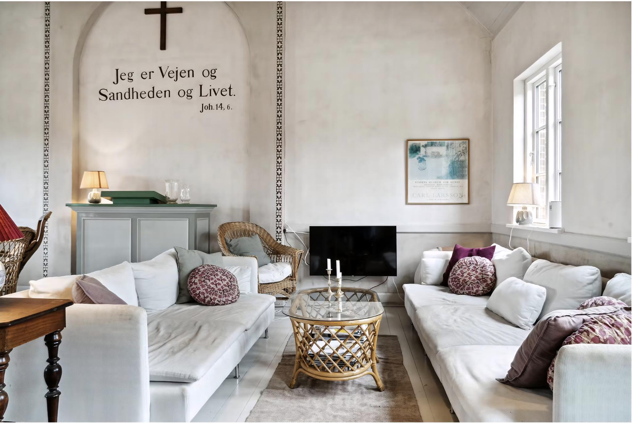 Hinter dem Hafen des alten Fischerdorfs Aarsdale liegt ein altes, authentisches Missionshaus am Ende einer kleinen, abgeschlossenen Straße. Das Ferienhaus hat eine wunderschöne Lage an der Ostküste von Bornholm, nur einen Steinwurf entfernt von dem idyllischen Svaneke. Das Haus war abgenutzt, trist und stand auf einem Parkplatz, als die Familie es vor drei Jahren übernahm. Seitdem haben sie es liebevoll renoviert, mit Terrassen, einem Außenbad und der Bepflanzung von verschiedenen Beerensträuchern sowie einem Apfel- und Mandelbaum. Die Familie hat außerdem darauf geachtet, die ursprüngliche Architektur des Hauses zu bewahren, mit dem großen Saal, der eine Kanzel und eine Inschrift an der Wand enthält, und der nun als wunderschöne offene Küche und Wohnzimmer dient, mit einem Schwerpunkt auf Gemeinschaft. Das Erdgeschoss beherbergt auch ein großes Schlafzimmer, ein kleines WC und einen großen Eingangsbereich, und der alte Chor im Obergeschoss wurde mit schalldichten Fenstern versehen und als Schlafzimmer mit Blick auf den Saal eingerichtet. Im Garten befindet sich das einzige, aber schönste Bad des Hauses, mit Dusche und Badewanne. (Es gibt kein Bad im Inneren, nur ein WC). Das Haus ist in sanften Farben eingerichtet, mit Möbeln aus Bornholm, um die Ruhe und den Frieden widerzuspiegeln, die die lokale Gemeinschaft bietet. Das maritime Mühlen- und Fischerdorf Aarsdale bietet ein gemütliches Hafenumfeld mit einer Sauna für Winterbäder und einigen aktiven Fischern, einen schönen Strand, nur 100 Meter vom Ferienhaus entfernt, einen Høker und Mikkeler hat im Sommer ein gutes Restaurant und eine Bar eröffnet. Nach einer Mahlzeit in der Stadt können Sie einen Spaziergang zum bekanntesten Wahrzeichen der Stadt machen, nämlich der gut erhaltenen Mühle von 1877. Wenn Sie gute Wanderschuhe haben, können Sie auch das schöne Natur- und Waldgebiet Paradisbakkerne besuchen, mit vielen guten Wanderwegen. Wenn Sie dem Naturpfad drei Kilometer nach Norden folgen, erreichen Sie Svaneke, und fünf Kilometer nach Süden kommen Sie nach Nexø, die jeweils auf ihre eigene einzigartige Weise ganz besonders sind. Achtung: Wird nicht für gewerbliche Nutzung vermietet.