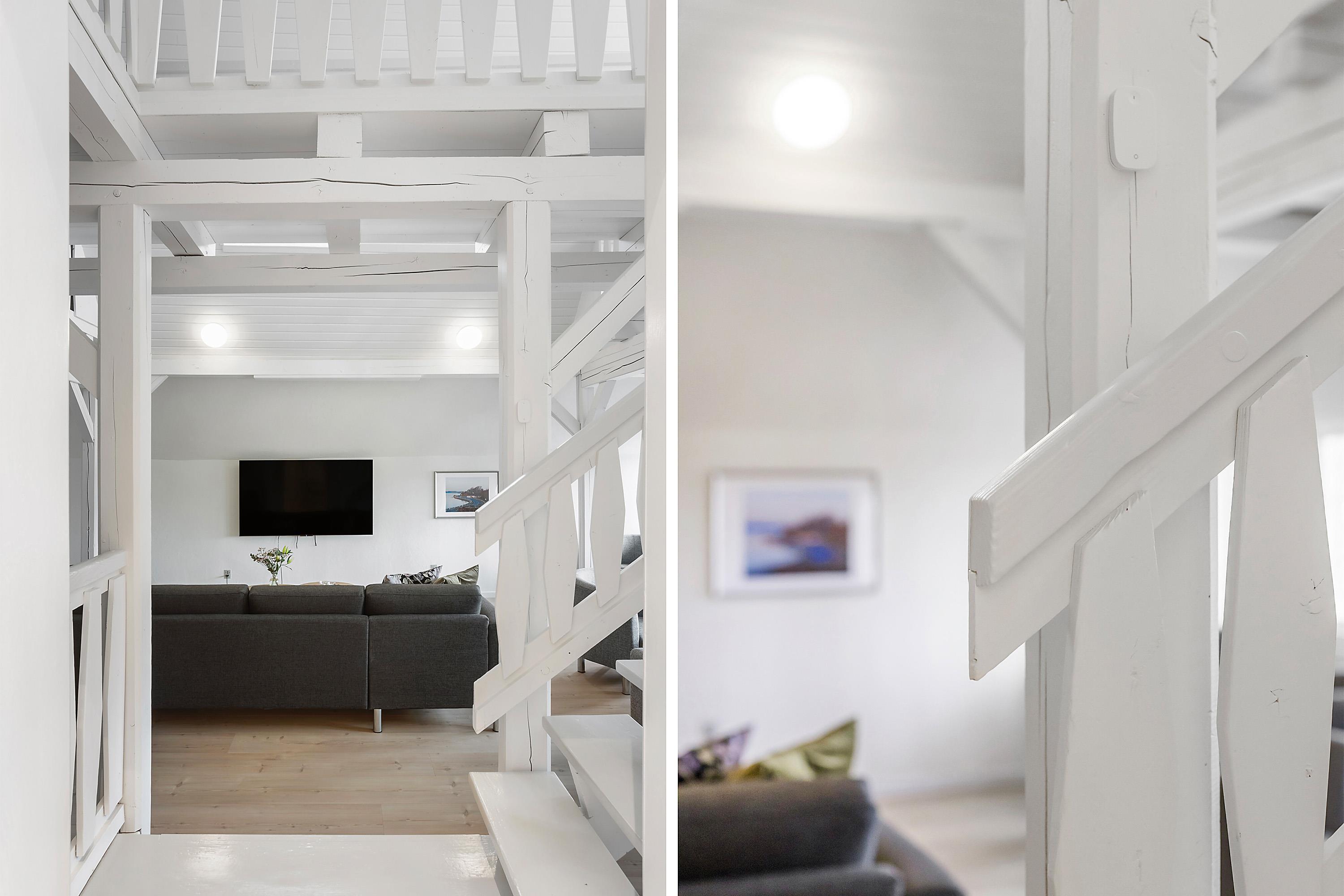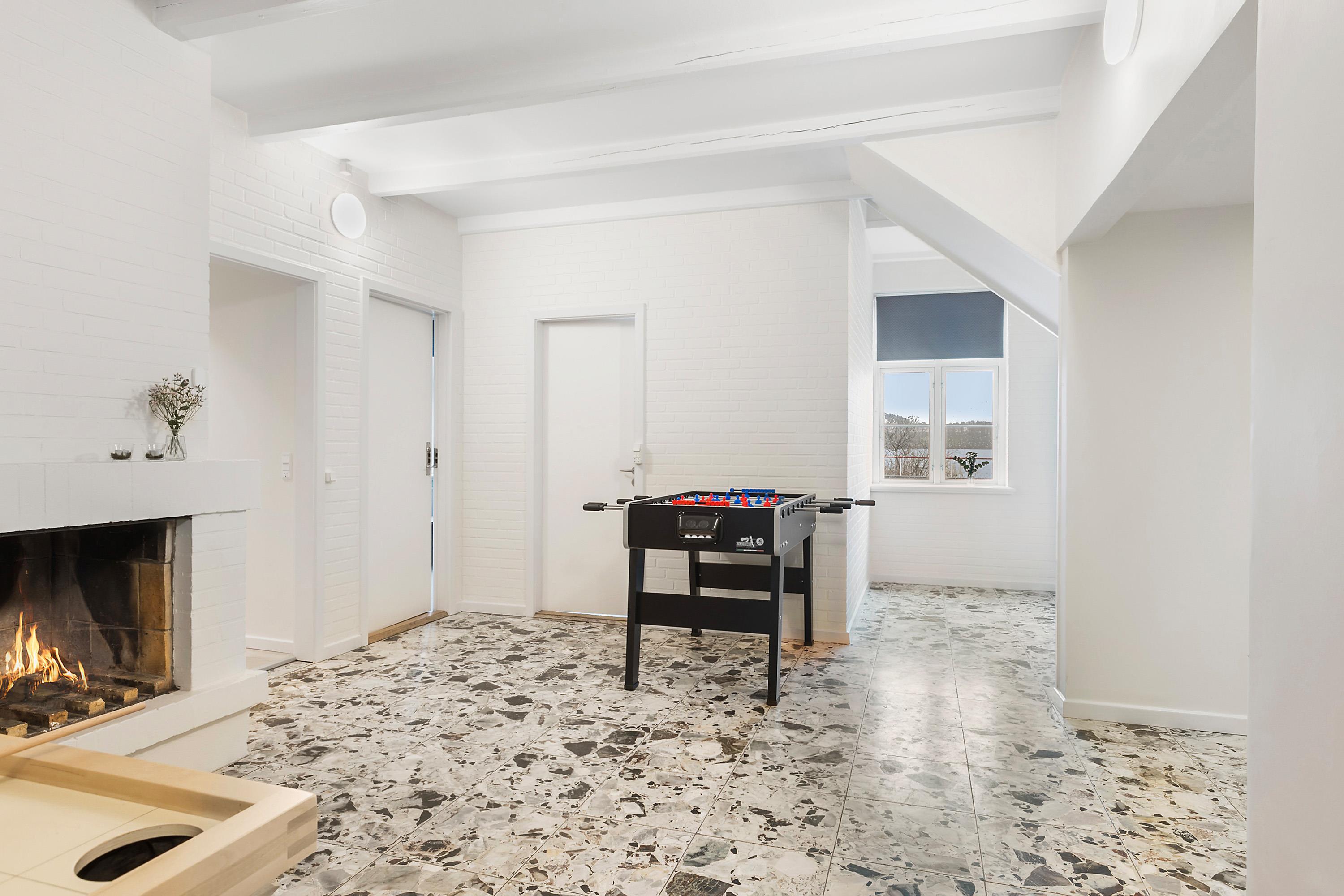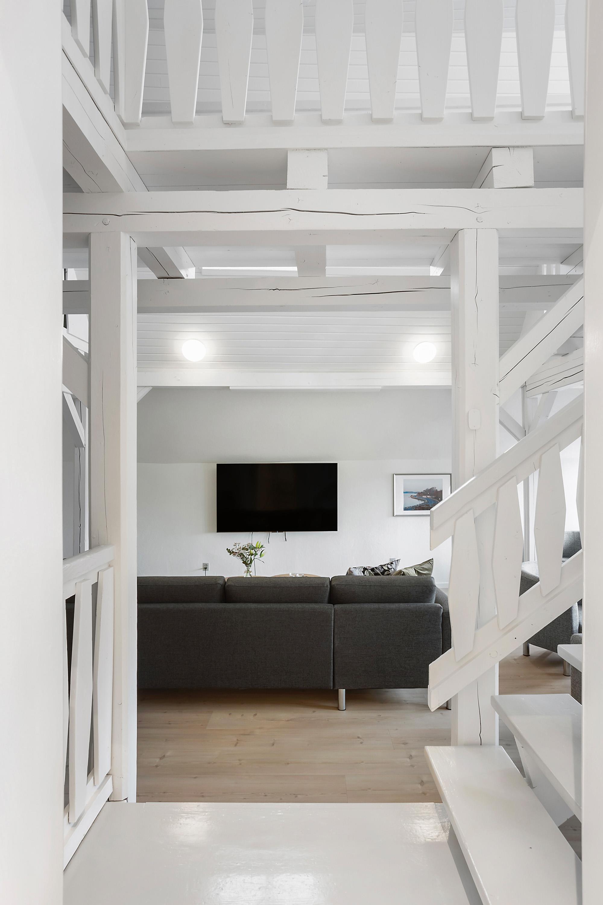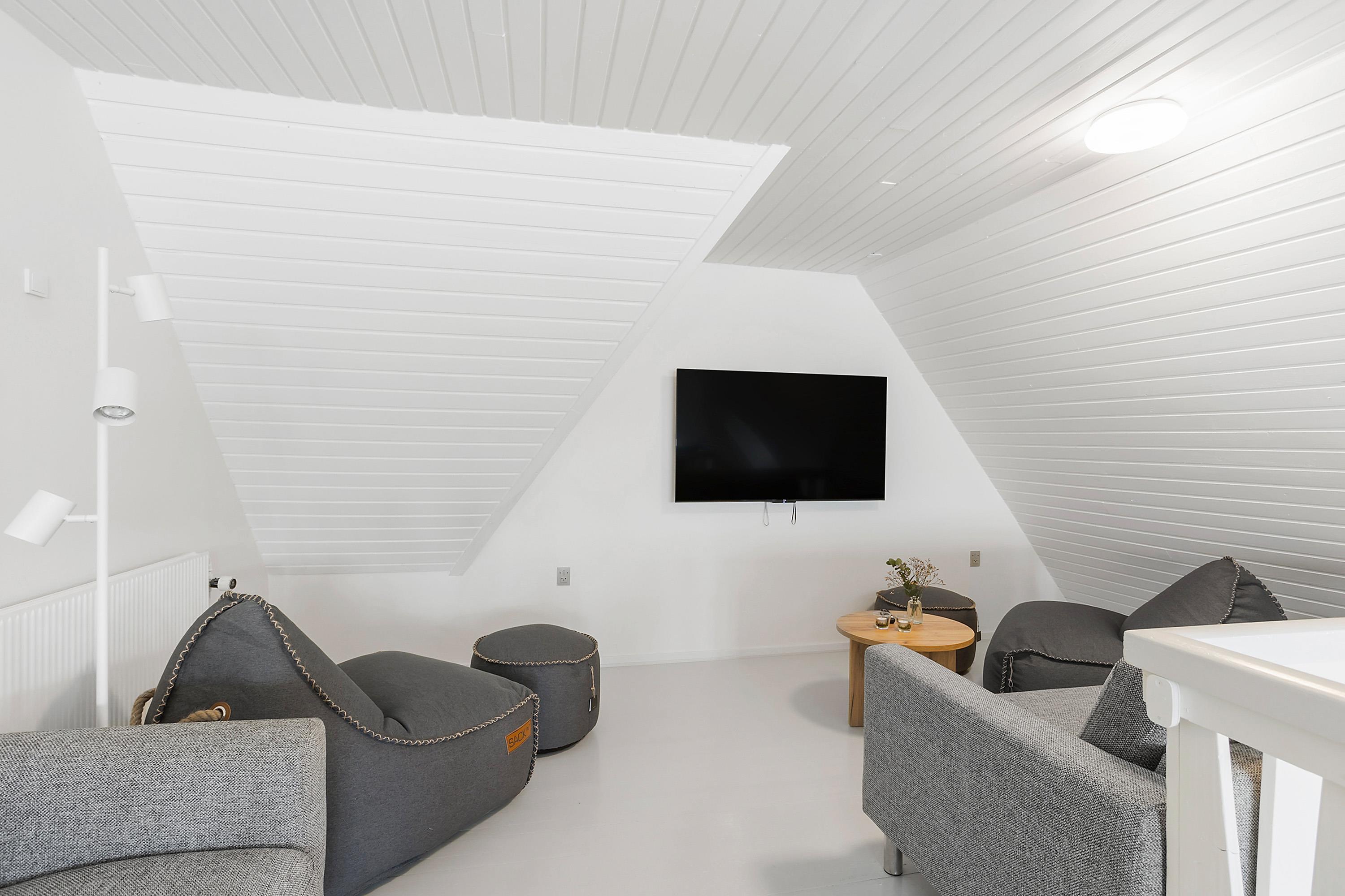 Das Haus besteht aus einer Eingangshalle, einer großen Küche mit Esszimmer und einem großen, charmanten Wohnzimmer mit sichtbaren Balken. Von hier gelangst du über eine offene Treppe in die Lounge-Ecke im ersten Stock mit Aussicht auf den Hvidkilde-See und in die TV-Hygge-Ecke, die ganz besonders von den jüngeren Familienmitgliedern genutzt wird. Zwei Toiletten sind direkt vom Wohnzimmer zu begehen.