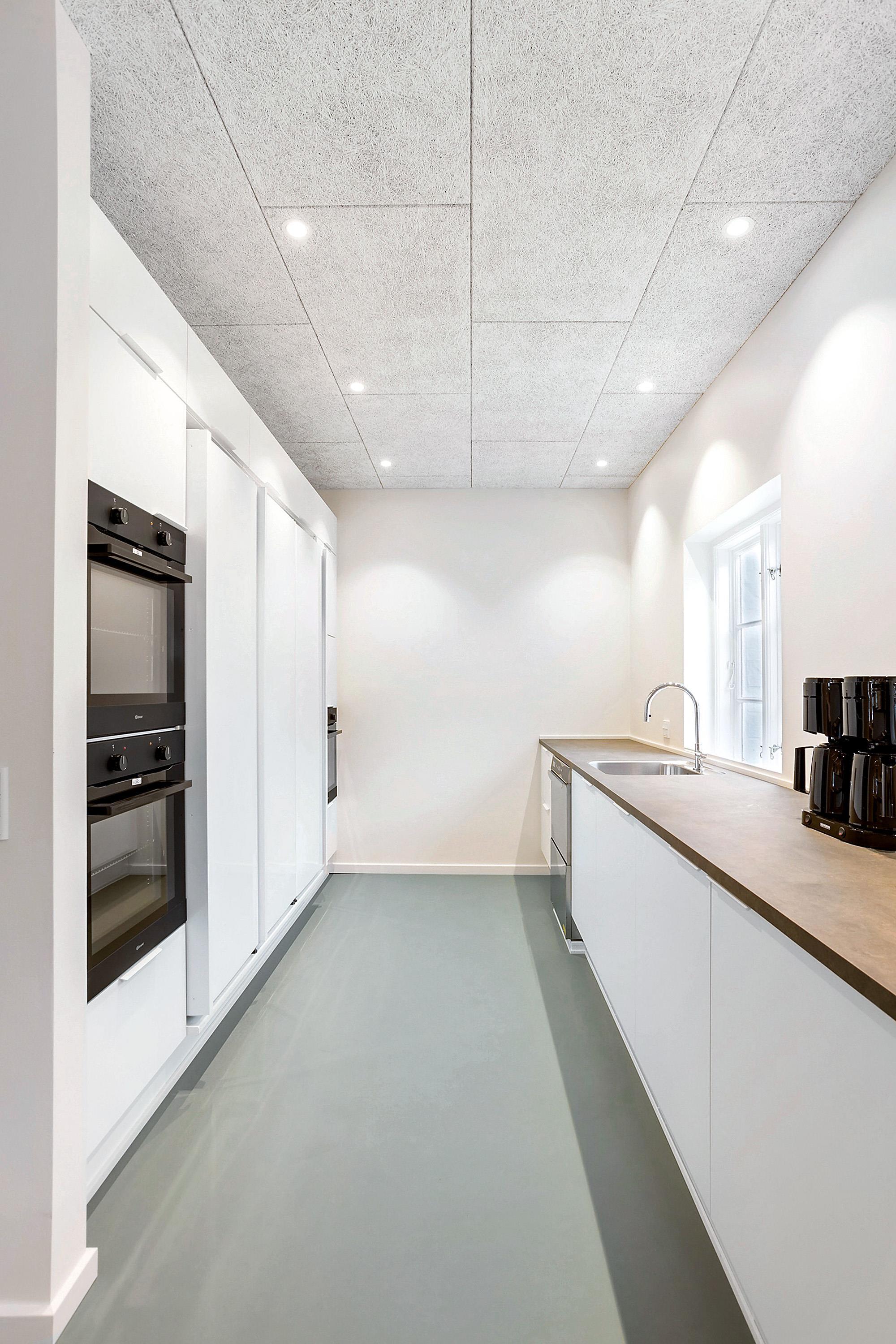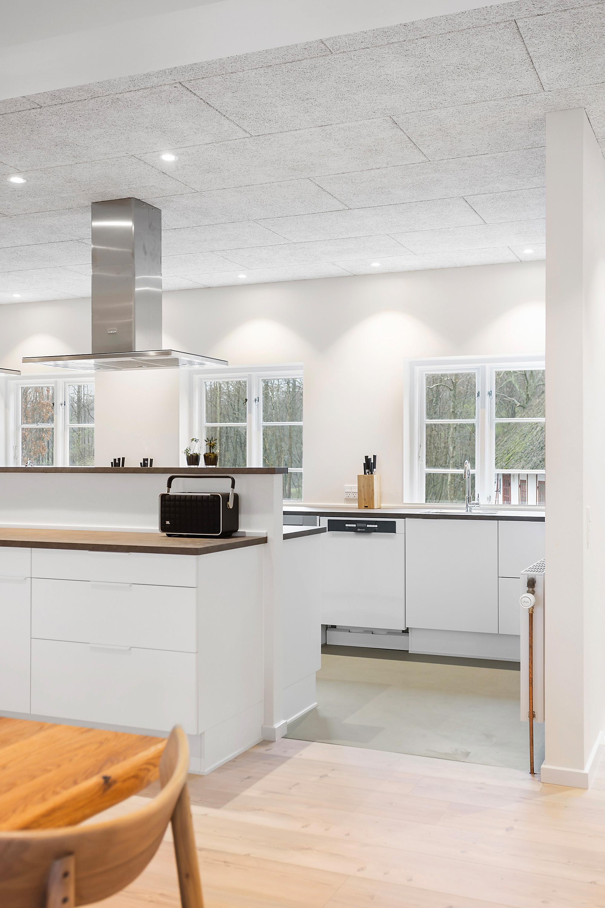 Der große Küchen-Gemeinschaftsraum mit Blick auf den See ist ausgestattet mit einer Svane-Küche mit großer Kücheninsel, die einlädt zum gemeinsamen Kochen und Raum für Gespräche bietet.