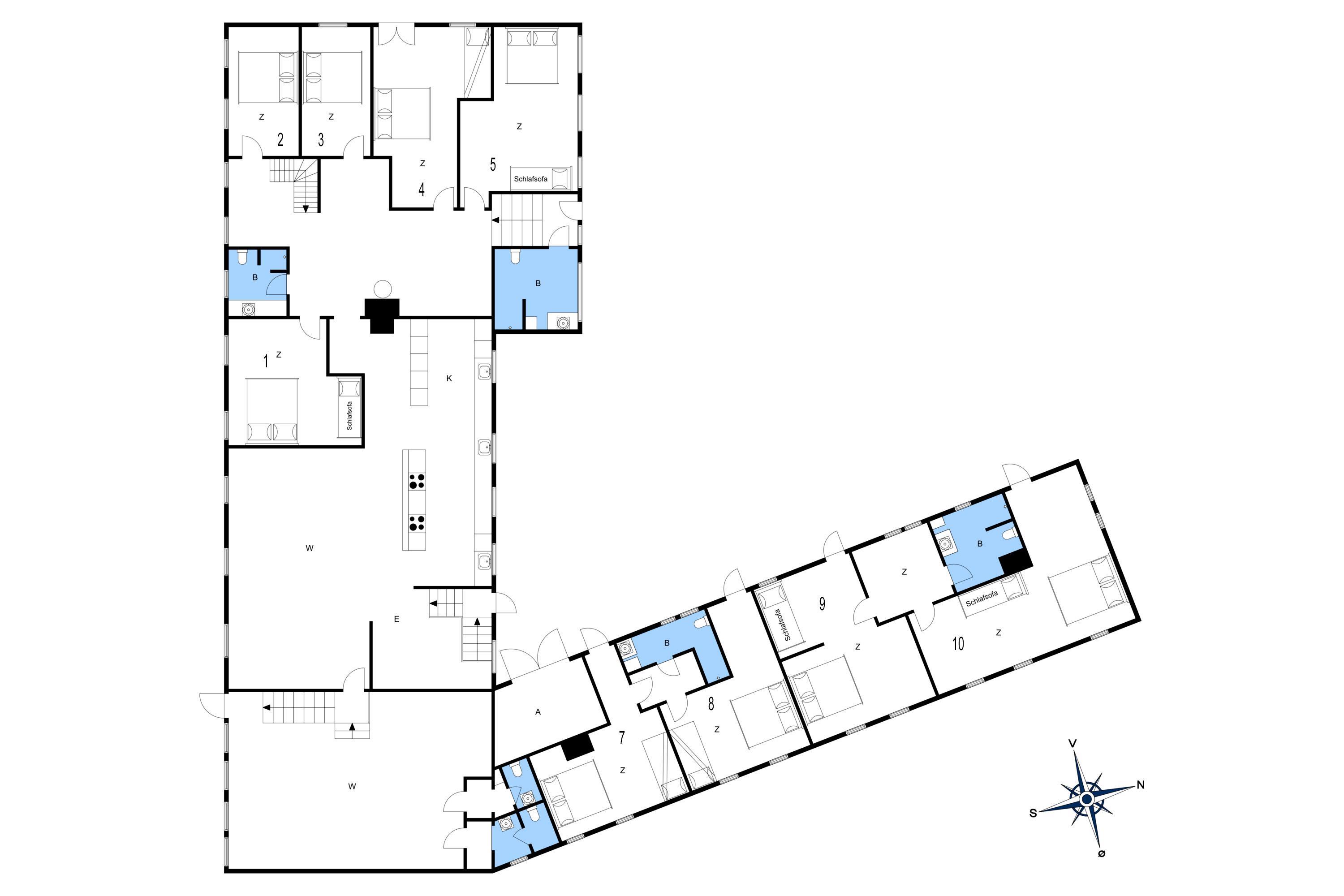Insgesamt 4 Zimmer sind ausgestattet mit Doppelbett und Schlafsofa, 3 Zimmer mit Doppelbett und Etagenbett und zwei Zimmer mit einem Doppelbett.