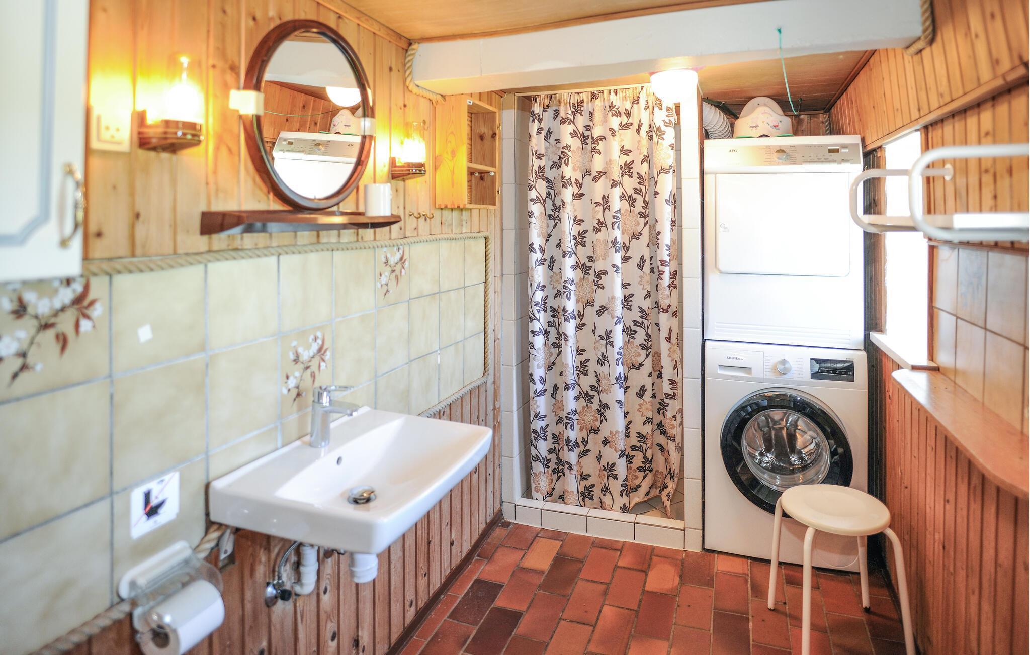 Verbringen Sie Zeit in dem traditionell eingerichteten Innenbereich mit viel Holz und schlicht-gemütlicher Ausstattung. Der kombinierte Wohn- und Essbereich ist mit bequemen Sitzmöbeln, einem Fernseher und einem großen Esstisch möbliert. In der separaten Küche mit klassischen Holzfronten finden Sie alles Notwendige für die Selbstverpflegung. Nutzen Sie die ruhige Atmosphäre für entspannte Stunden mit einem Buch oder Gesellschaftsspielen.