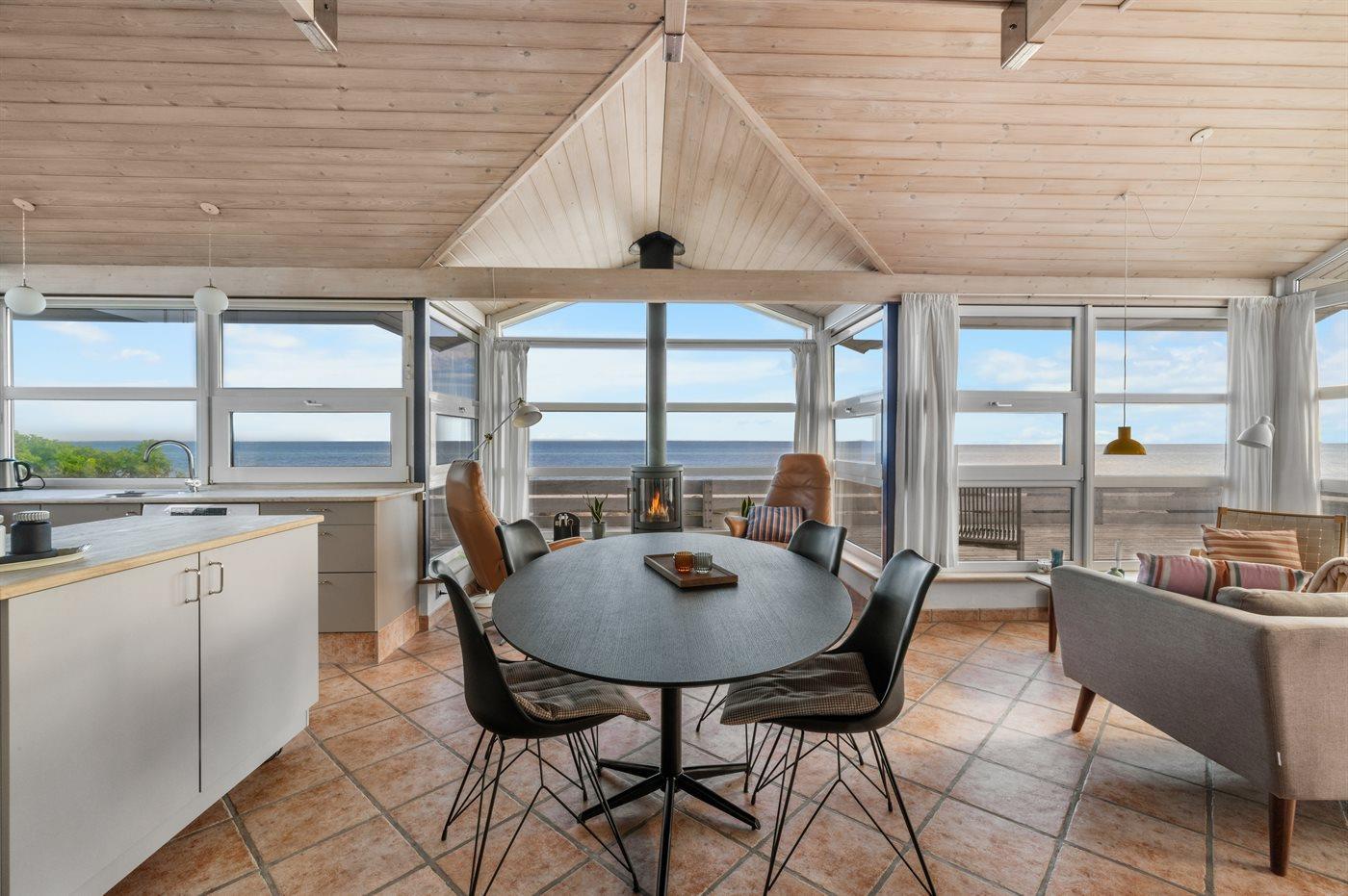 Schönes Ferienhaus direkt am Strand von Tørresø mit Meerblick, Terrasse und Kaminofen für entspannte Urlaubstage.