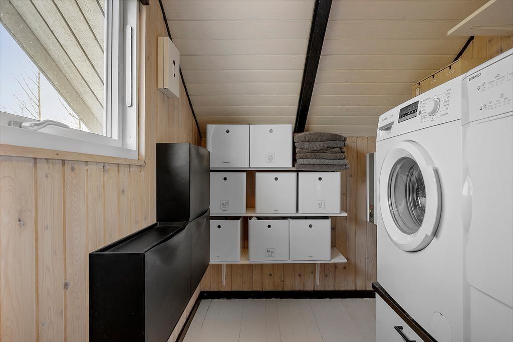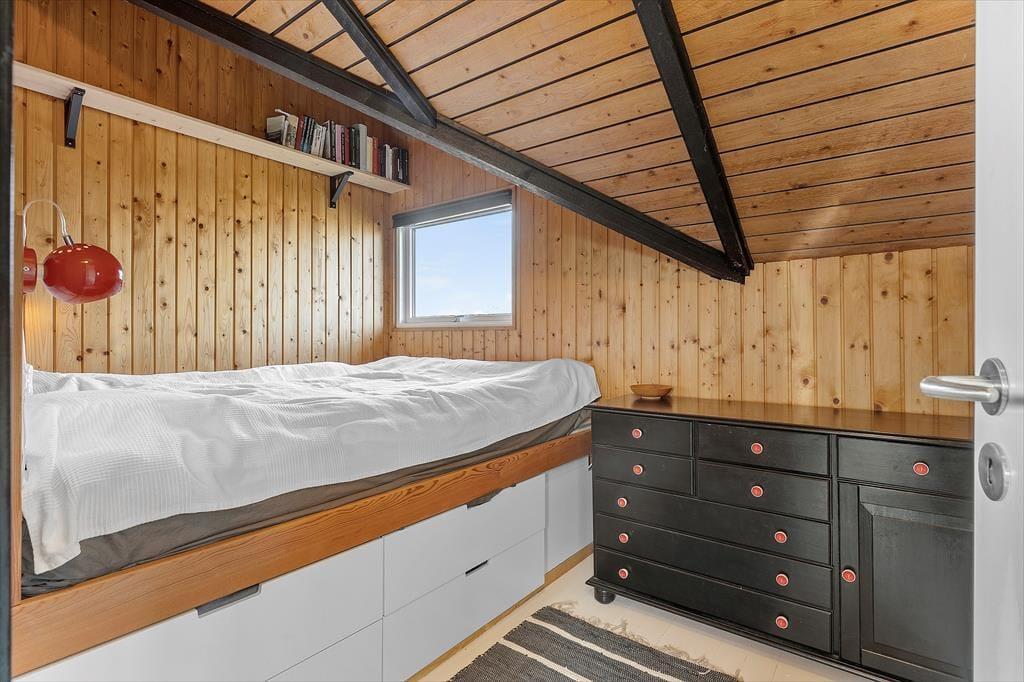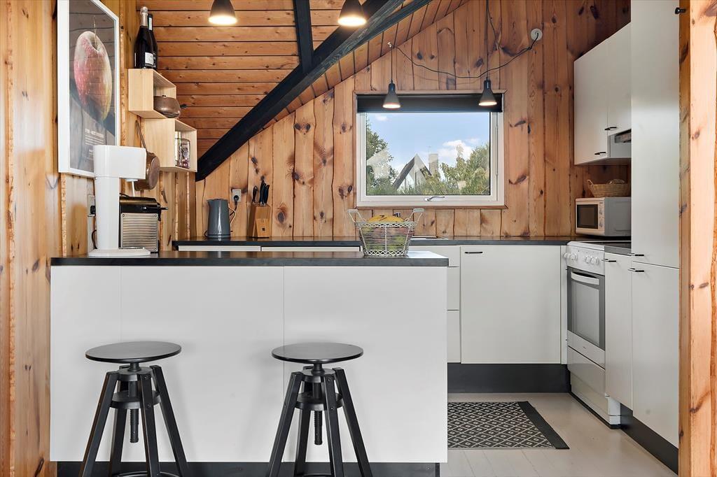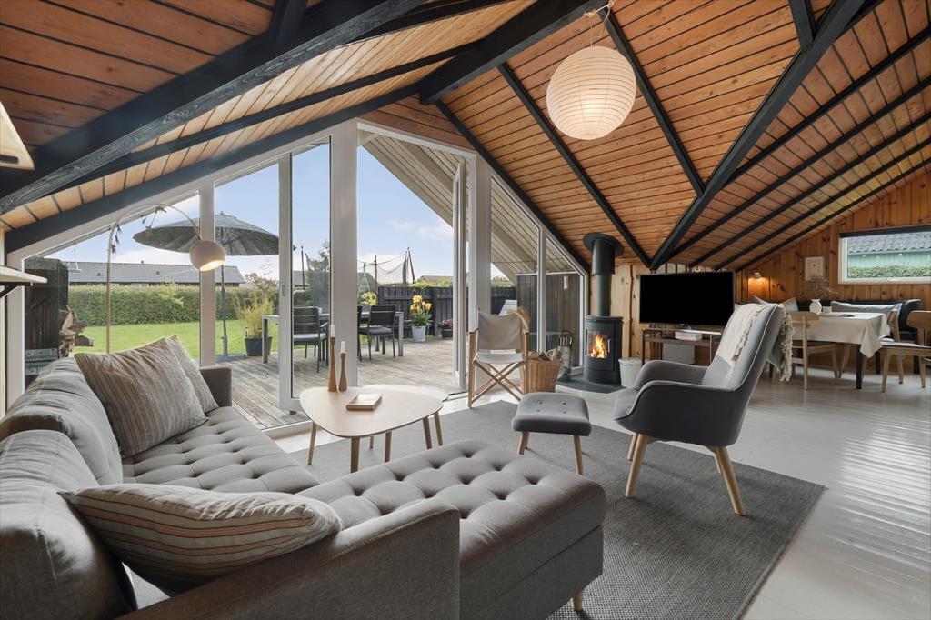 Wenn du dieses gemütliche Ferienhaus betrittst, empfängt dich eine warme und einladende Atmosphäre. Die sichtbaren Balken im ganzen Haus und die hohe Decke im großen offenen Wohnzimmer schaffen eine authentische Sommerhausstimmung. Das Wohnzimmer ist geräumig und hell, mit einem Holzofen als natürlichen Treffpunkt für gemütliche Abende mit Familie und Freunden. Die Küche ist offen zum Wohnbereich, was es einfach macht, zusammen zu sein, während Mahlzeiten zubereitet werden. Hier gibt es alles, was du brauchst, um köstliche Speisen zuzubereiten, und wenn es Zeit zum Essen ist, könnt ihr euch am Esstisch mit Blick auf den Garten niederlassen. Das Haus bietet auch ein schönes, helles Badezimmer, ausgestattet mit modernen Annehmlichkeiten, um den Tag frisch und ausgeruht zu beginnen.