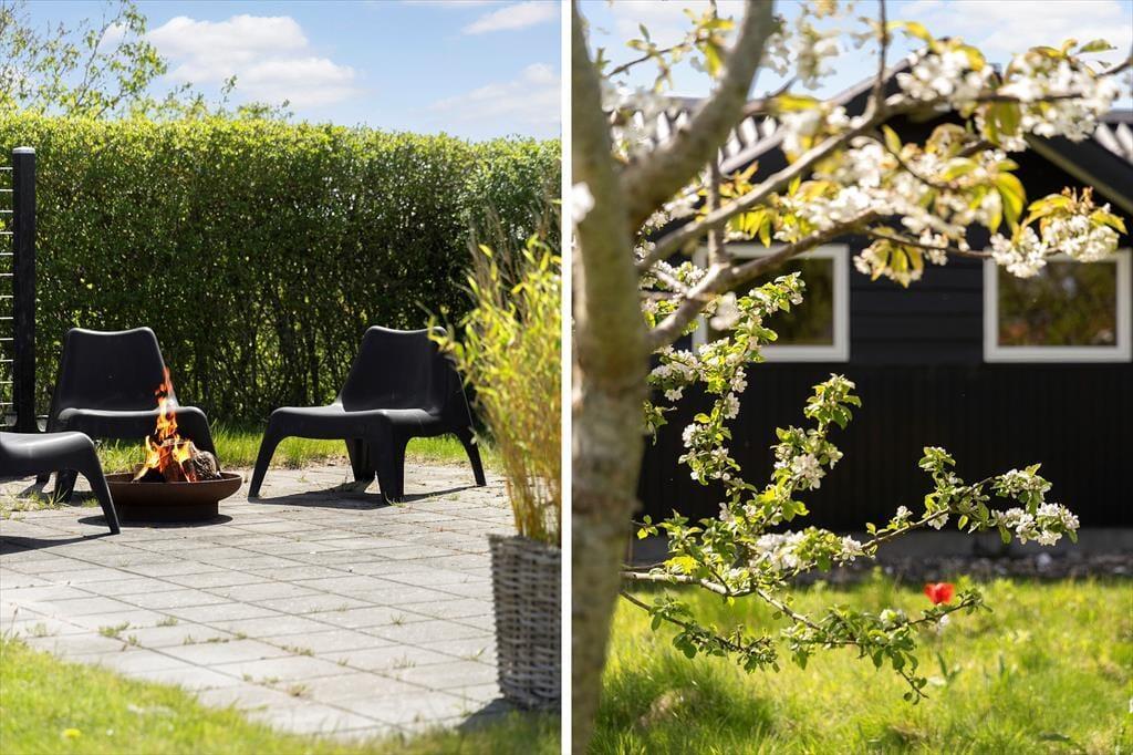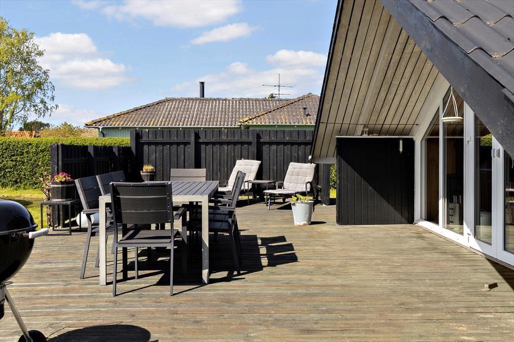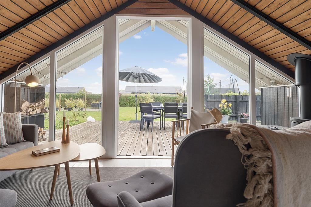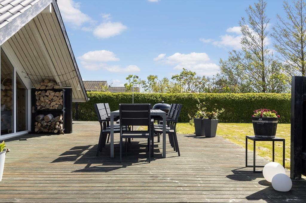 Die große, sonnige Holzterrasse rund um das Haus lädt perfekt zum Entspannen und gemütlichen Beisammensein im Freien ein. Hier kannst du den Morgenkaffee in der Sonne genießen, leckere Mahlzeiten grillen und an warmen Nachmittagen im Schatten ein Nickerchen machen. Der Garten, der an die Terrasse grenzt, ist uneinsehbar und grün, ideal zum Spielen für Kinder oder als friedlicher Ort für Erwachsene, um die Ruhe zu genießen. Du kannst die Vögel singen hören und die frische Brise vom Meer spüren, das nur einen kurzen Spaziergang vom Ferienhaus entfernt liegt. Hier ist Platz für Aktivitäten und Entspannung - vielleicht mit einem guten Buch oder einem Badmintonspiel auf dem Rasen.