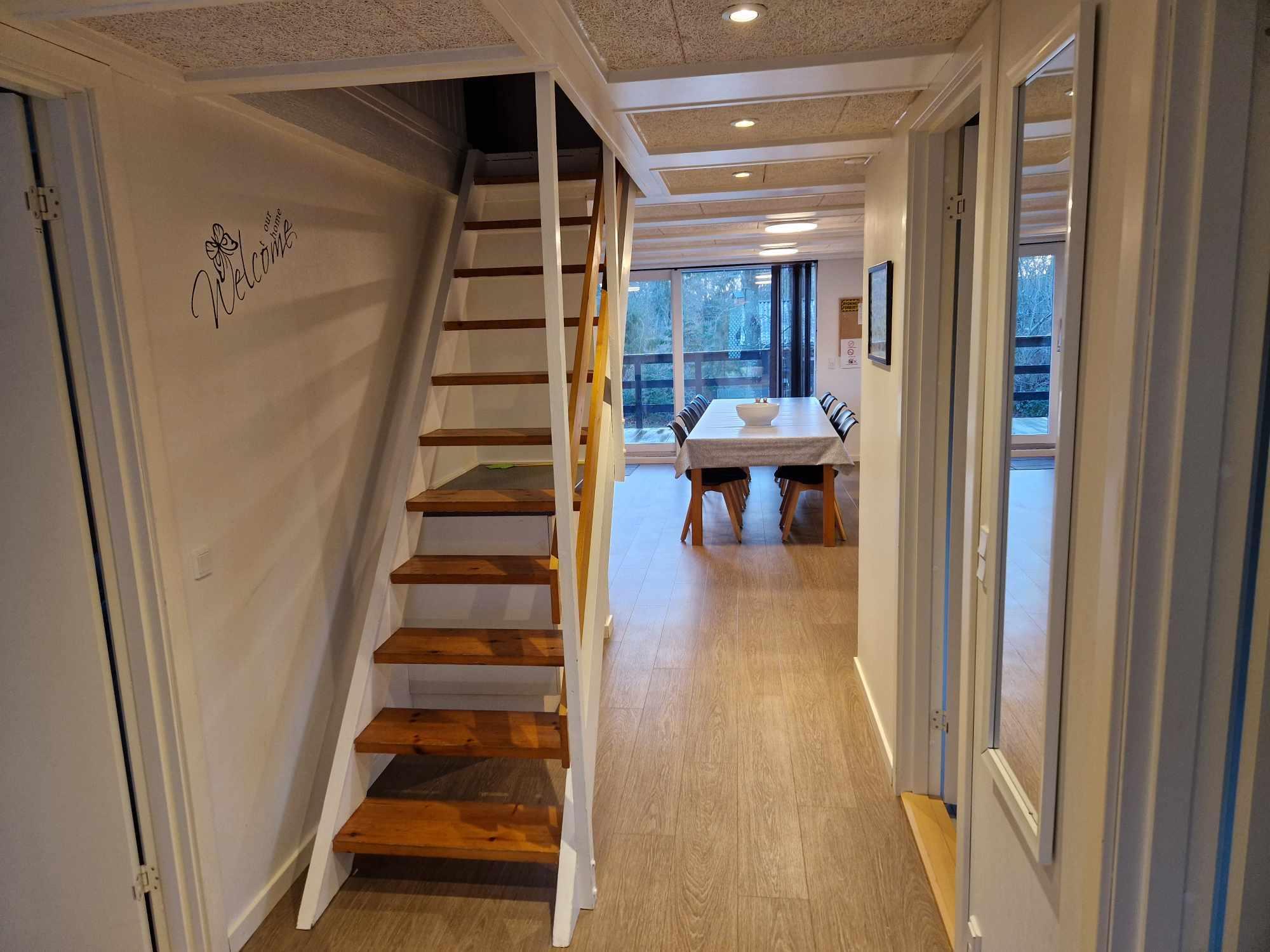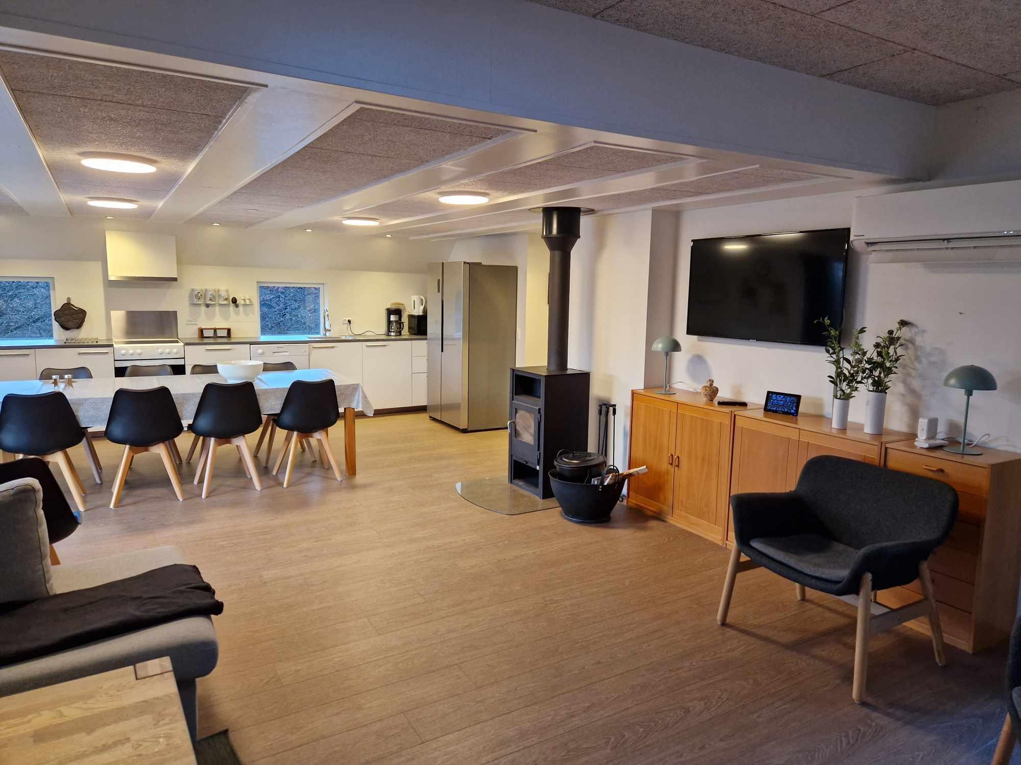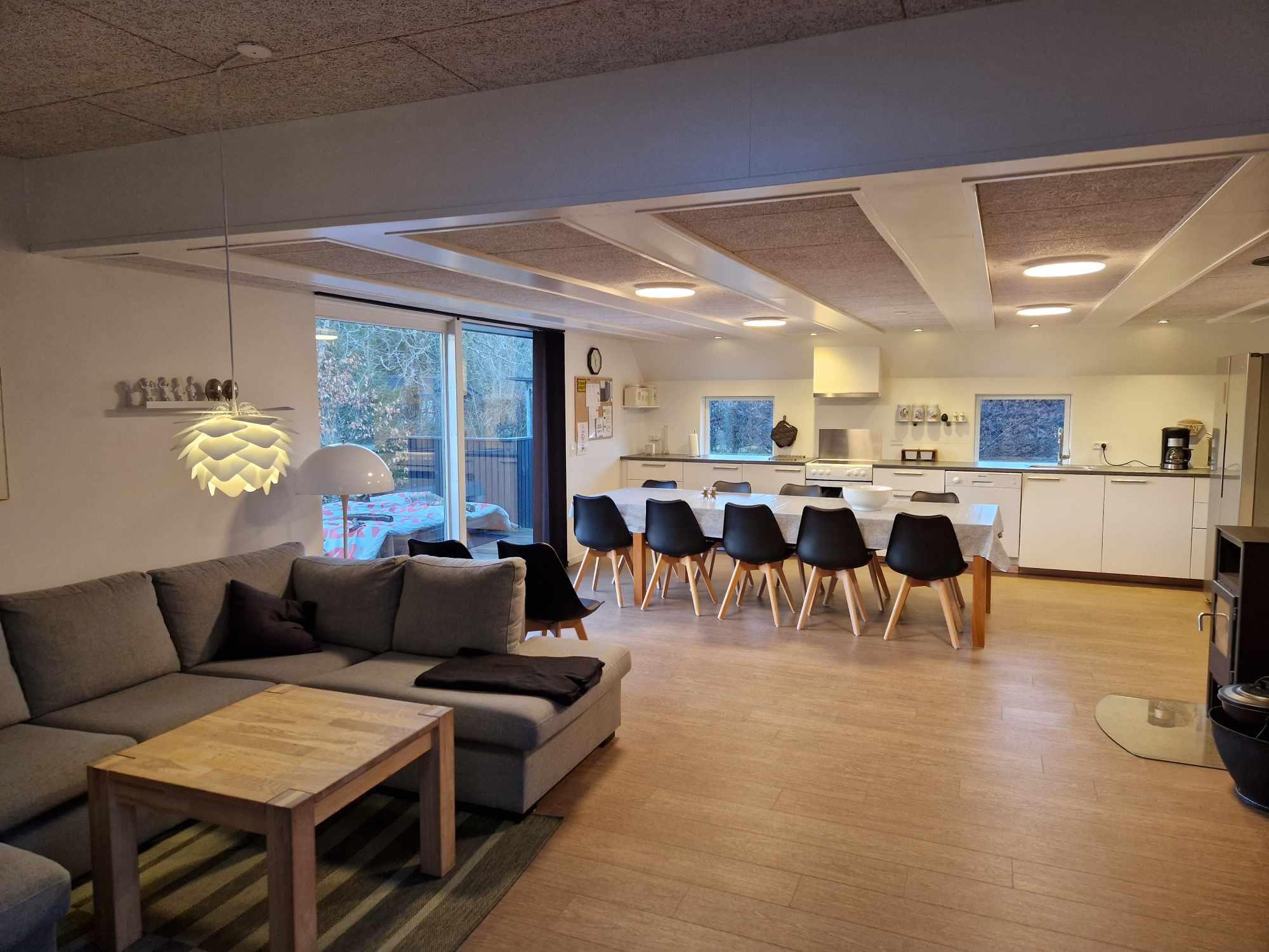 Das Haus verfügt über 5 Schlafzimmer (Zimmer 1: 1 x 140 cm Bett, Zimmer 2: 1 Doppelbett, Zimmer 3: 2 Etagenbetten, Zimmer 4: 2 Einzelbetten und Zimmer 5: 2 Einzelbetten), eine offene Küche mit Wohnzimmer und 2 Badezimmer. In einem der Zimmer ist ein Wickelplatz an der Wand angebracht. Das Haus verfügt über eine Wärmepumpe, einen Holzofen und Elektroheizung. Es gibt einen schönen, ungestörten Garten auf leicht hügeligem Gelände.