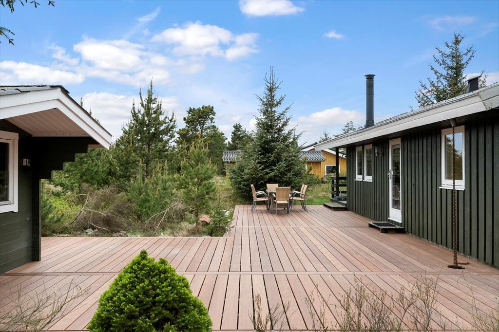 Das Ferienhaus liegt auf einem Doppelgrundstück mit viel Natur, Bäumen, Büschen, Heidekraut und Strandhafer in einer wunderbaren und charmanten Mischung. Vom Wohnzimmer wird die teilweise und abgeschirmte Terrasse betreten, aber auch zwischen Haupt- und Nebenhaus befindet sich ein großer Terrassenbereich mit Möglichkeiten zum Sonnen und Grillen.