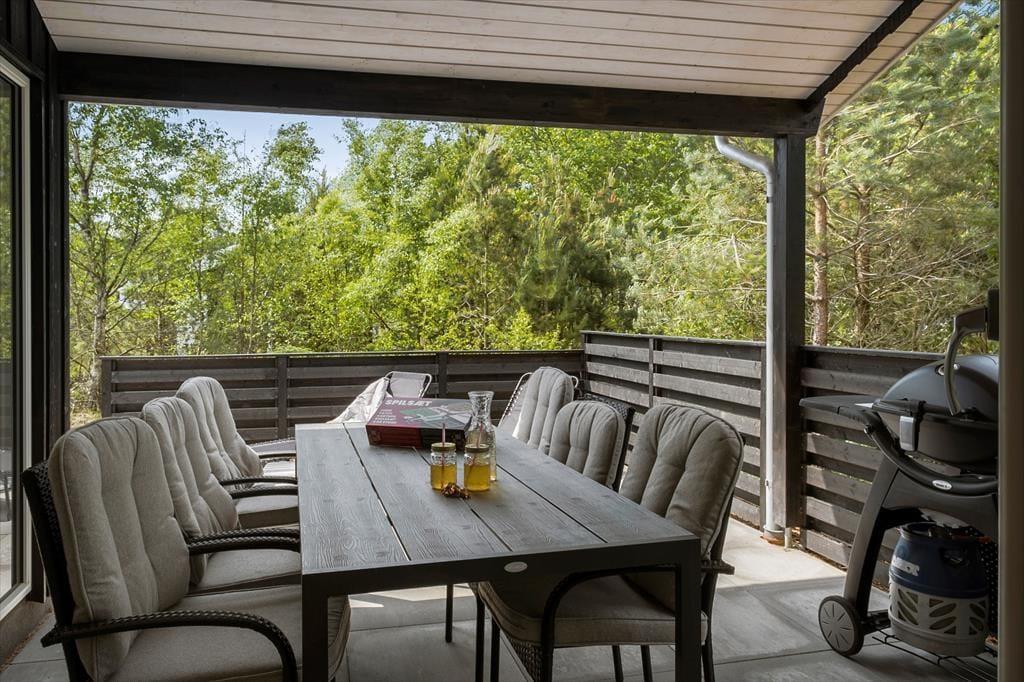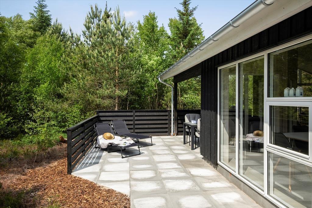Draußen erwartet dich ein ungestörtes Naturgrundstück mit viel Ruhe, Privatsphäre und Vogelgezwitscher – der perfekte Ort, um dem Alltag zu entfliehen. Zum Haus gehören mehrere schöne Terrassenbereiche: eine kleine Terrasse mit Caféset, auf der du morgens deinen Kaffee in der Sonne genießen kannst, sowie eine größere, teilweise überdachte Terrasse mit viel Platz zum Entspannen oder für Mahlzeiten an der frischen Luft. Je nach Wetter findest du hier Sonne, Schatten oder Windschutz – und kannst die Sommertage in friedlicher Umgebung genießen.