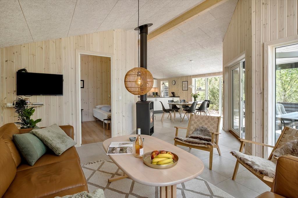 Dieses moderne Ferienhaus ist ein Neubau aus dem Jahr 2025 und präsentiert sich hell und einladend. Es ist mit drei gemütlichen Schlafzimmern, zwei Badezimmern sowie einem offenen Wohnbereich eingerichtet, in dem Küche, Essplatz und Wohnzimmer harmonisch ineinander übergehen. Hier gibt es viel Platz für gemeinsame Stunden – zu jeder Jahreszeit. An kühlen Tagen sorgt der gemütliche Kaminofen für eine behagliche Atmosphäre, während die Fußbodenheizung über eine Luft-Wasser-Wärmepumpe für ein angenehmes Raumklima und einen niedrigen Energieverbrauch sorgt. Der gesamte Verbrauch ist im Mietpreis enthalten – so brauchst du dir keine Gedanken über zusätzliche Kosten zu machen.