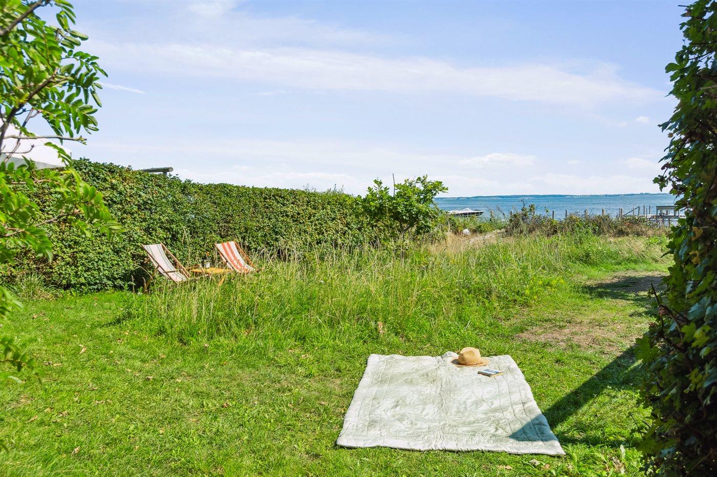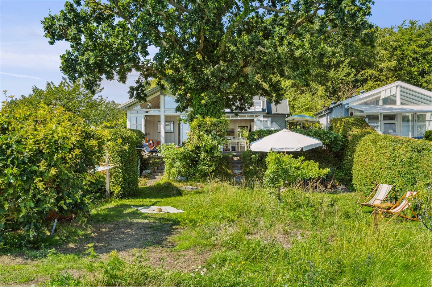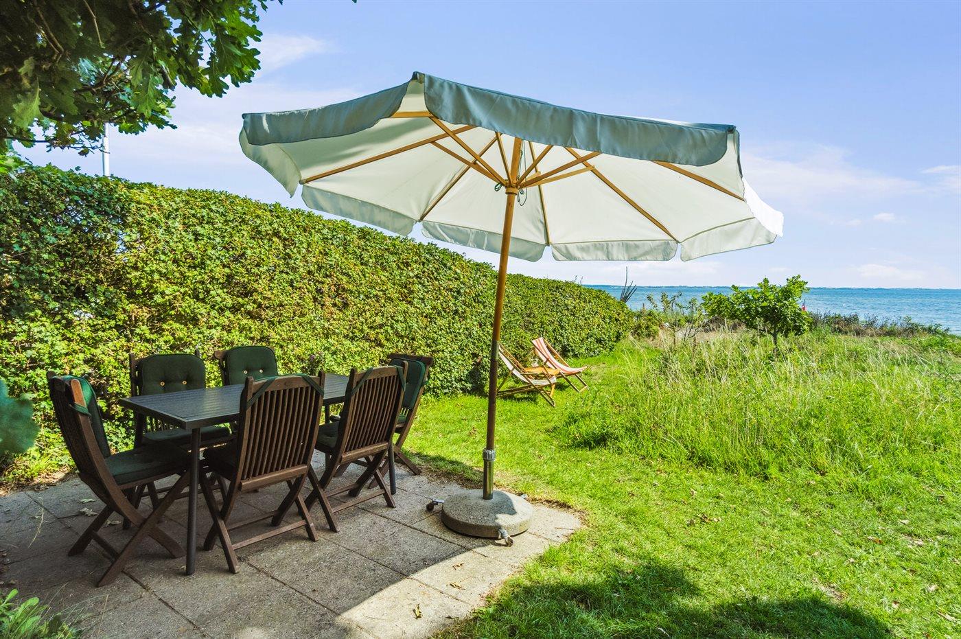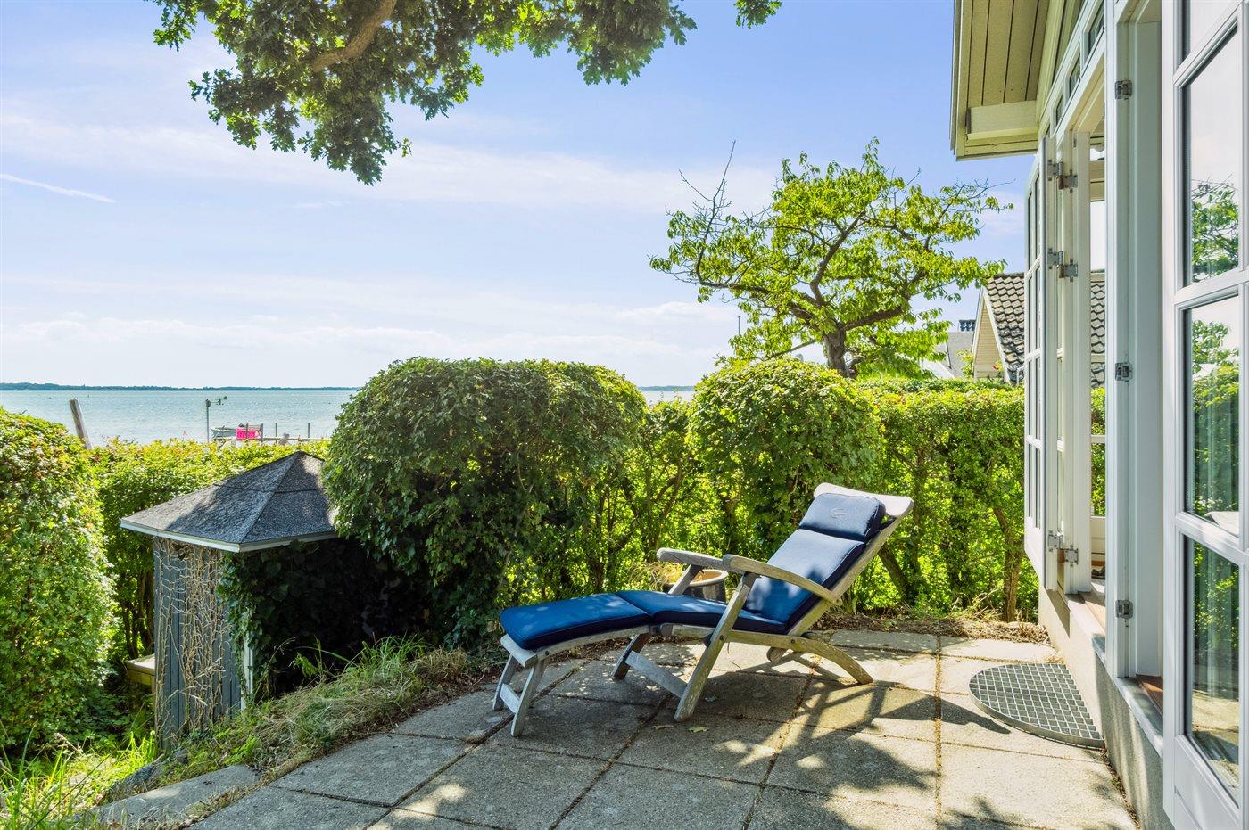 Sowohl vom Haus als auch von der nach Süden ausgerichteten Terrasse vor dem Haus aus kann man die Aussicht über das Gewässer zwischen Thurø und Tåsinge/Langeland genießen. Hinter dem Haus befindet sich ein gemütlicher Atriumgarten mit Zugang zum Gästehaus und zum Badezimmer des Hauses.