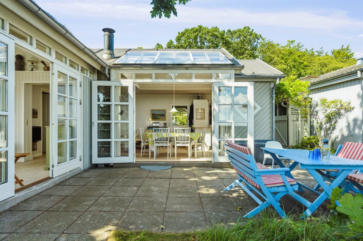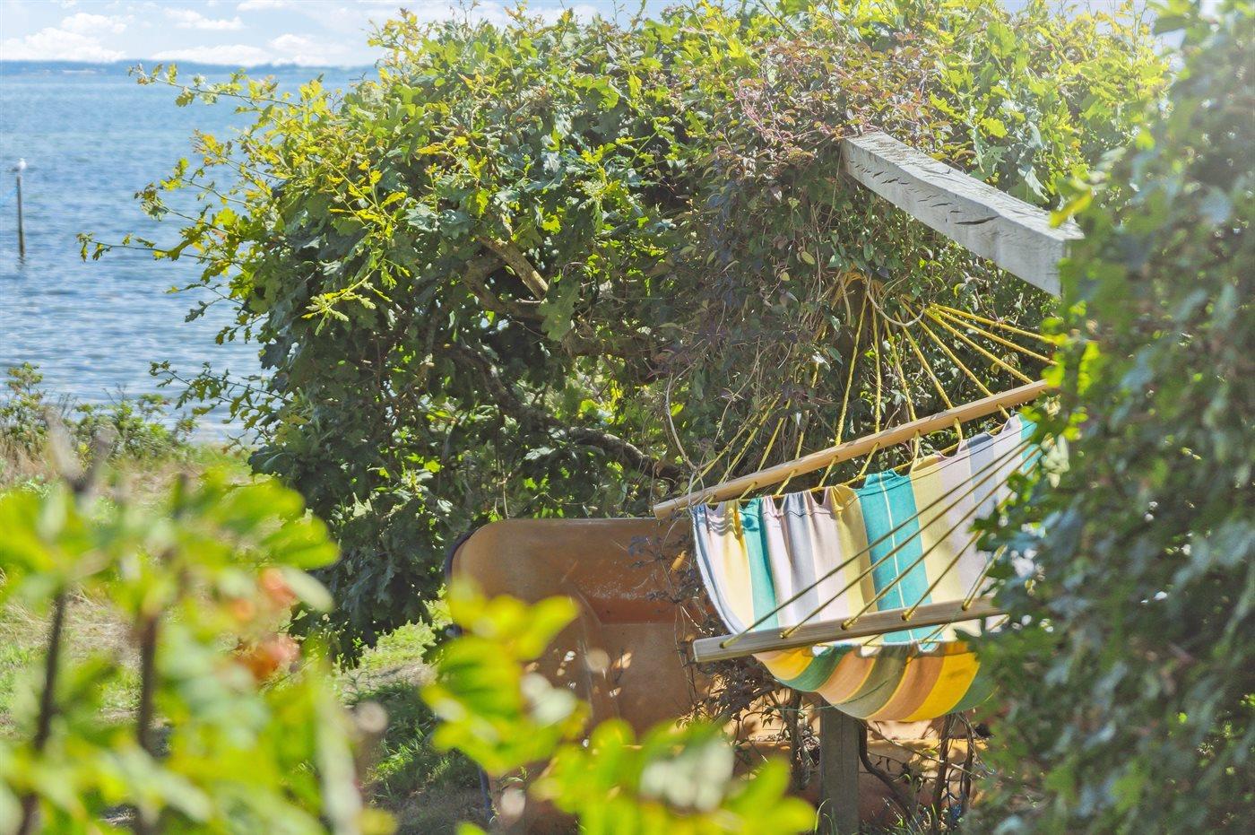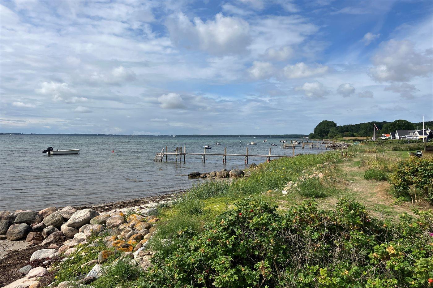 Sowohl vom Haus als auch von der nach Süden ausgerichteten Terrasse vor dem Haus aus kann man die Aussicht über das Gewässer zwischen Thurø und Tåsinge/Langeland genießen. Hinter dem Haus befindet sich ein gemütlicher Atriumgarten mit Zugang zum Gästehaus und zum Badezimmer des Hauses.