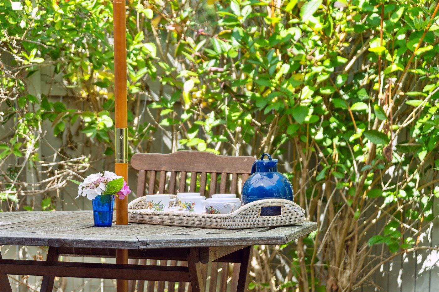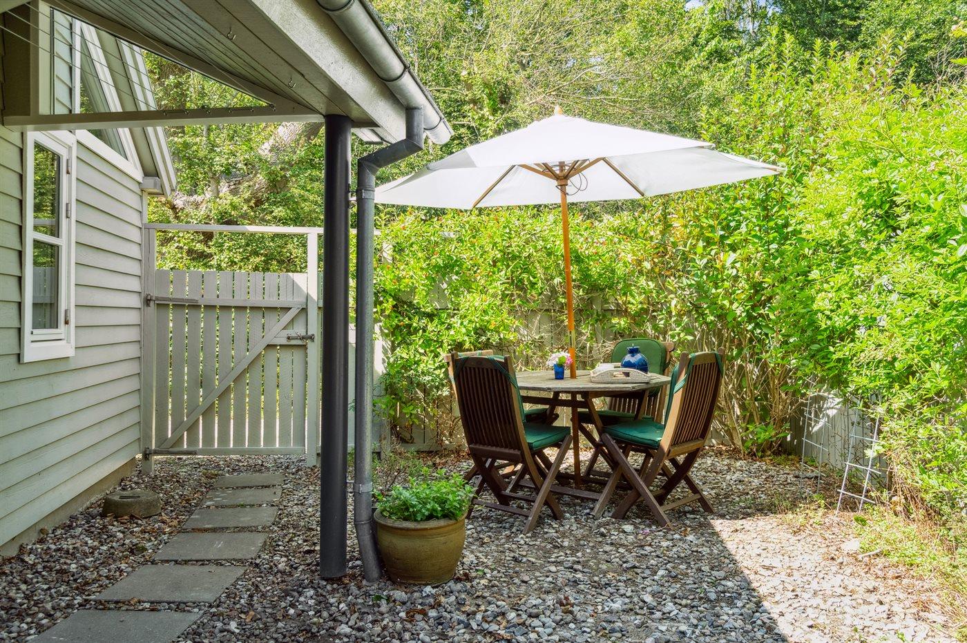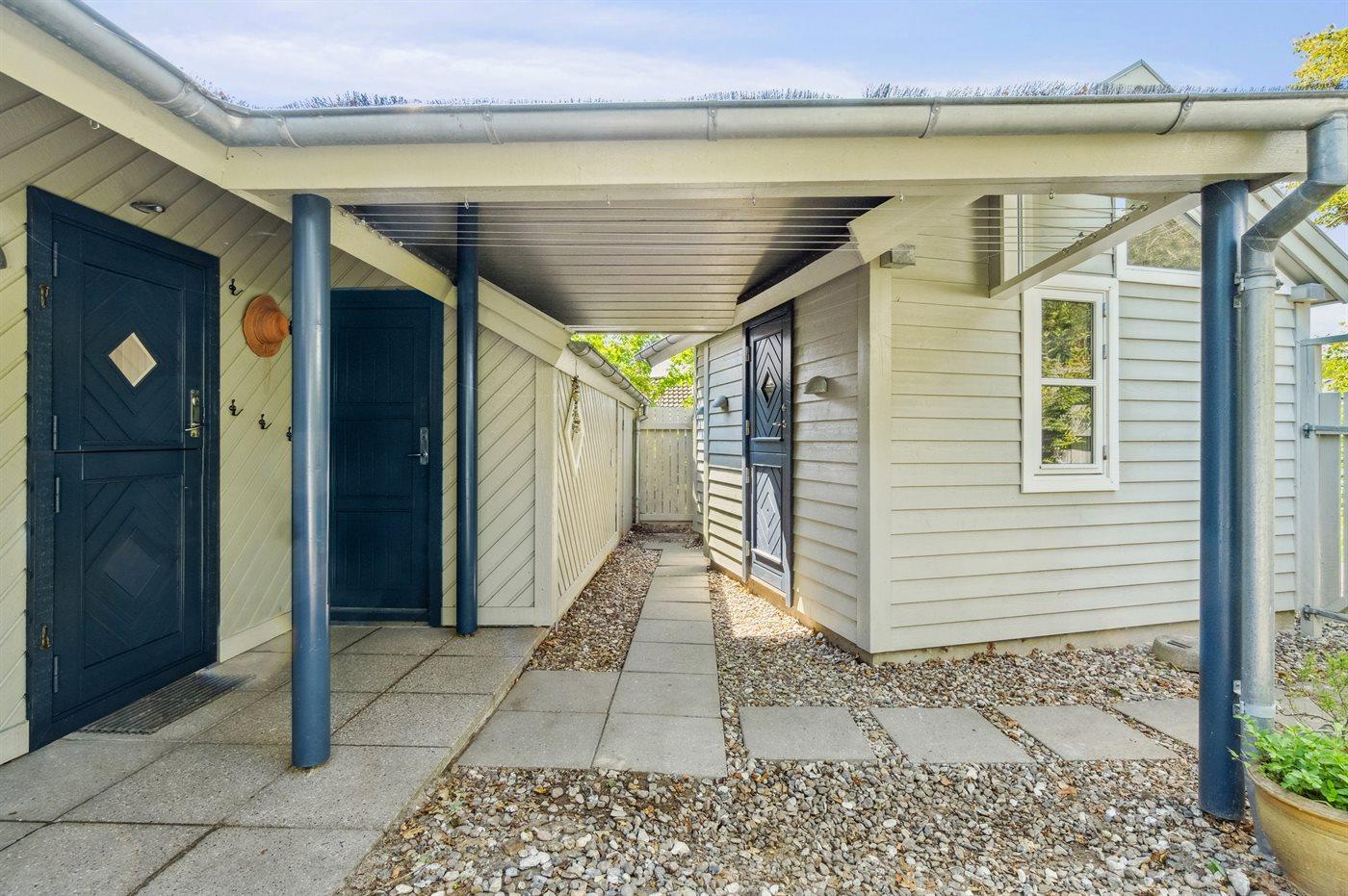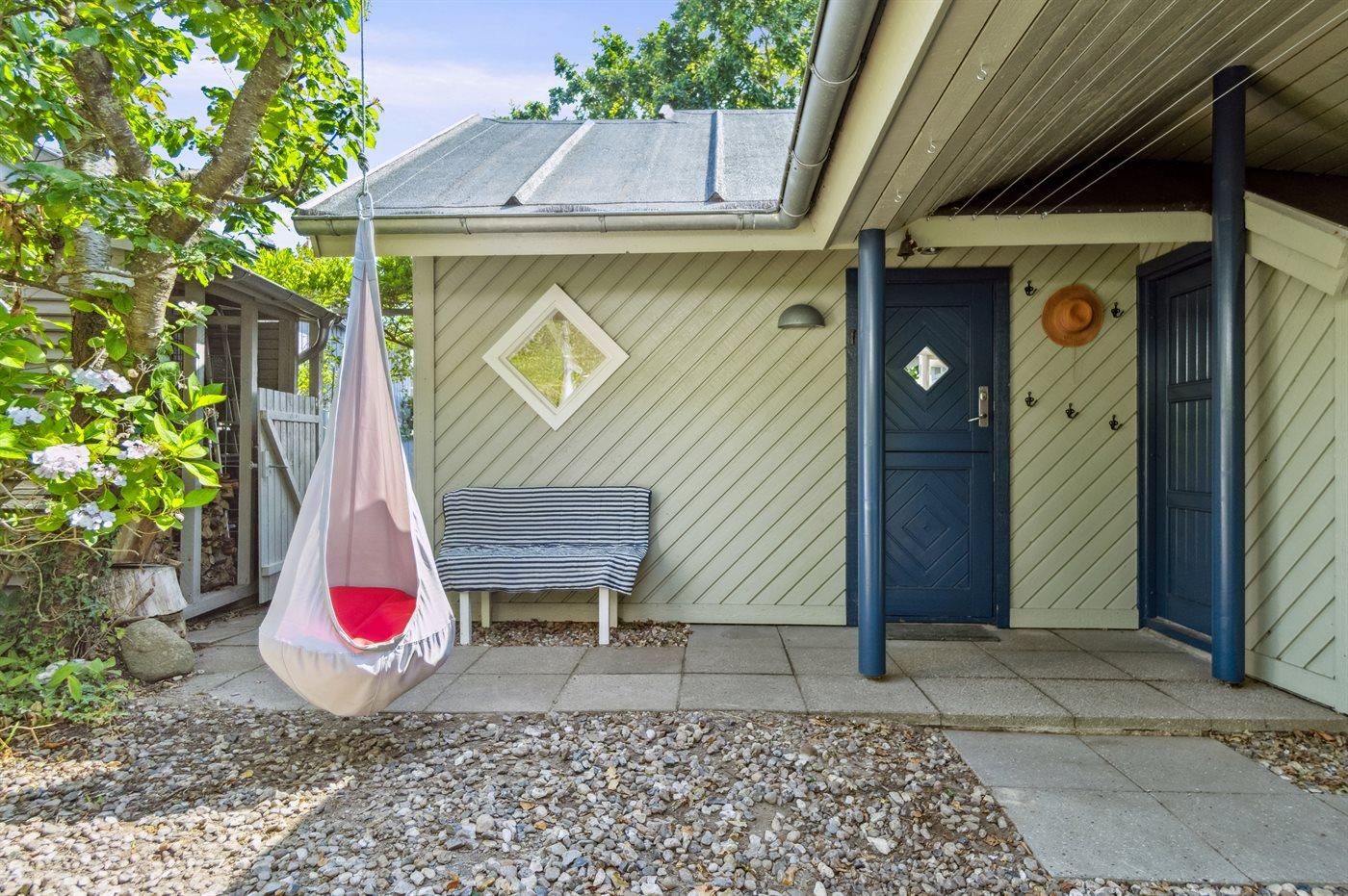 Sowohl vom Haus als auch von der nach Süden ausgerichteten Terrasse vor dem Haus aus kann man die Aussicht über das Gewässer zwischen Thurø und Tåsinge/Langeland genießen. Hinter dem Haus befindet sich ein gemütlicher Atriumgarten mit Zugang zum Gästehaus und zum Badezimmer des Hauses.