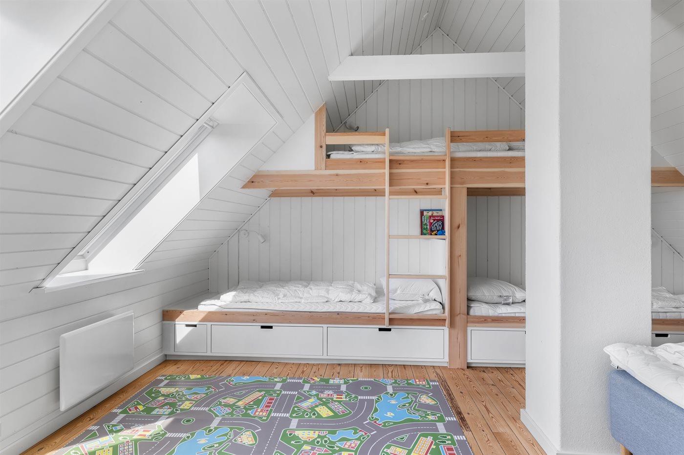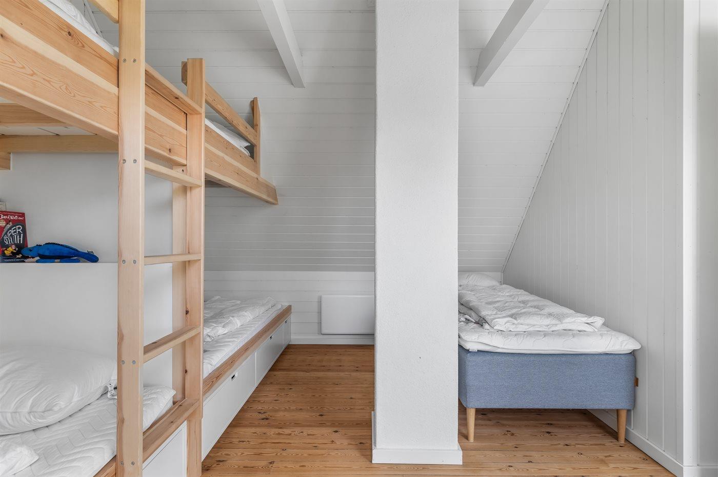 Die Schlafplätze verteilen sich auf 3 Schlafräume. 2 Schlafplätze in einem Doppelbett. 3 Schlafplätze in Einzelbetten. 3 Schlafplätze in Etagenbetten. Ferner steht ein Kinderbett zur Verfügung.