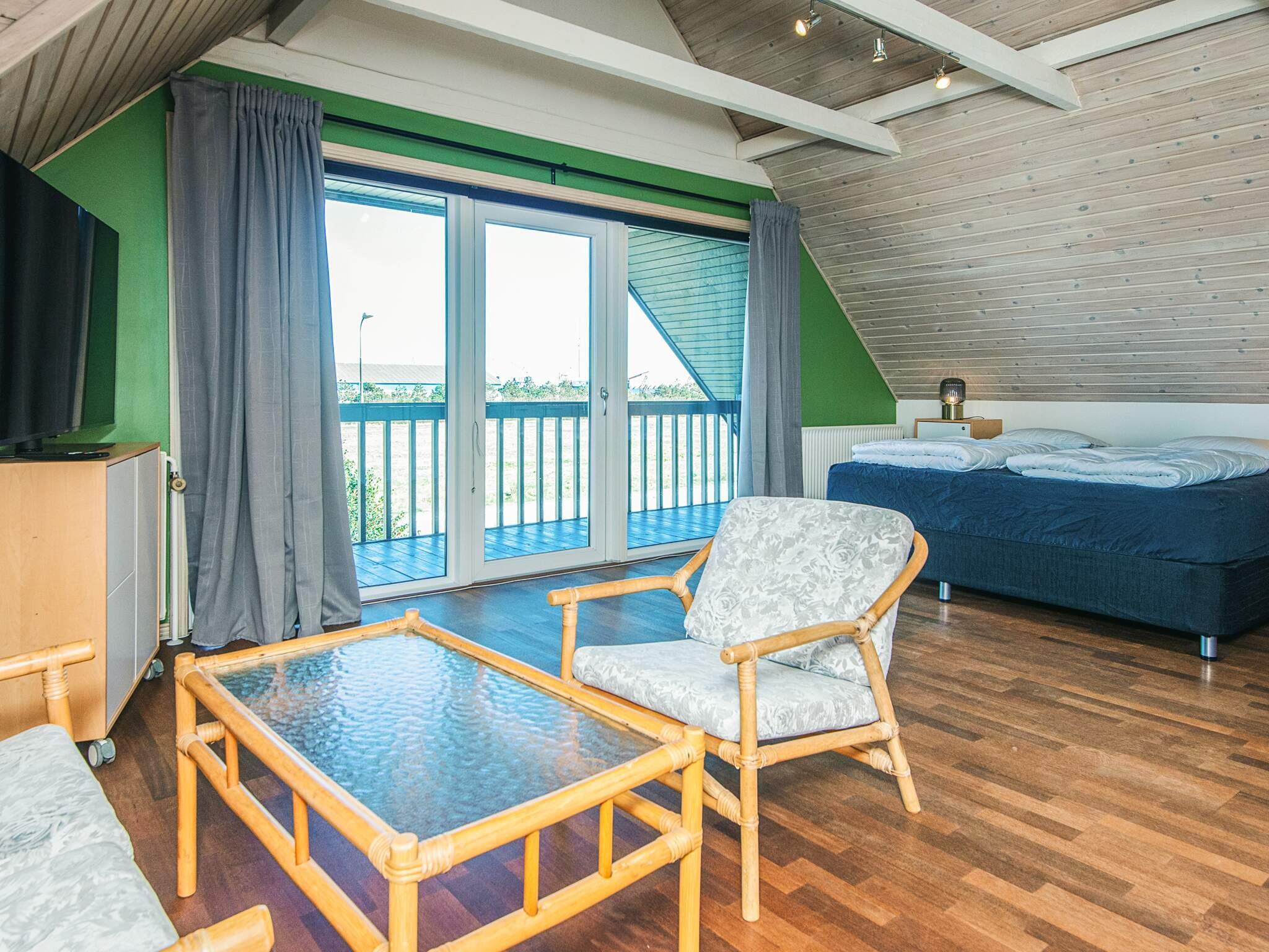 Im ersten Stock befinden sich vier Schlafzimmer, eines mit zwei Einzelbetten, zwei Zimmer mit Doppelbetten und ein Zimmer mit einem Doppelbett und einem Schlafsofa für zwei Personen. Angrenzender Balkon lädt zum Morgenkaffee mit Blick auf die Umgebung ein. Dieses Schlafzimmer verfügt außerdem über einen Fernseher mit deutschen und kostenlosen dänischen Sendern.
