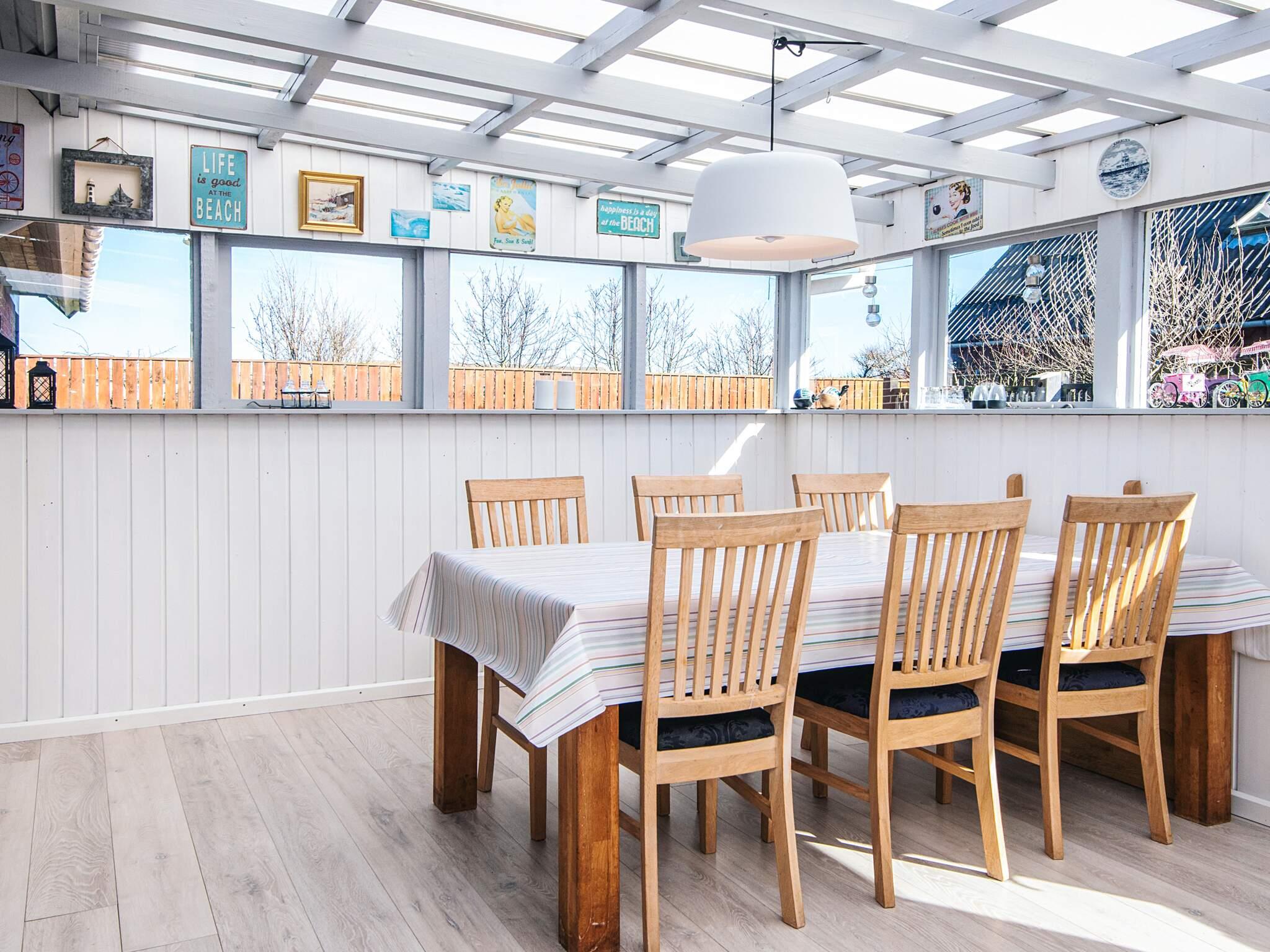 Wintergarten mit Barbereich und Esstisch sowie Zugang zur Hausterrasse.