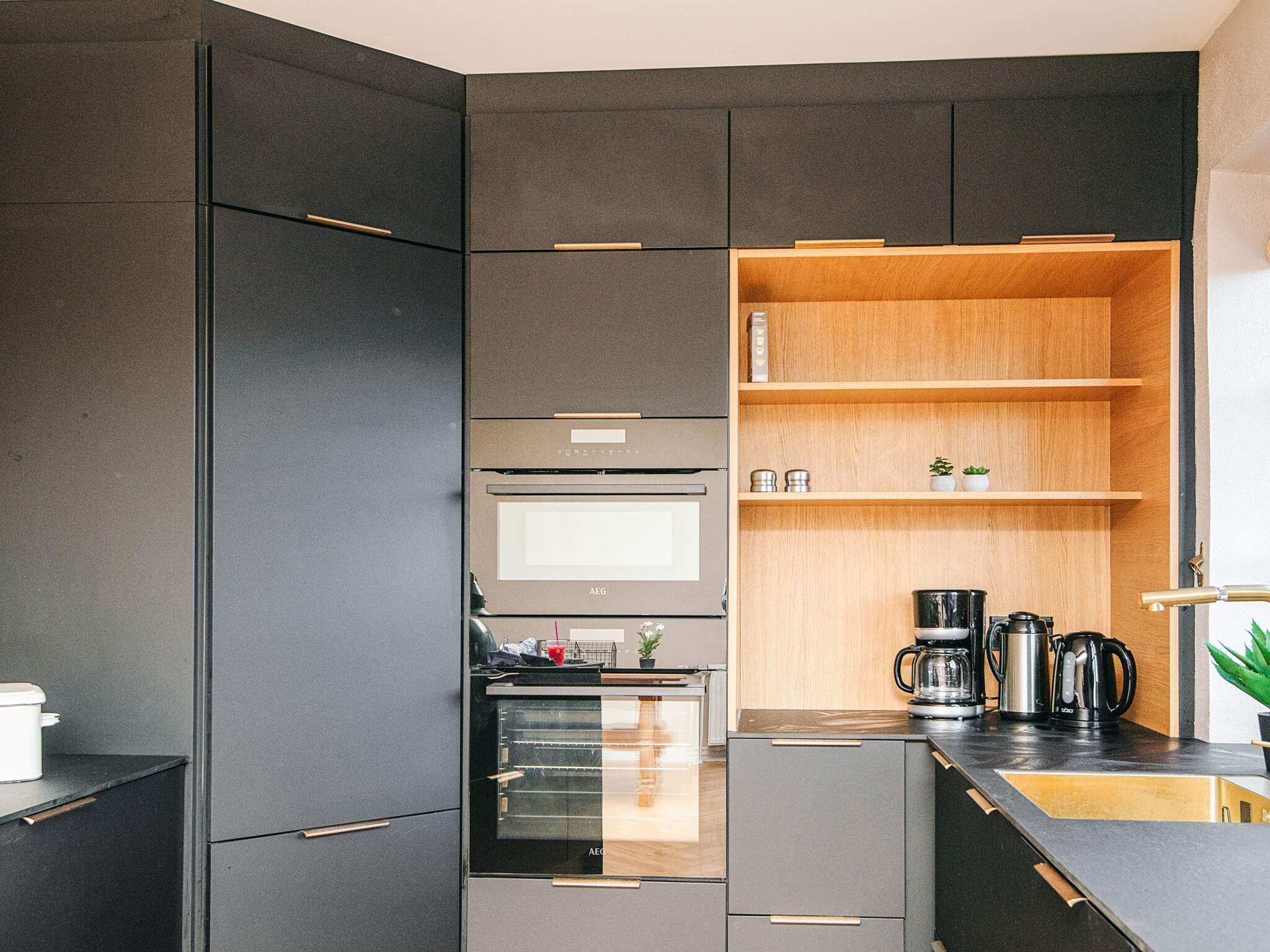 Küche: Hochstuhl, Ofen, Kühl-Gefrier-Kombi, Mikrow., induktionskomfur, Kaffeem., Spülm.