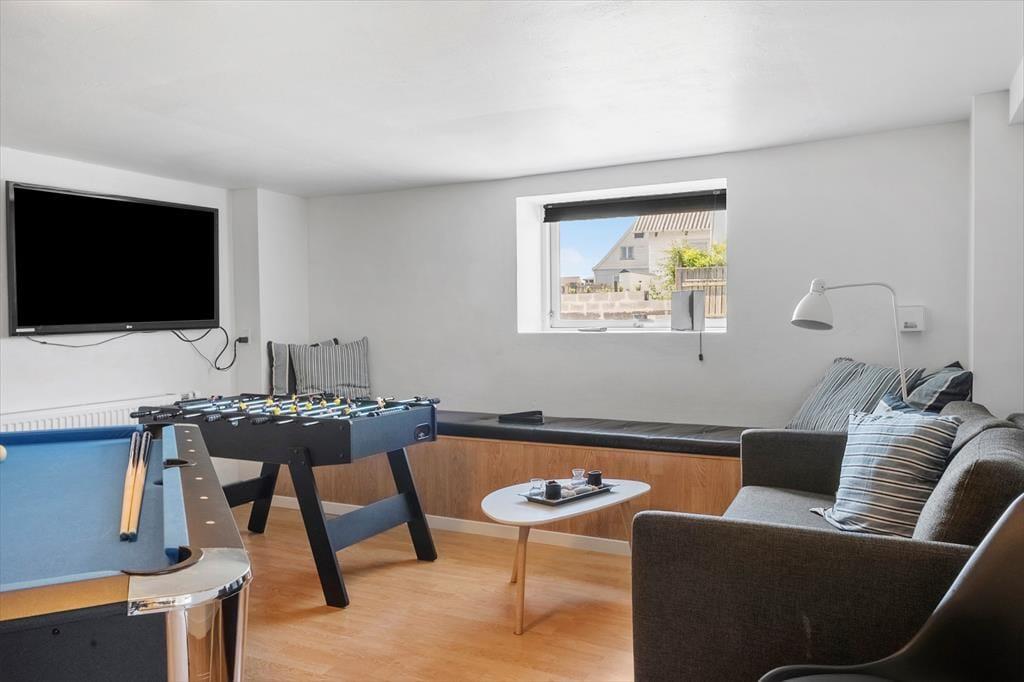 Beim Betreten des Hauses wirst du sofort von der hellen und einladenden Atmosphäre empfangen. Die Einrichtung ist geschmackvoll und funktional zugleich – und du merkst schnell, dass man sich hier sofort wohlfühlt. Im Erdgeschoss befinden sich eine schöne, offene Küche und ein gemütlicher Wohnbereich, in dem sich die Familie zum Kochen, Spielen oder zu langen Gesprächen versammeln kann. Über die Treppe gelangst du in das Obergeschoss, wo dich weitere Möglichkeiten erwarten – unter anderem ein Aktivitätsraum mit Tischkicker und Billardtisch, der garantiert für Begeisterung bei Kindern und Erwachsenen sorgt. Die Einrichtung ist ruhig und harmonisch, und es gibt ausreichend Platz für alle – ob du nun eine eigene Ecke suchst oder gemeinsam Zeit mit deinen Liebsten verbringen möchtest.