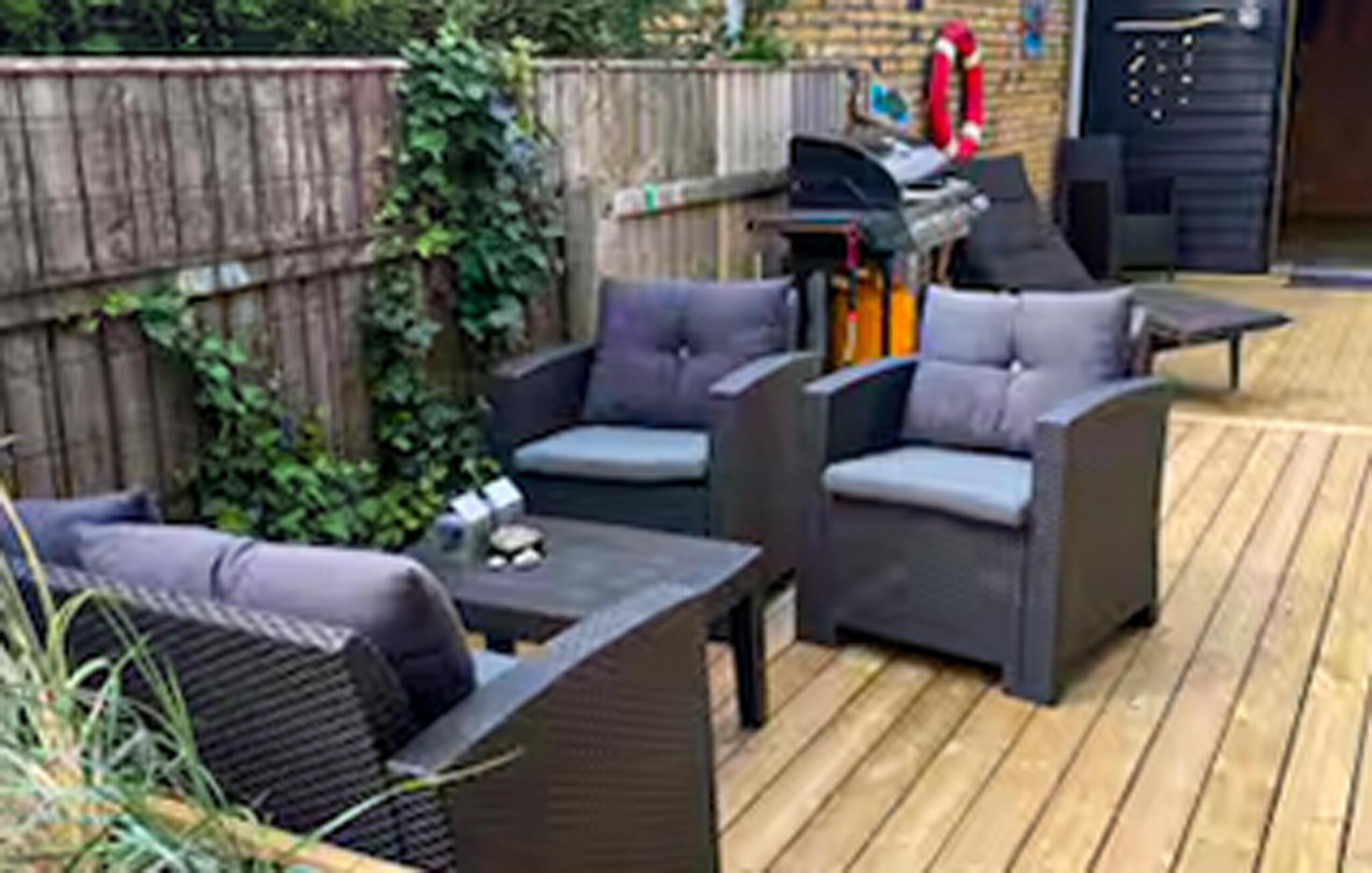 Bewegen Sie sich hinaus auf die große Holzterrasse, die mit komfortablen Loungemöbeln und mehreren Sitzbereichen gestaltet ist. Genießen Sie Ihren Morgenkaffee im Freien oder veranstalten Sie einen entspannten Grillabend an der frischen Luft. Nutzen Sie die Sonnenliegen und verweilen Sie in der geschützten Lage des Gartens, während Sie den Tag in aller Ruhe ausklingen lassen.