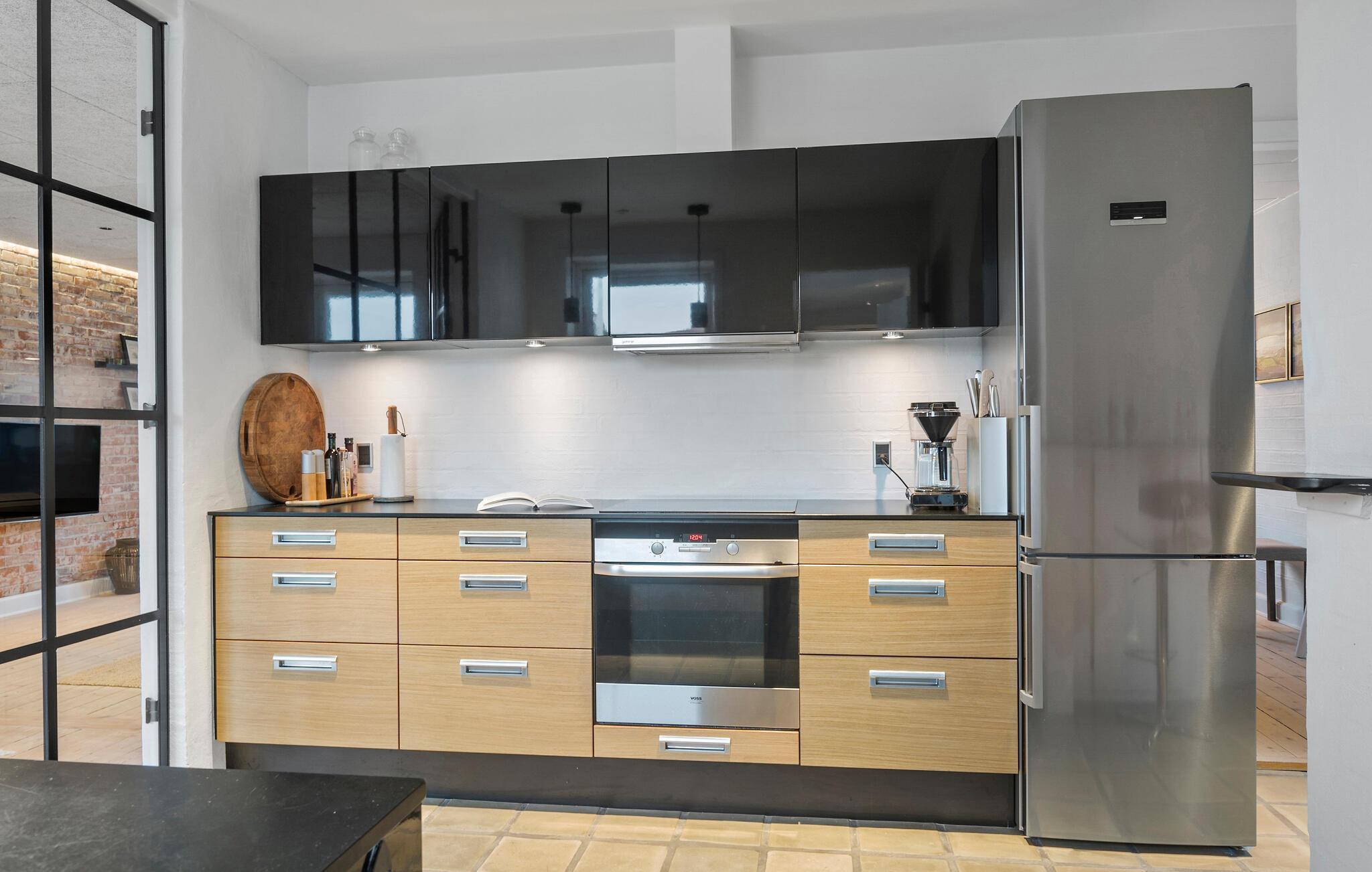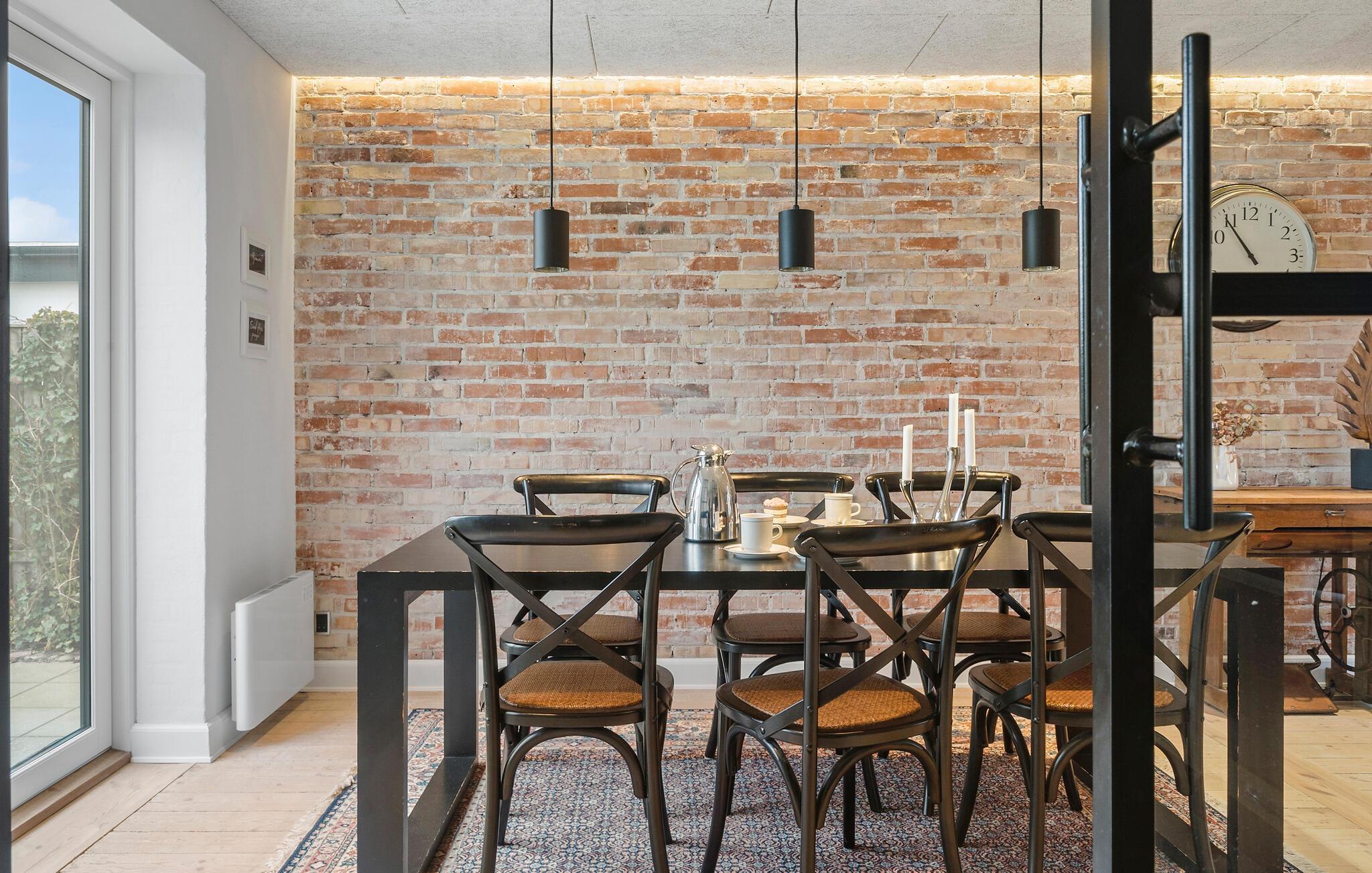 Erleben Sie eine erholsame Auszeit in diesem Ferienhaus in Thyborøn, das Ihnen Komfort und Gemütlichkeit in Strandnähe bietet. Das modern eingerichtete Haus, mit Platz für eine große Familie, besticht durch seine stilvolle Kombination aus skandinavischem Design und rustikalem Charme. Freuen Sie sich auf einen großzügigen Wohnbereich mit einer gemütlichen Sofaecke, einer offenen Ziegelwand und liebevoll ausgewählten Dekorationen. Nutzen Sie die hochwertige Küche mit modernen Geräten und ausreichend Arbeitsfläche, um kulinarische Highlights zu zaubern. Der Essbereich mit viel Tageslicht lädt zu langen Mahlzeiten mit der Familie ein.