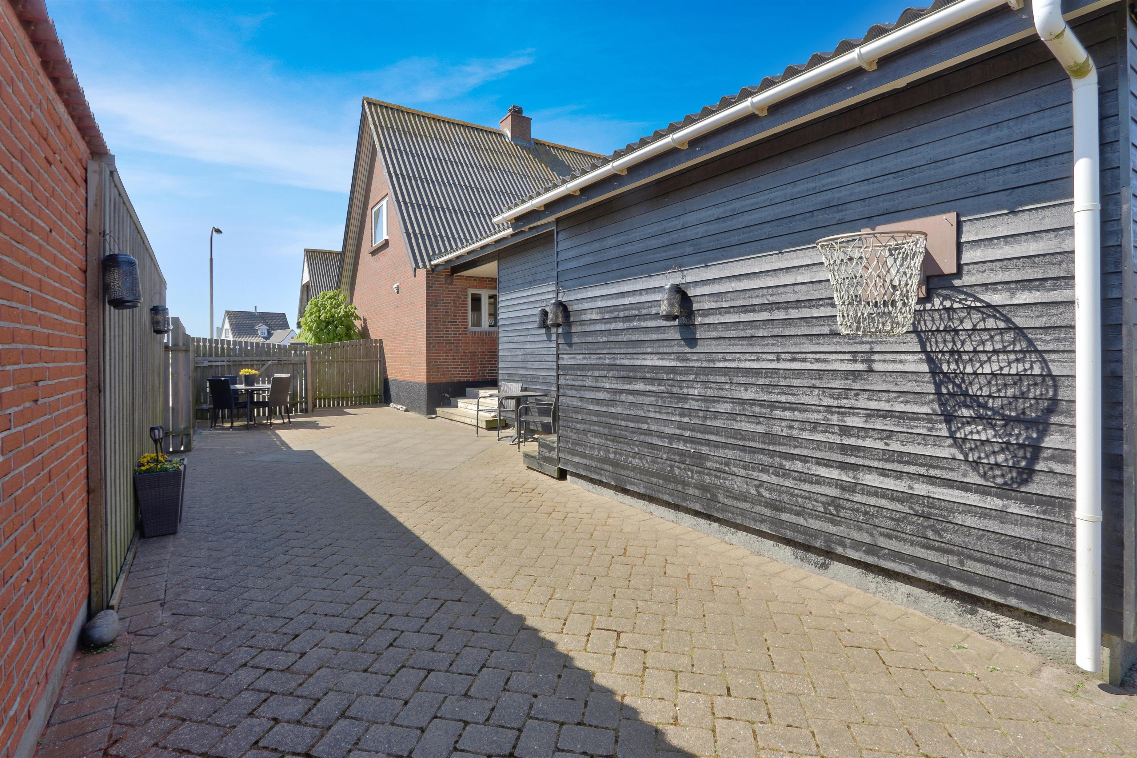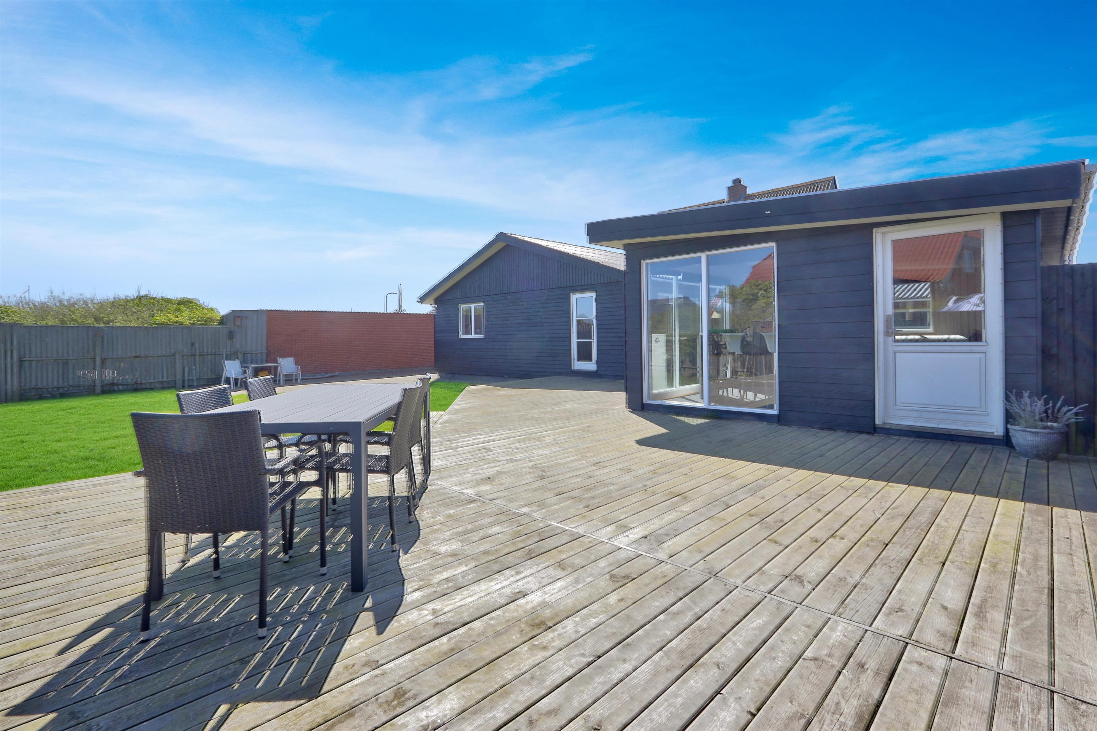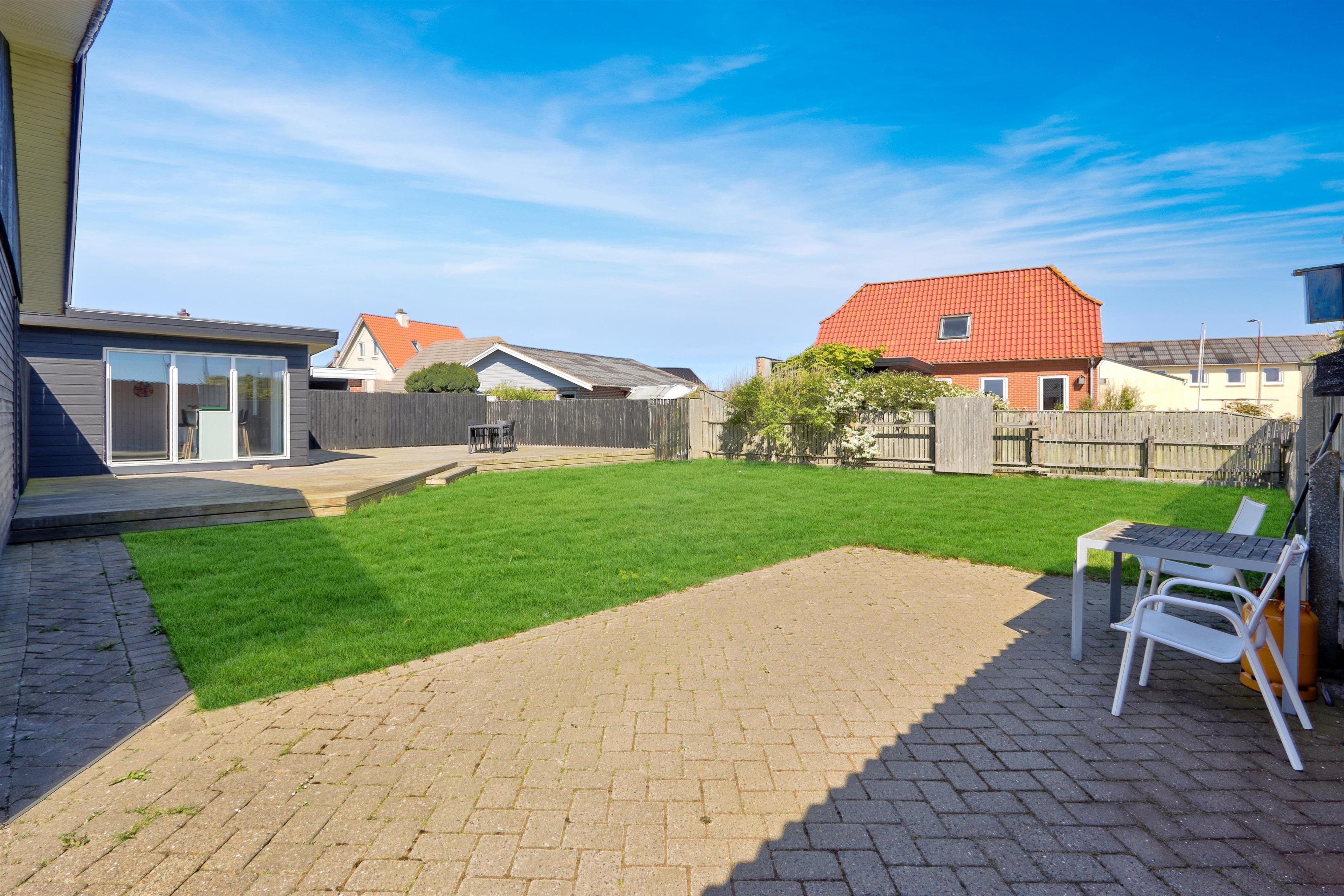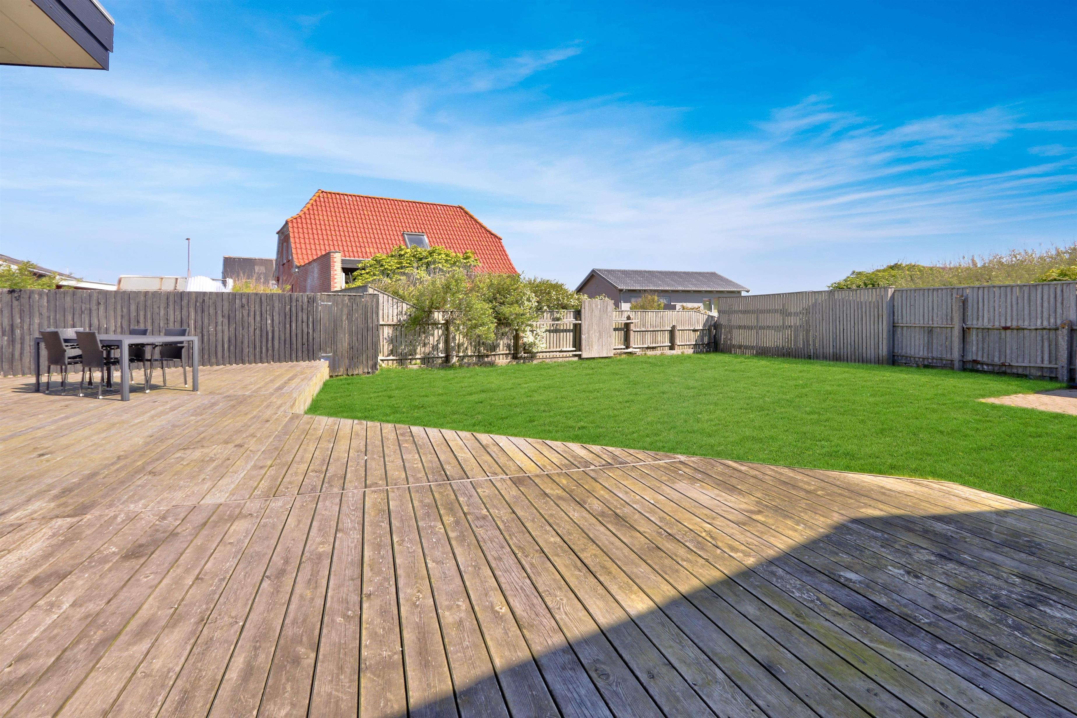 Draußen erwartet Sie ein eingezäunter, privater Garten mit 757 m² Fläche, ideal für Spiel, Entspannung oder Mahlzeiten im Freien. Der helle Wintergarten verlängert die Outdoor-Saison und ermöglicht es Ihnen, den Garten auch bei Wind oder an kühleren Tagen zu genießen. Gartenmöbel und ein Grill stehen selbstverständlich zur Verfügung. Freier Zutritt zur Værket in Thyborøn.