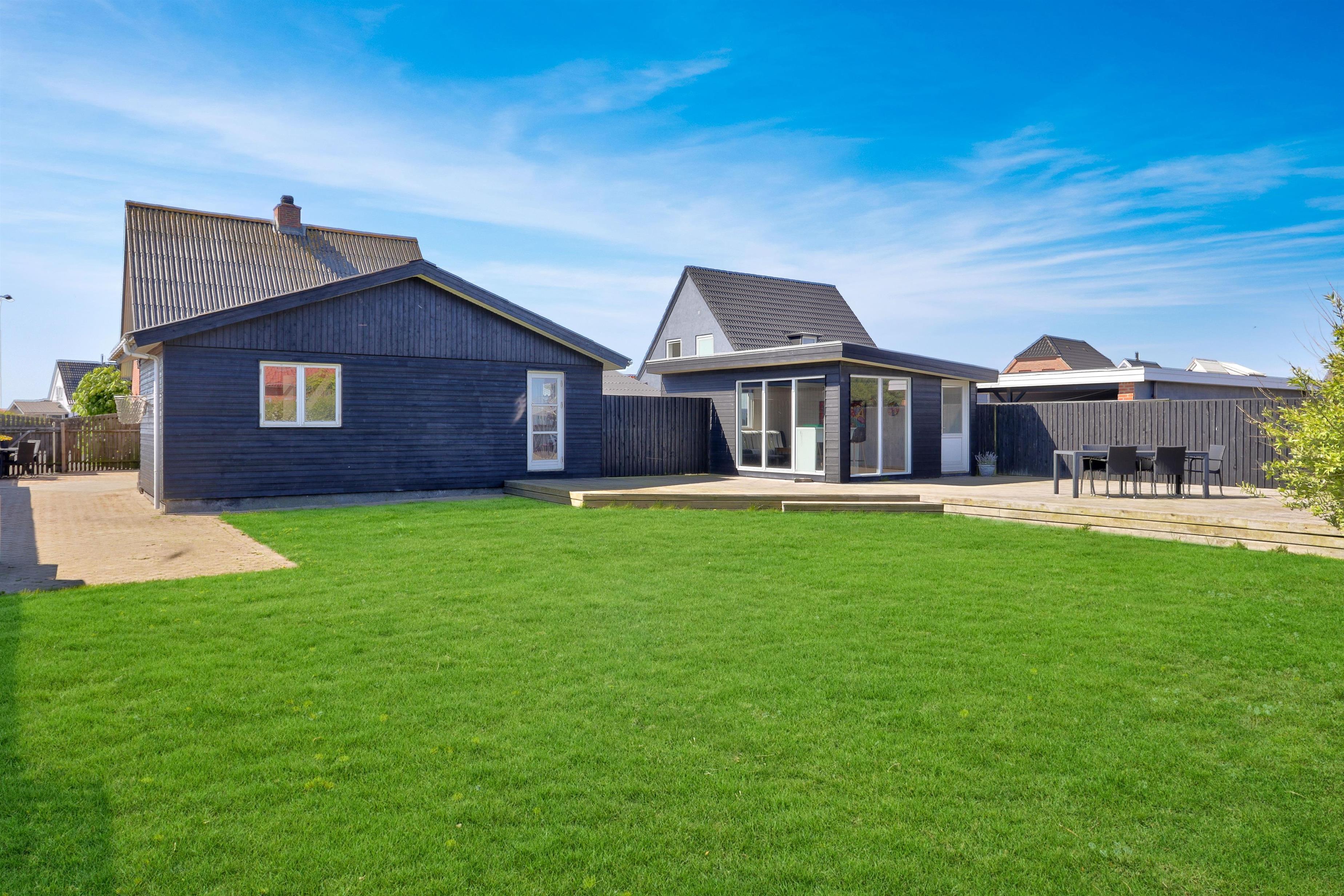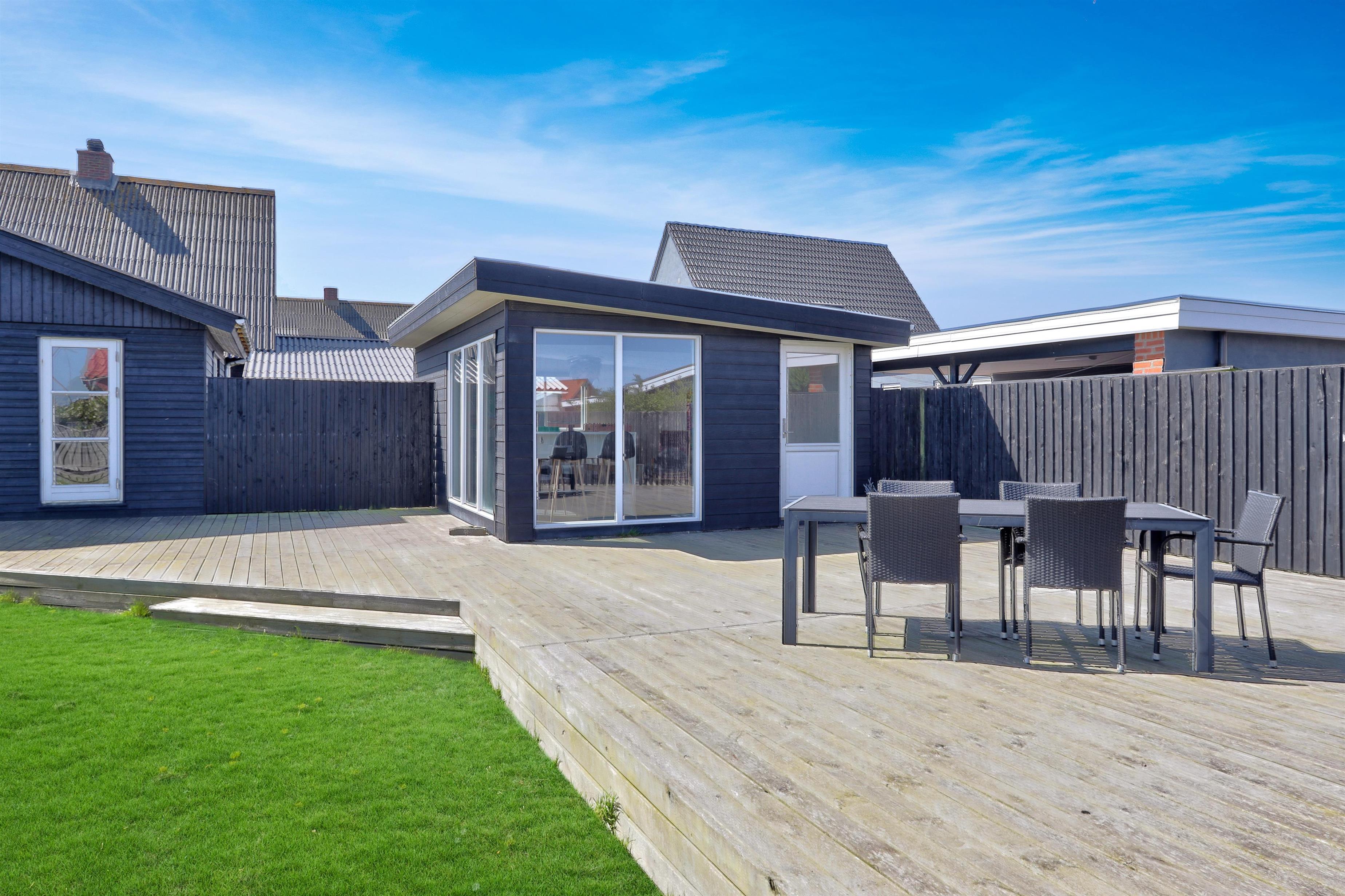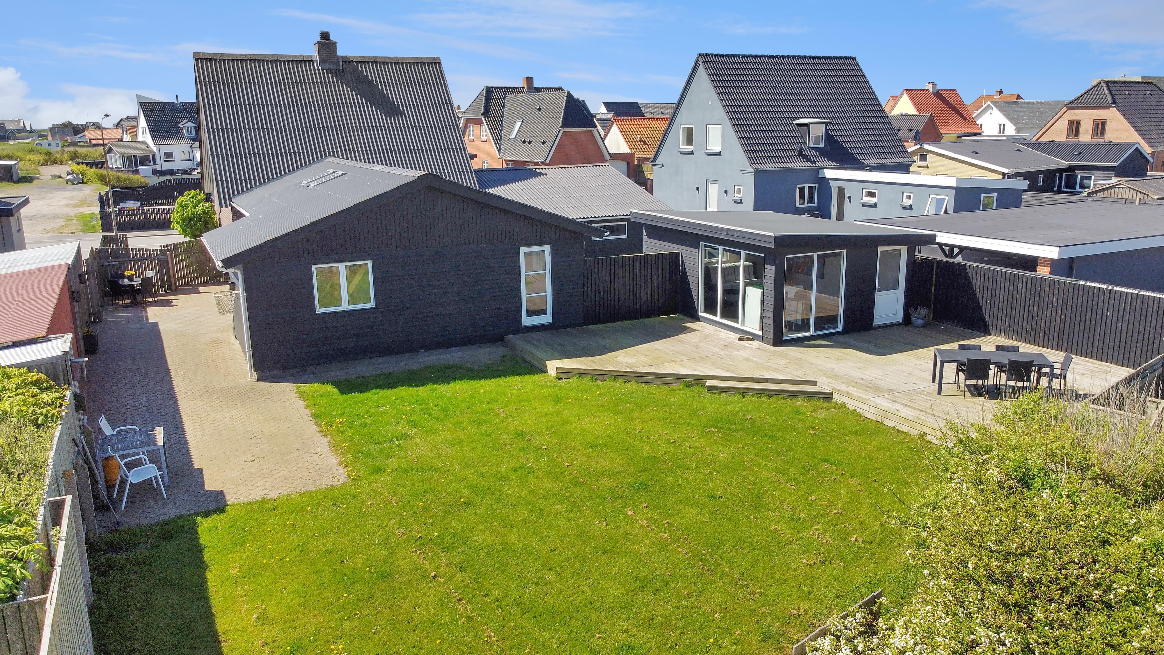 Draußen erwartet Sie ein eingezäunter, privater Garten mit 757 m² Fläche, ideal für Spiel, Entspannung oder Mahlzeiten im Freien. Der helle Wintergarten verlängert die Outdoor-Saison und ermöglicht es Ihnen, den Garten auch bei Wind oder an kühleren Tagen zu genießen. Gartenmöbel und ein Grill stehen selbstverständlich zur Verfügung. Freier Zutritt zur Værket in Thyborøn.