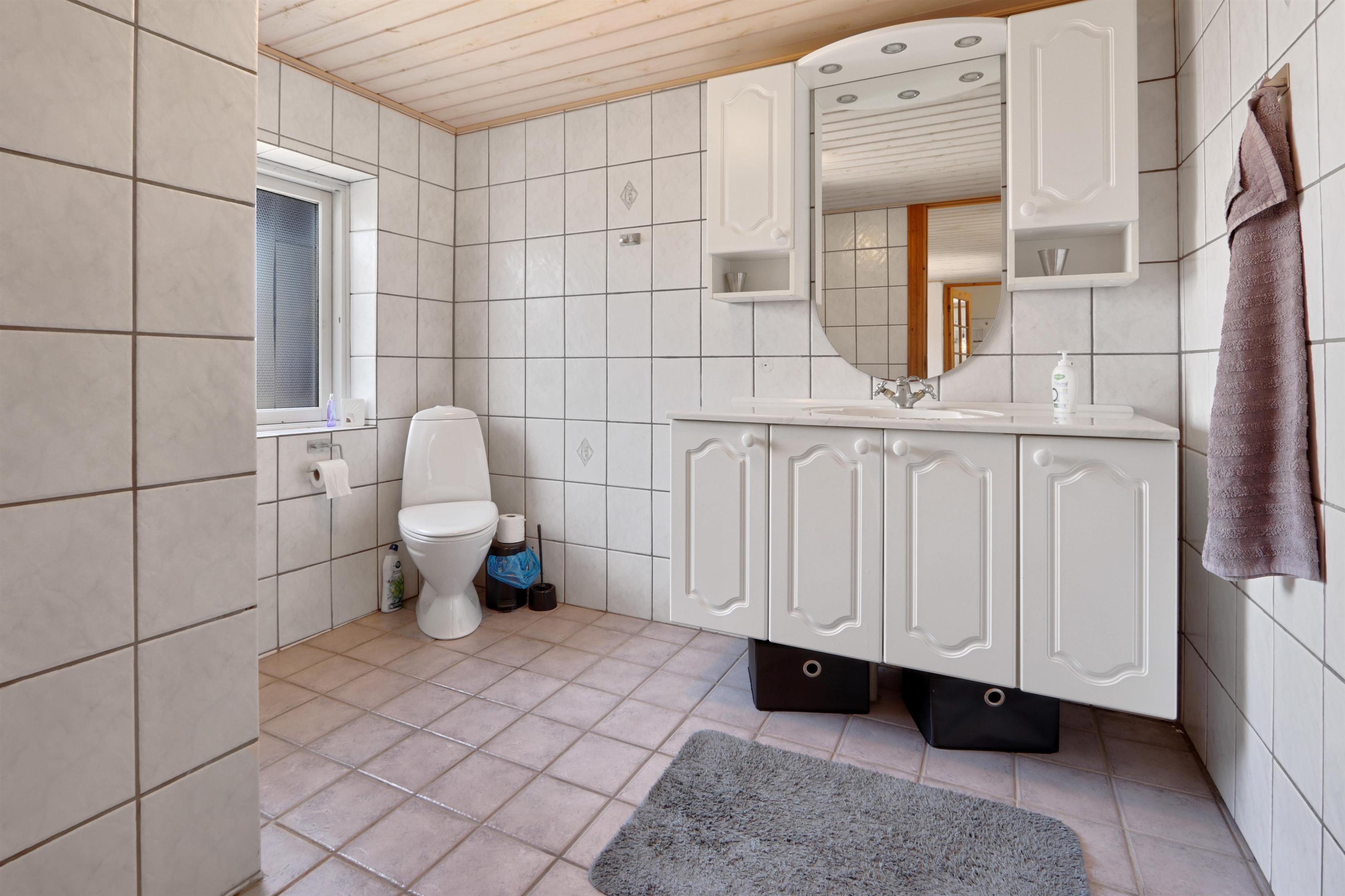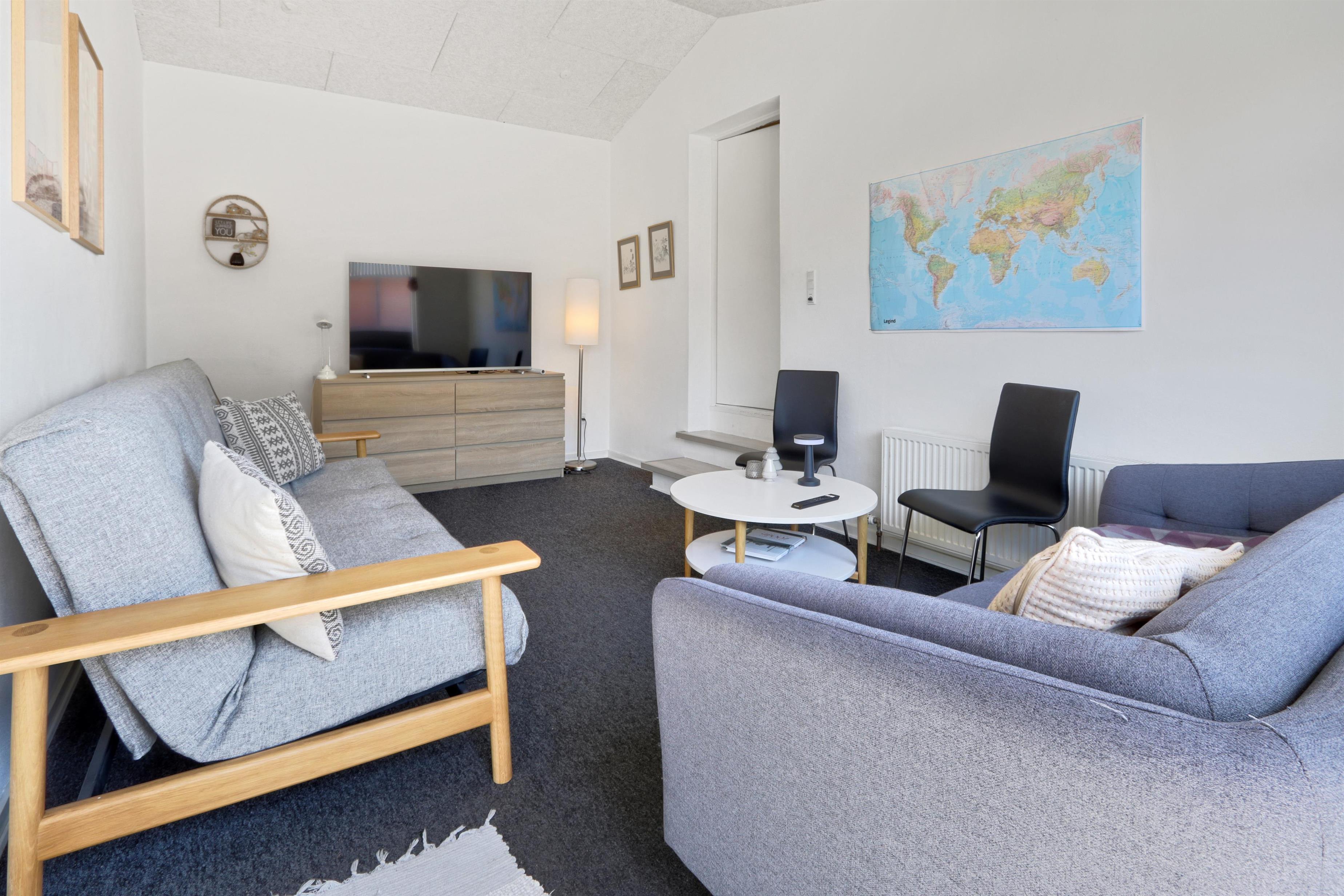 Es gibt ein Badezimmer mit Dusche, WC und Waschbecken sowie ein zusätzliches Gäste-WC. Für die kleinsten Gäste steht ein Kinderbett bereit. Im Eingangsbereich befinden sich eine Waschmaschine, ein Trockner, ein Spülbecken sowie zusätzliche Arbeitsfläche. Außerdem bietet das Haus ein zweites Wohnzimmer mit bequemen Polstermöbeln und einem weiteren Fernseher.