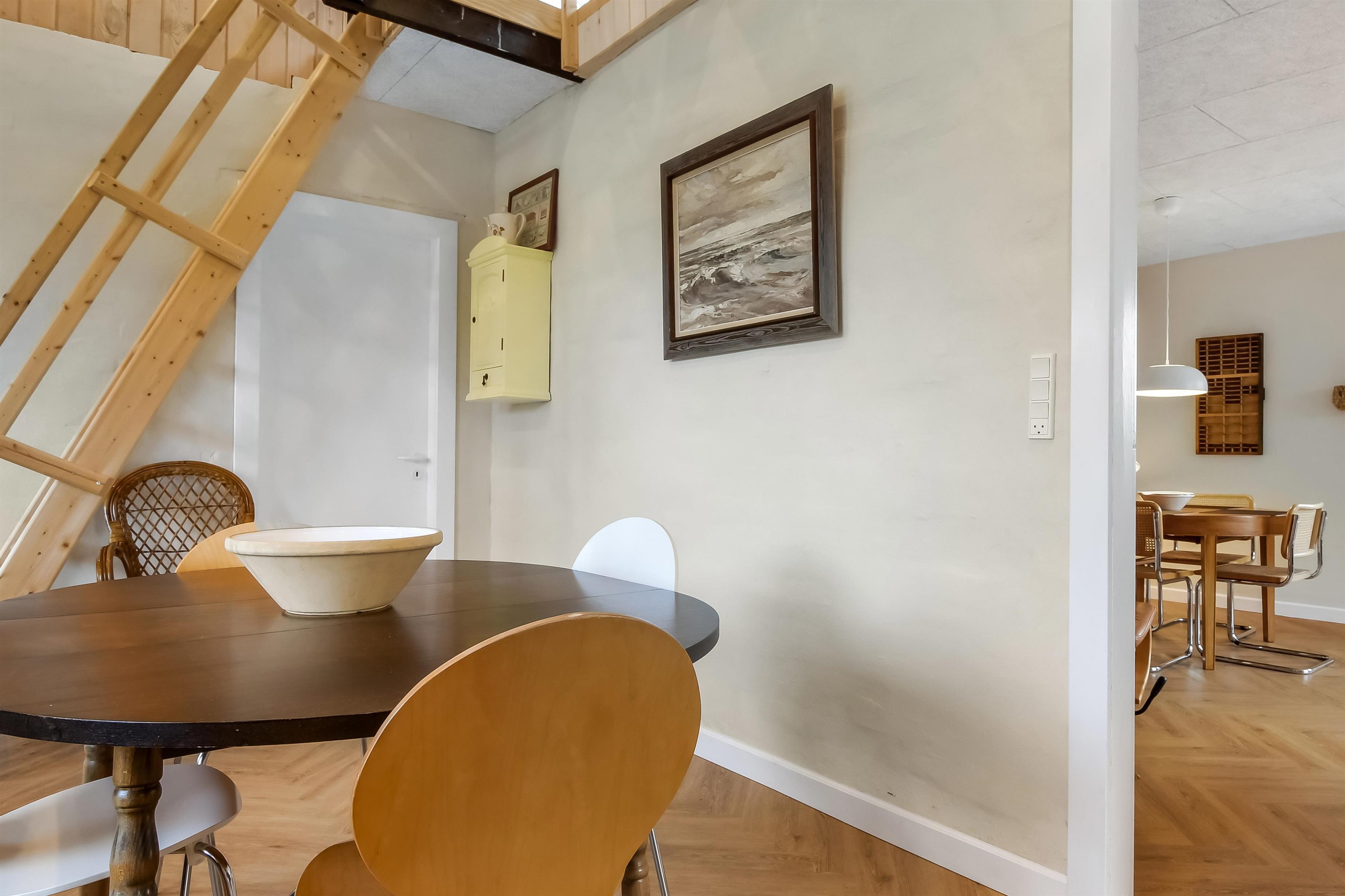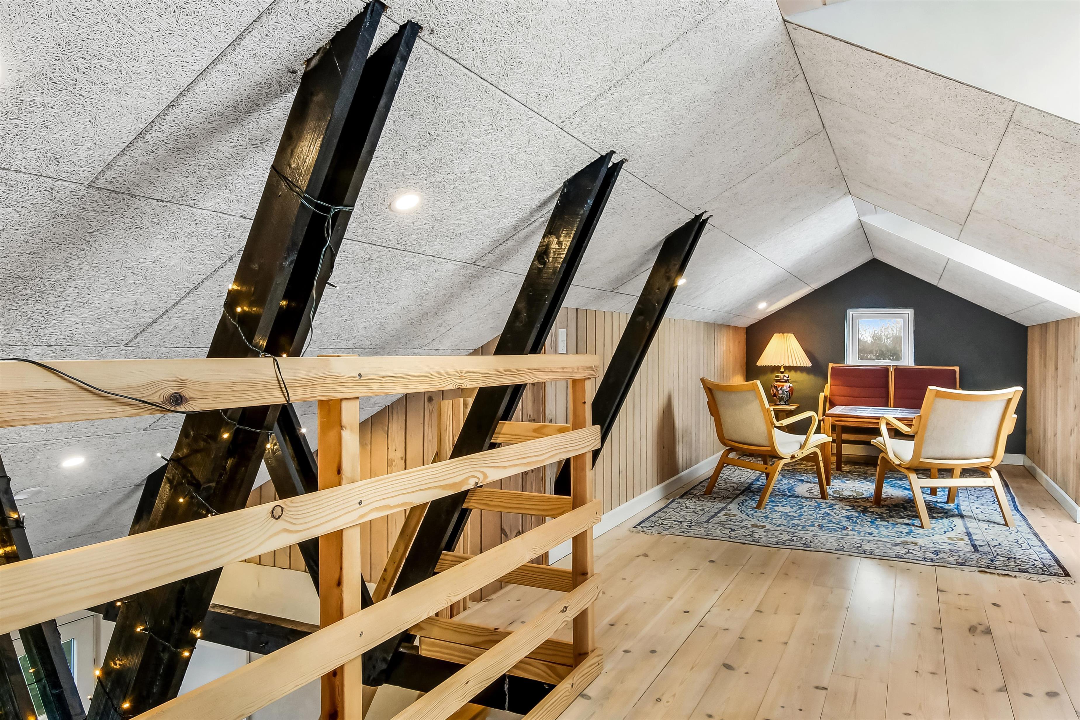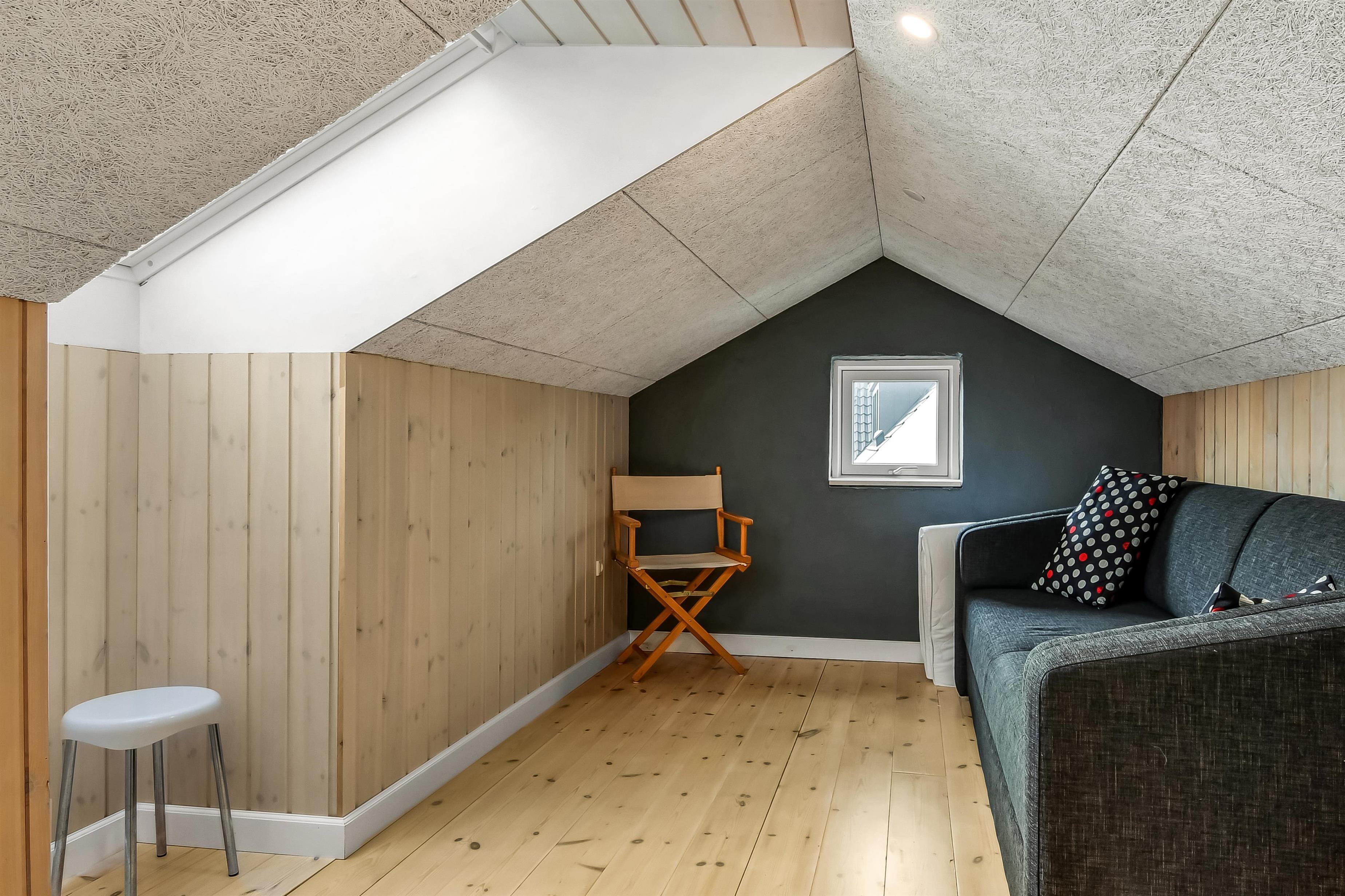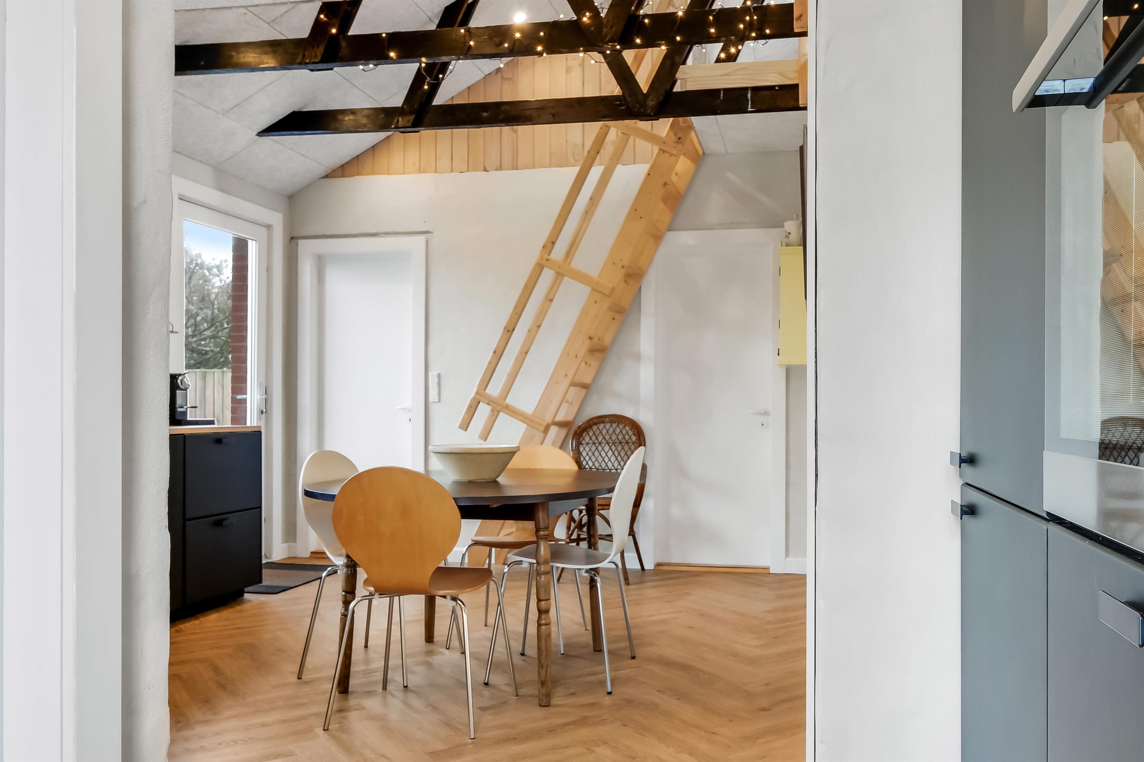 Die Einrichtung des Hauses verfügt über einen praktischen Flur mit Waschmaschine und extra Ablageplatz. Die Küche ist neu und der Esstisch steht an der Küche, damit es einfach ist, das Essen zum Tisch zu bringen. Die Küche hat einen Herd mit Induktionskochplatte, eingebauten Ofen, Kühlschrank und ein Gefrierschrank mit 150 l, Geschirrspüler, Airfryer und Fußbodenheizung. In der Küche können Sie die Balken an der Decke sehen. Schöner Wohnraum mit Holzboden, Ledermöbeln, TV mit Parabol-Antenne und deutschen und dänischen Programmen, Chromecast mit der Möglichkeit für Streaming von eigenen Programmen, für die Sie selber ein Abonnement haben. Im Wohnraum gibt es auch eine Fußbodenheizung. 2 Schlafräume: 2B + 1DB und ein offener Schlafboden mit 2 Schlafmöglichkeiten. Von der Küche geht es über eine steile Treppe zum 1. Stock. Schönes Badezimmer mit Toilette, Dusche, Waschbecken und Fußbodenheizung.