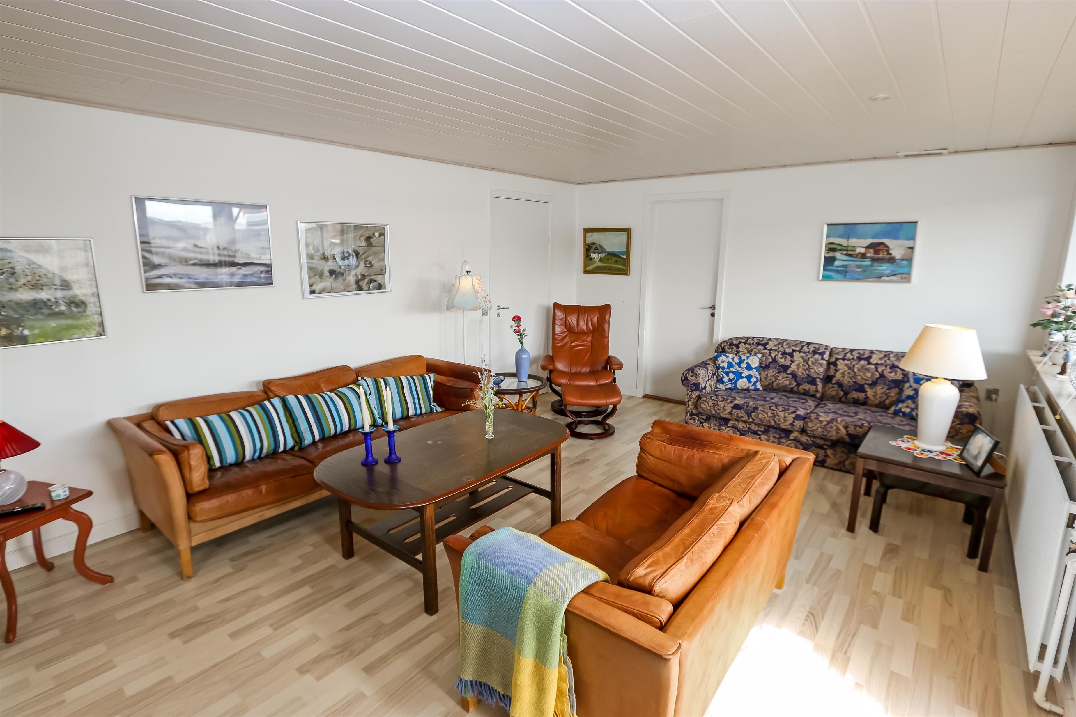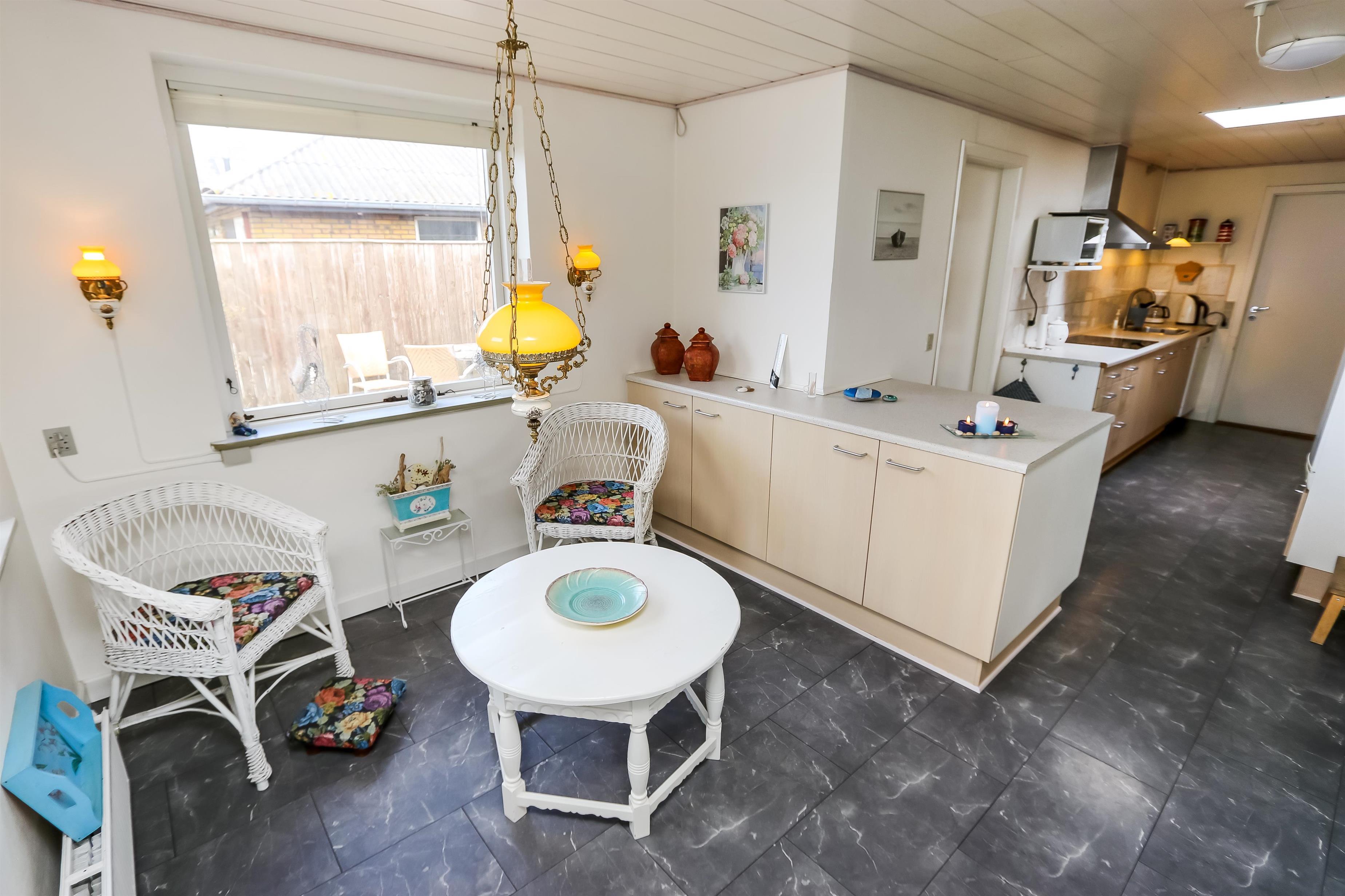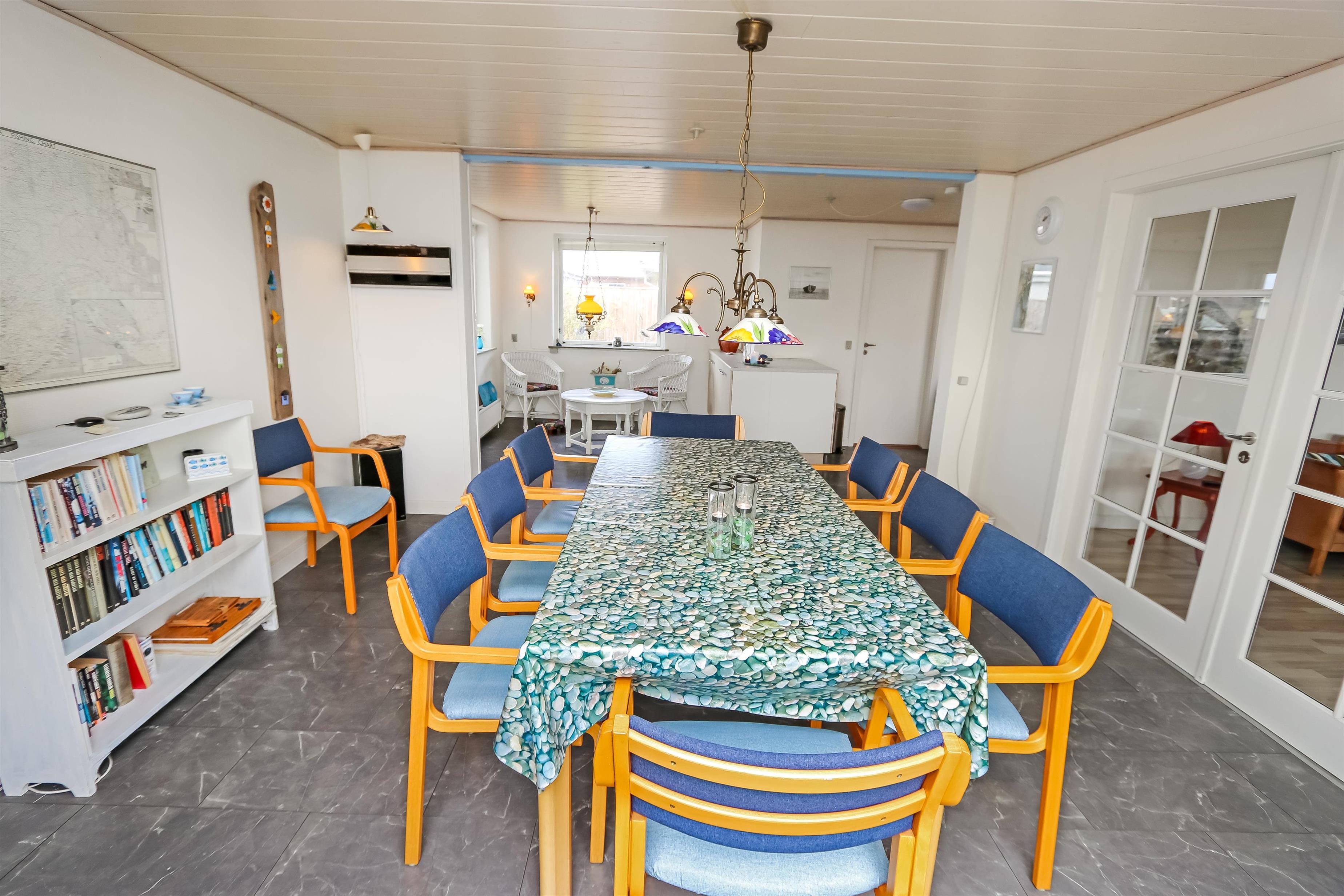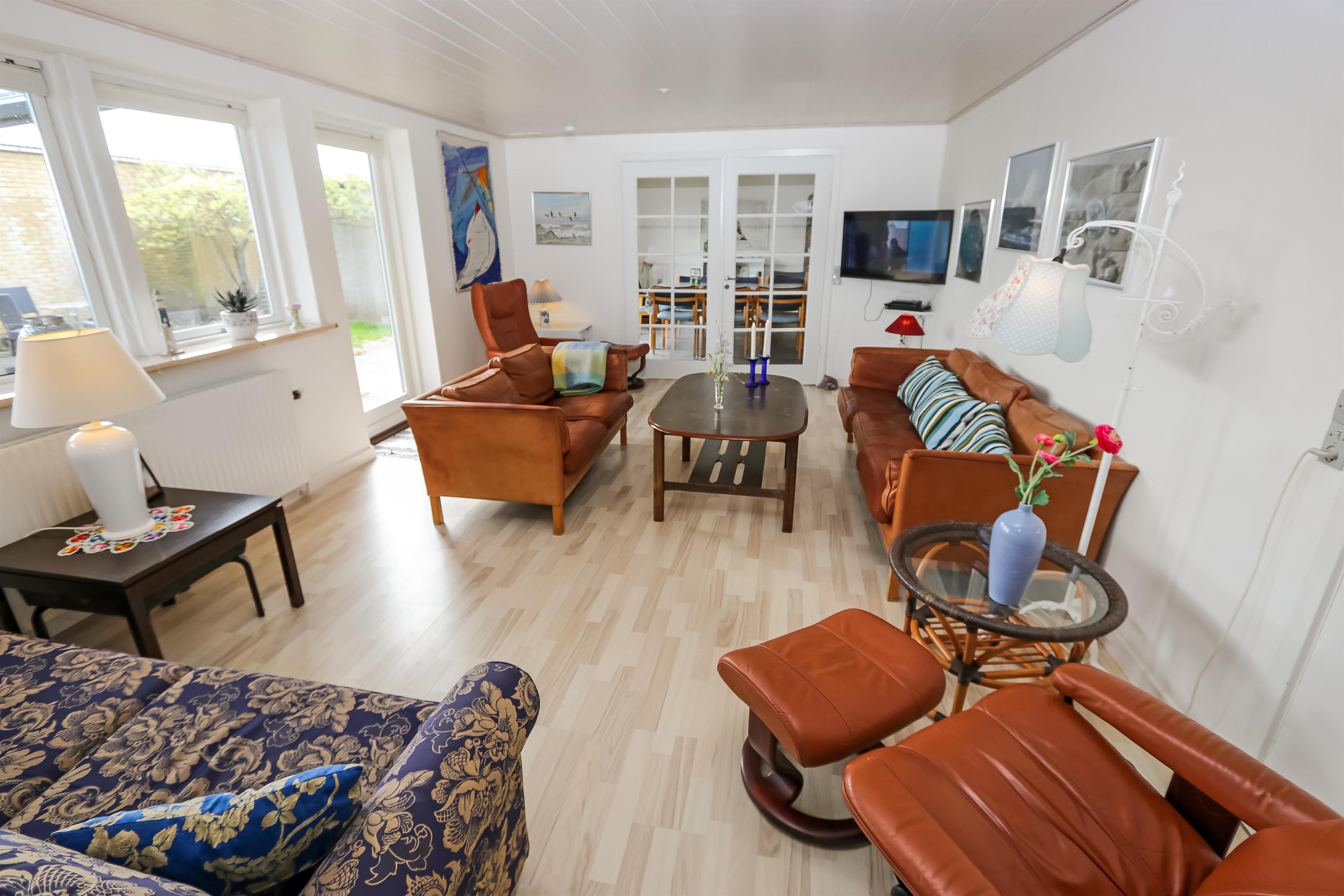 Großes und geräumiges Ferienhaus aus Holz/Stein auf einem Naturgrundstück in Thyborøn, dicht an Einkauf, Restaurants, der Nordsee und dem Fischereihafen. Es gibt freies WLAN im Haus. Der Wohnraum ist mit Smart-TV mit dänischen und deutschen Programmen und auch der Möglichkeit für Streaming von TV / APPS / Radio für die Sie selber ein Abonnement haben. Der Wohnraum ist mit Polstermöbeln aus Leder eingerichtet. Das Esszimmer mit Esstisch und Stühlen ist dicht an der Küche platziert. Die große Küche ist mit Herd, Miniofen, Mikrowelle, Geschirrspüler, 100 l Gefriertruhe und Kühlschrank ausgestattet. Es gibt insgesamt 6 Schlafräume: 1DB + 1DB + 1DB + 1DB + 1E + 1 Schlafcouch. 2 Badezimmer, eines mit Toilette, Dusche, Waschbecken, Fliesenboden mit Fußbodenheizung und das andere mit Toilette, Waschbecken, Dusche, Badewanne, Fliesenboden mit Fußbodenheizung. Es gibt eine Waschmaschine und Trockner und 1 Kinderstuhl für die kleinsten Gäste. Nichtraucher-Haus. 2 Haustiere sind erlaubt. Aktivitätsraum mit Tischfußball.
